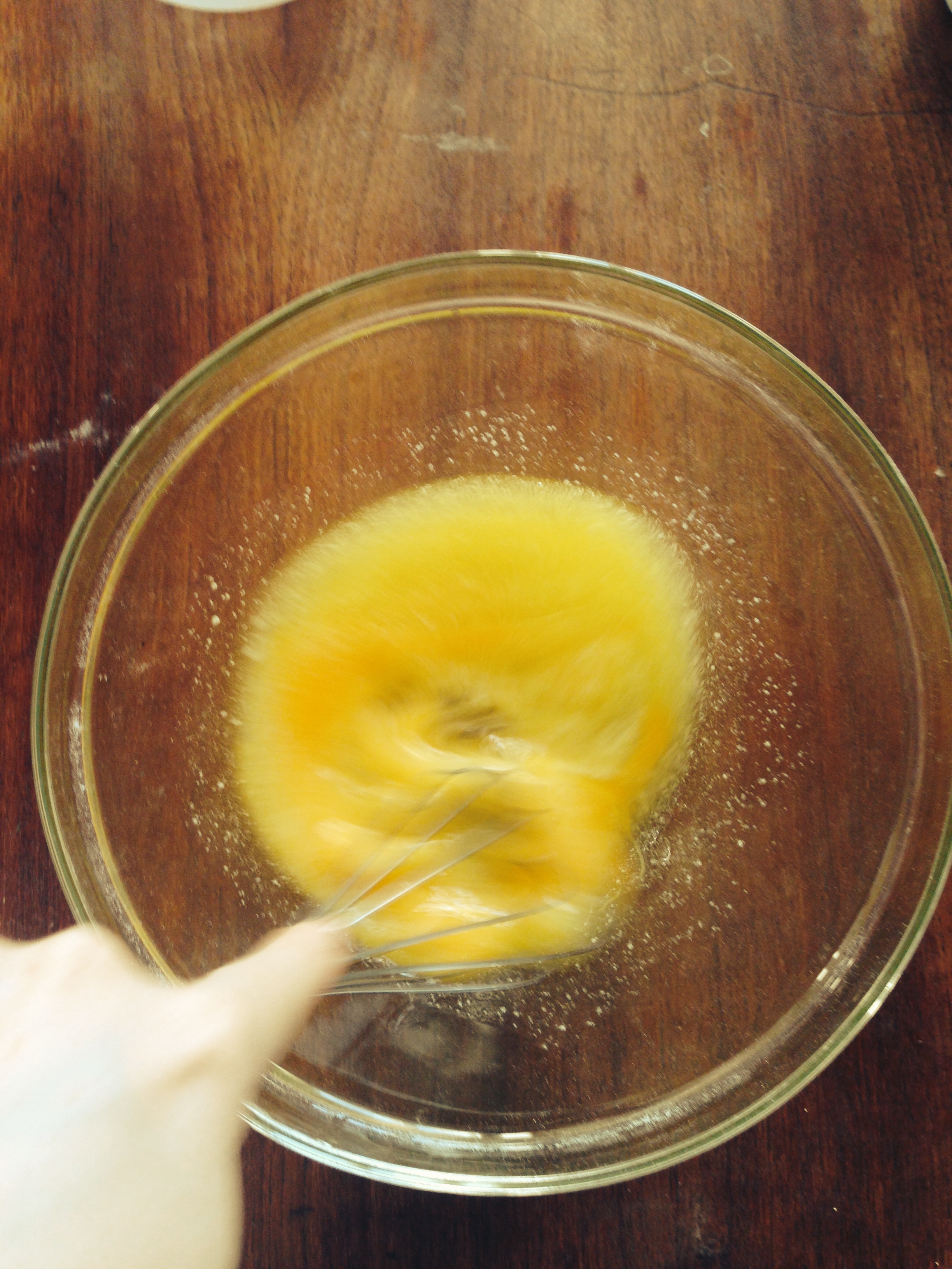 5. Add 2 eggs to melted butter and whisk until well combined.