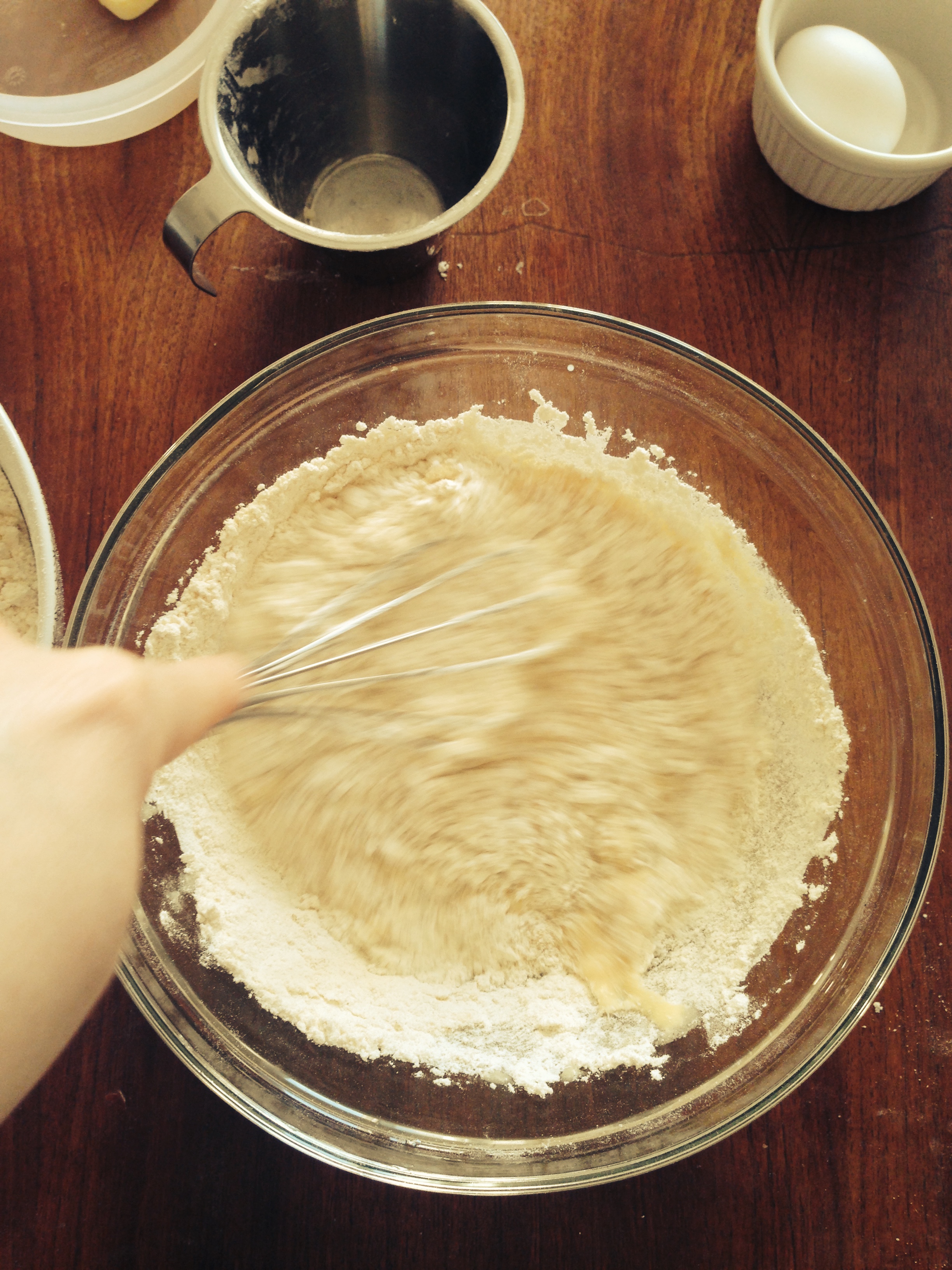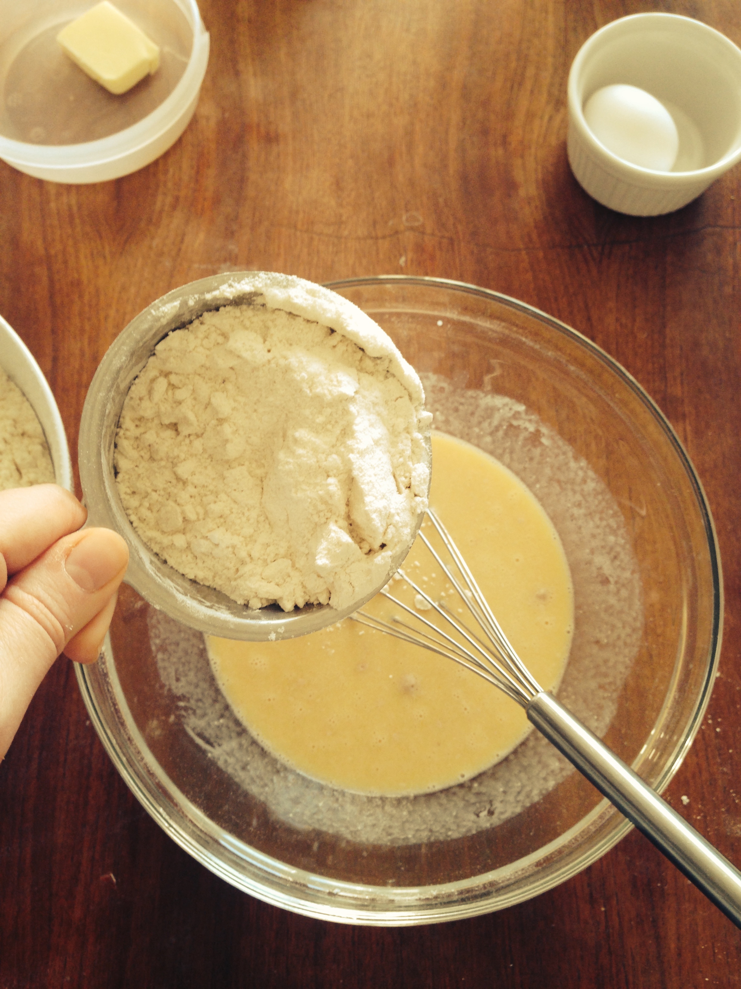 7. Add dry ingredients mixture gradually (about 1 cup / 2.4 dl a time). Keep whisking after adding each batch.