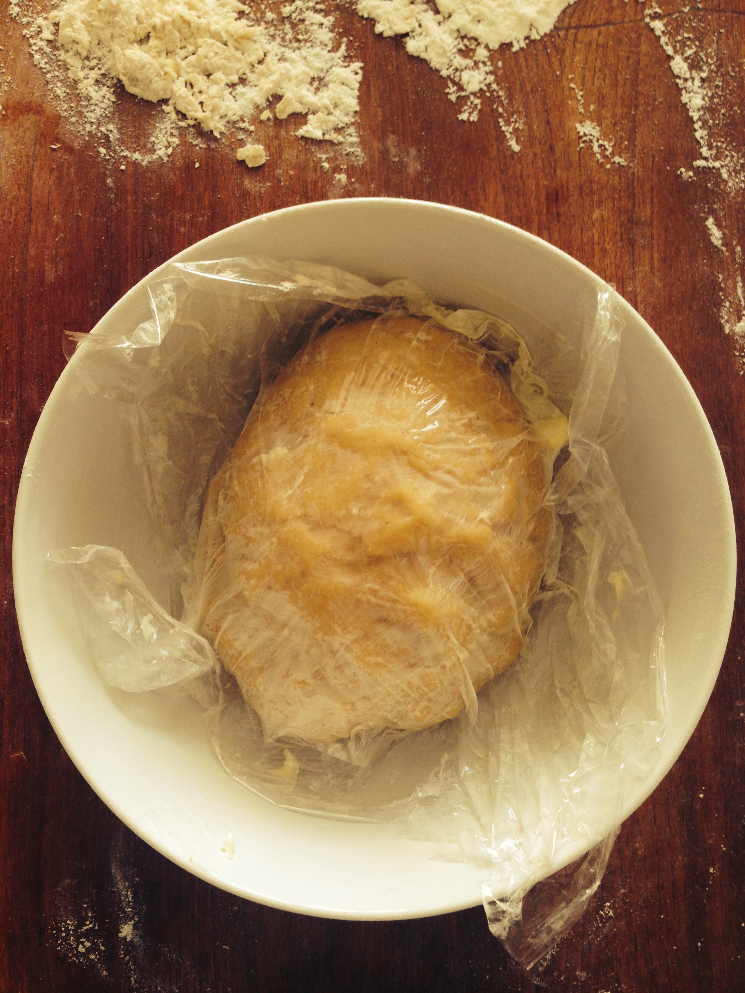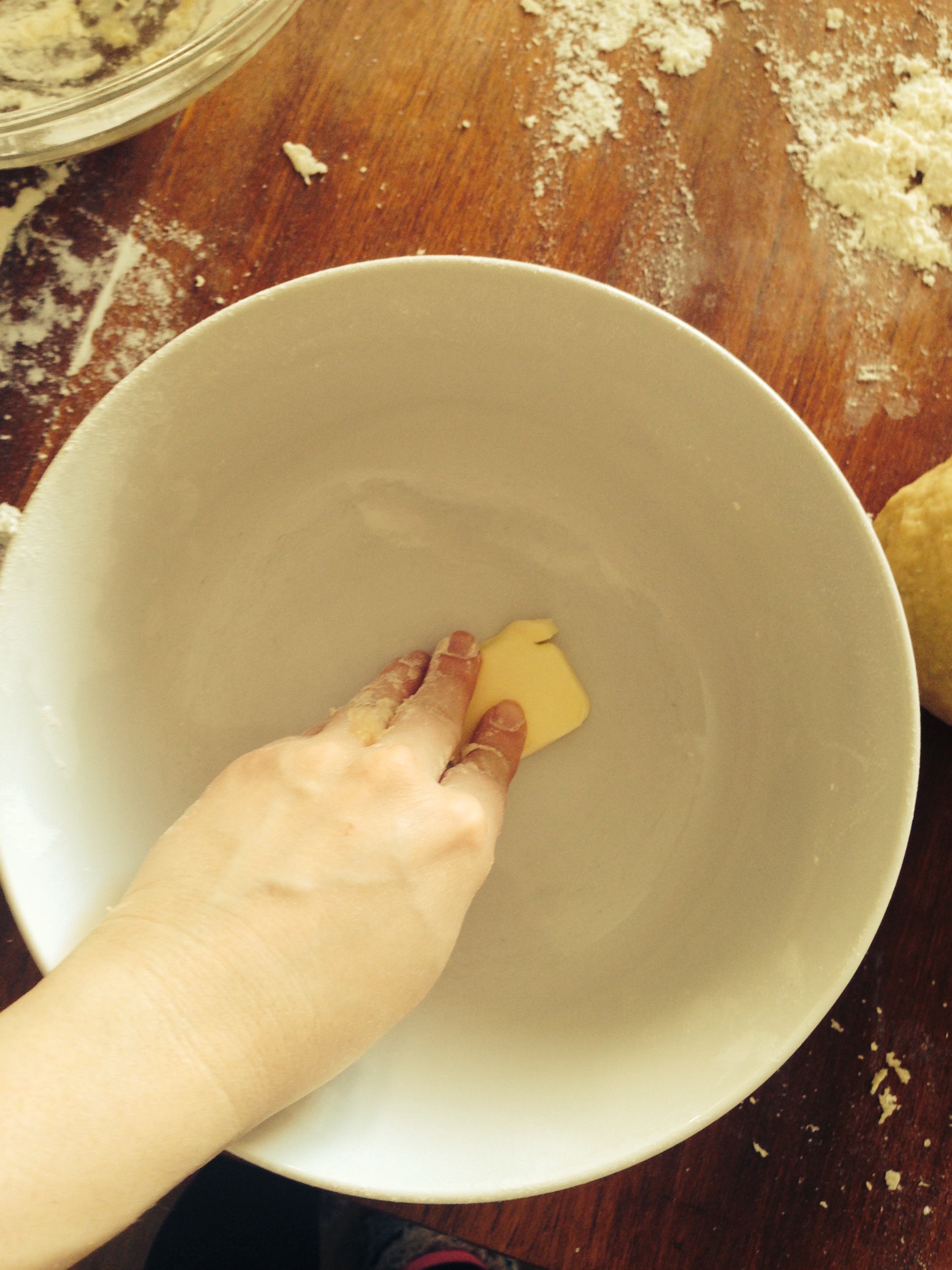 9. Use the remaining 15 gr of butter to grease your bowl and the inner surface of a stretch film. Put the dough in the greased bowl, cover with the stretch film (the buttered surface of the film must be touching the dough). Set aside, in a warm place, until the dough gets doubled in size.