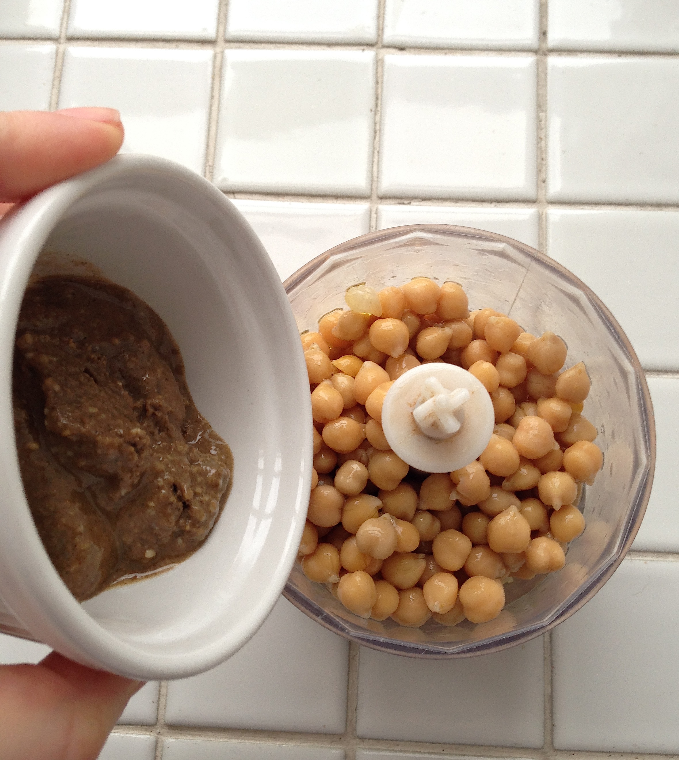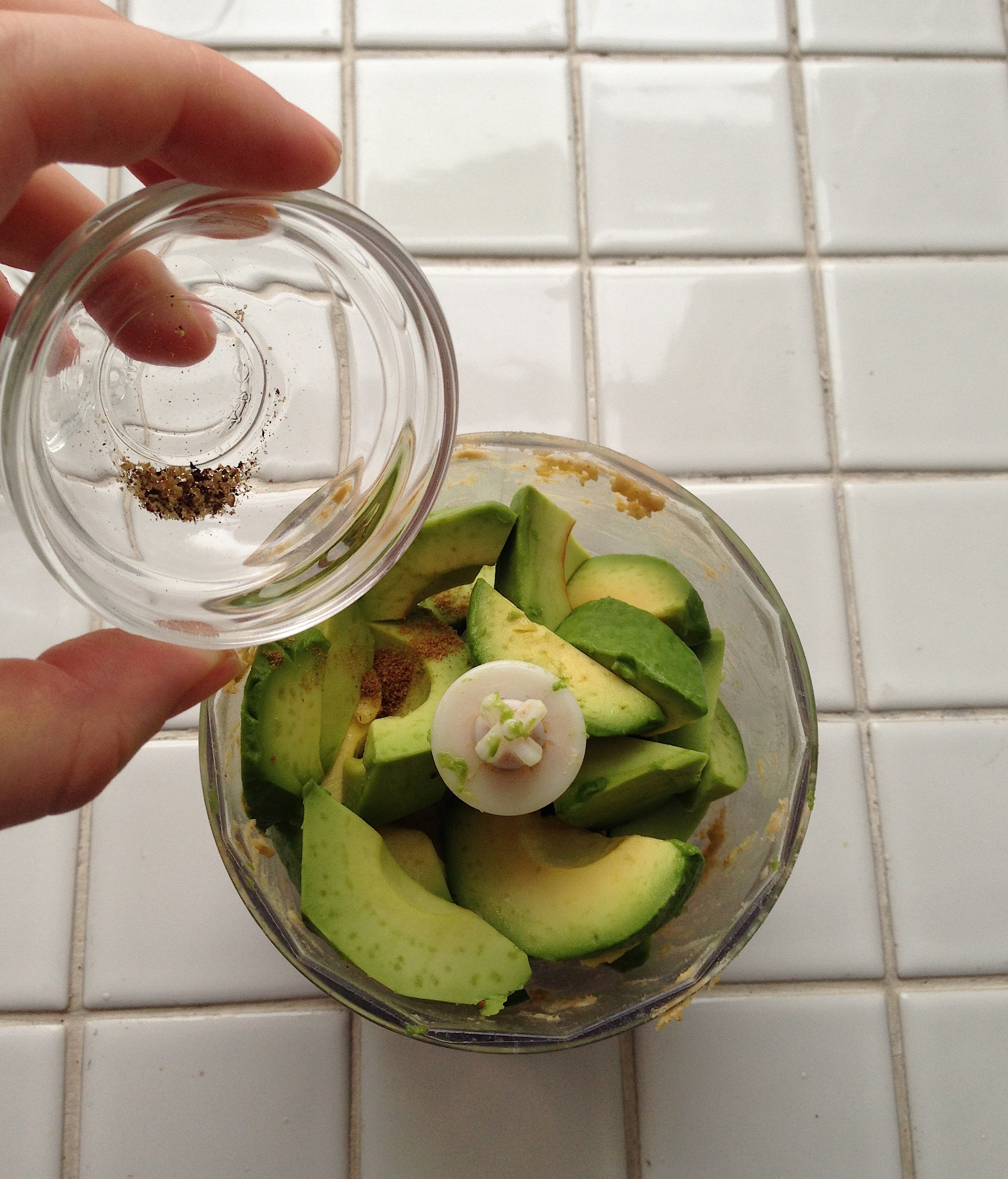 3. Process avocados (in the same processor as the chickpeas or in a second batch, if you have a very small gadget), together with cumin, black pepper and salt. I just put the chickpea mixture to another bowl and put the avocados in the same food processor; you don’t have to wash it unless you put something outrageous in the middle of the process!