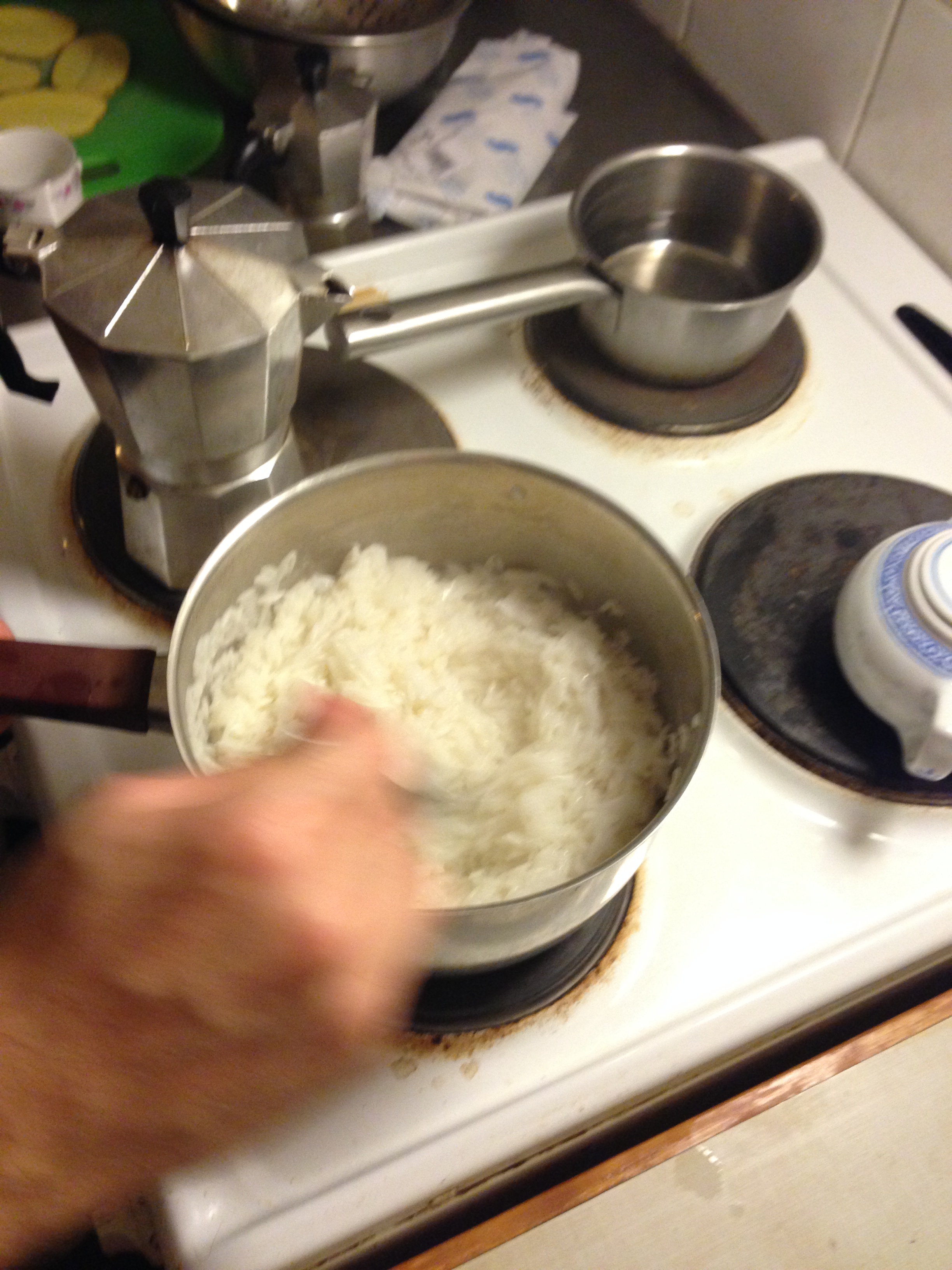 1. Wash rice 1-2 times with water. Put it in a pan, cover with water (the proportion of rice to water is 1 to 1.5). Add salt and a dash of olive oil and put it in high heat until the rice is partially cooked. When it is done, transfer rice on a strainer.