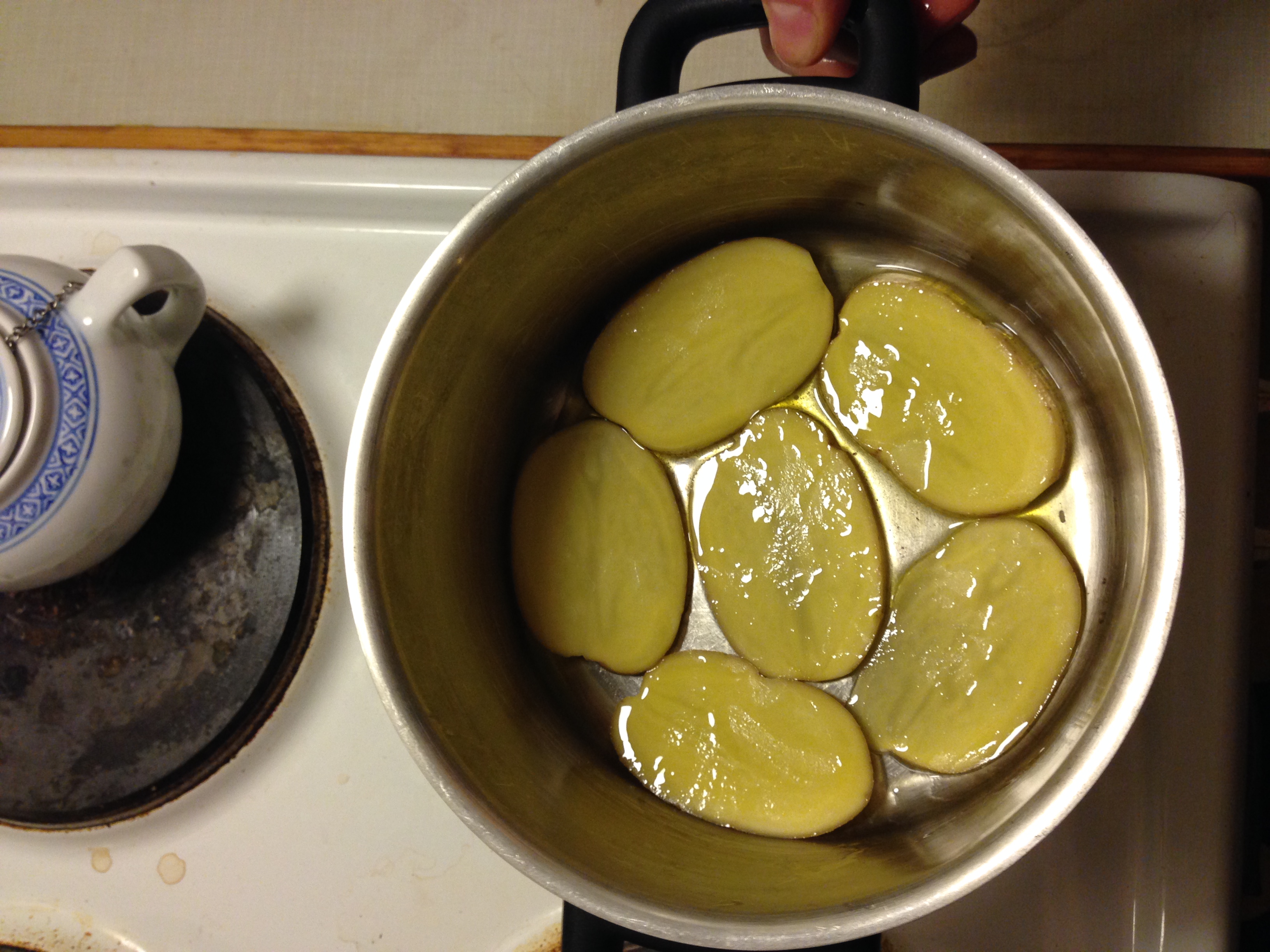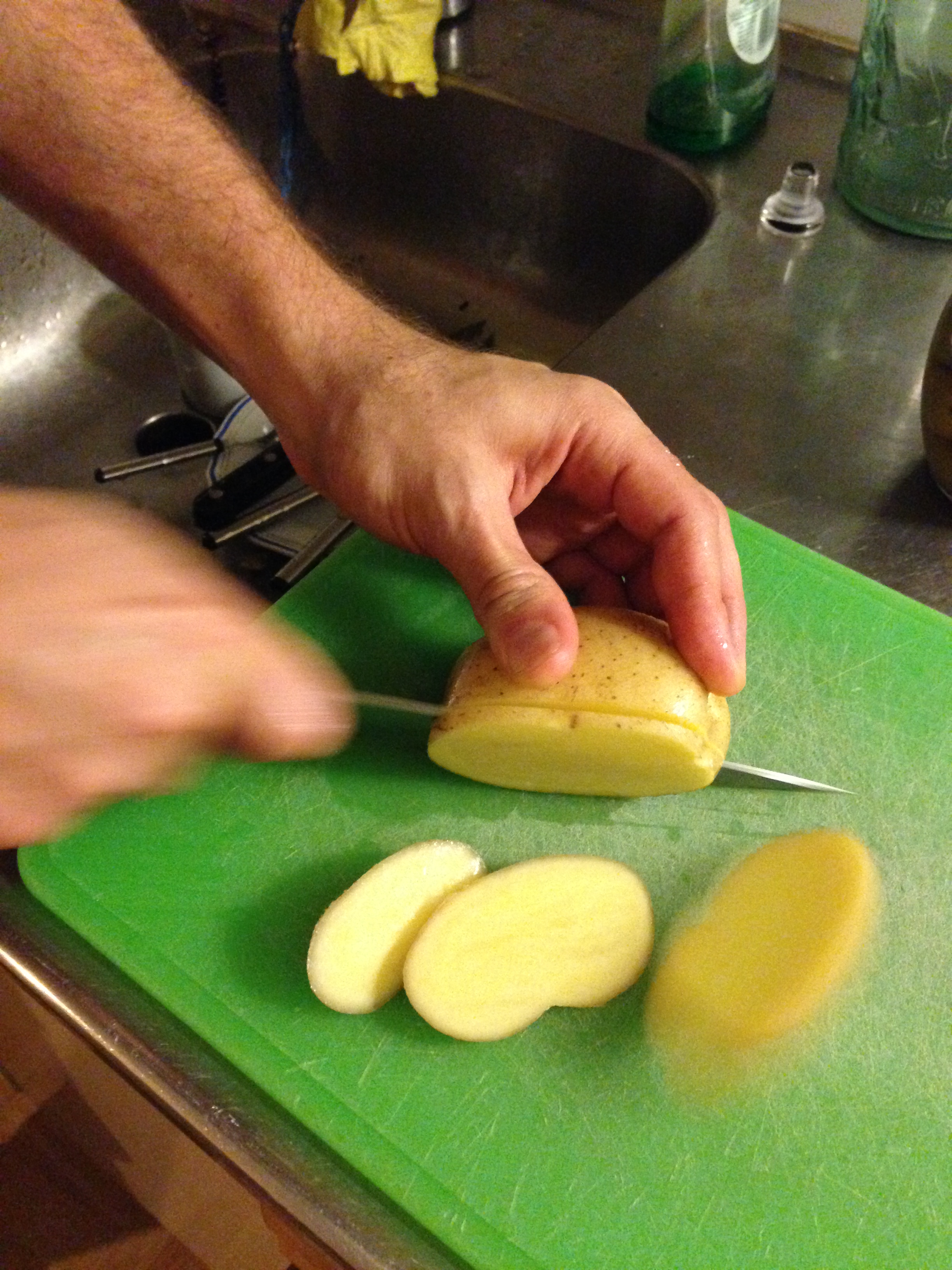 2. Cut potato in thin slices as seen in the picture (do not peel it). You should have enough slices to cover the pan you will use for cooking the rice – if you are using a big, shallow pan then you should have maybe 2 potatoes. In the bottom of your pan, pour a bit of olive oil to cover the base and then put potato slices as seen in the photo. Add a dash of olive oil on the potatoes.