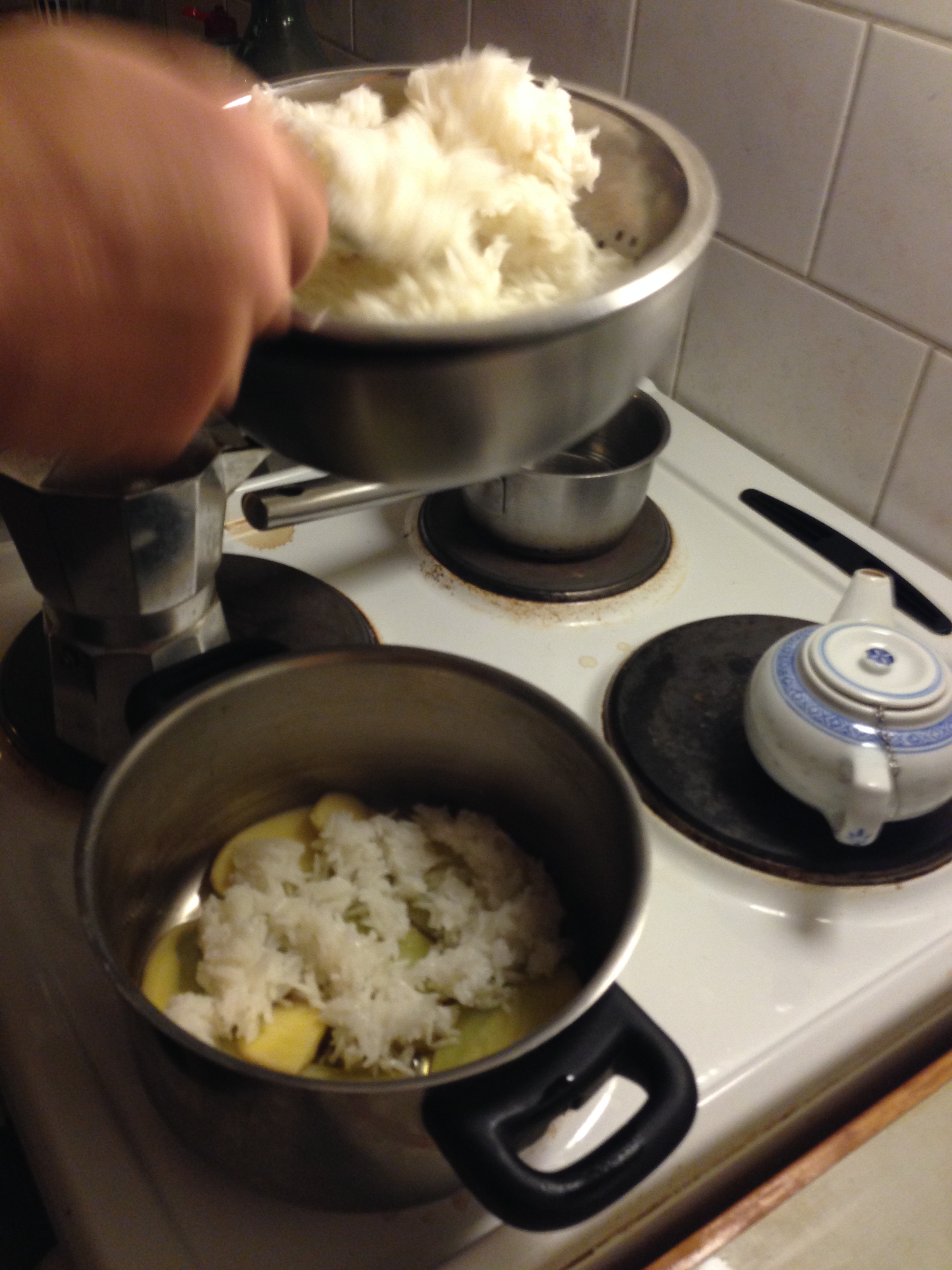 3. You will now put rice back in the pan, but you will do it in 3 batches. In between each, you will add 1 tsp / 5 ml olive oil on the rice.