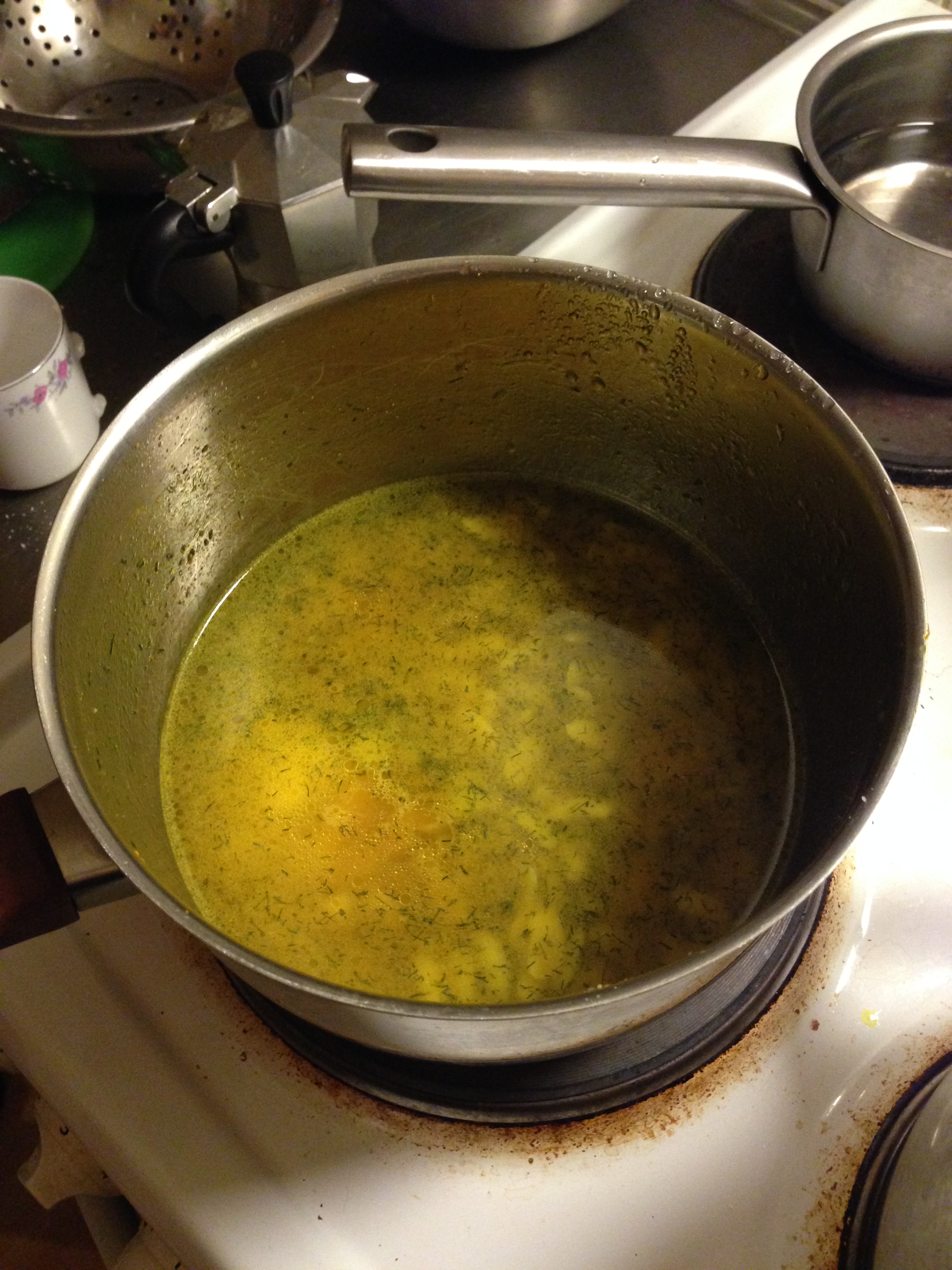6. Put the beans in a pan, add 1 tbsp / 15 ml olive oil, garlic cloves, salt, turmeric and dill. Cover all with water. Leave it on medium heat for 30 minutes.