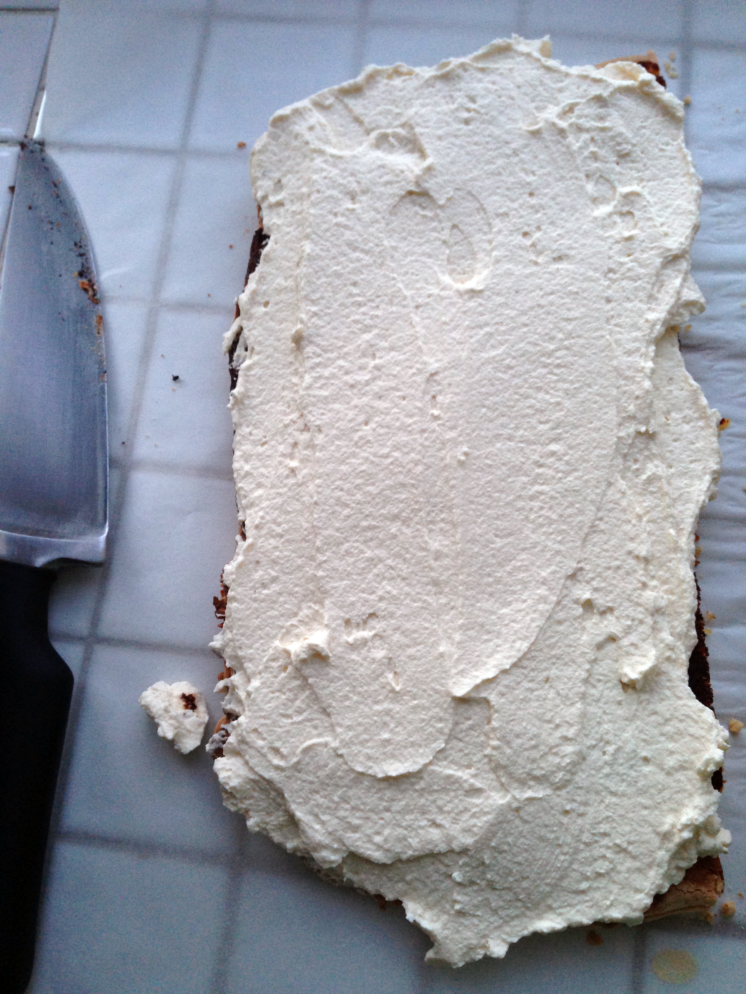 9. Spread the beaten egg whites on sponge cake fully covering the surface.