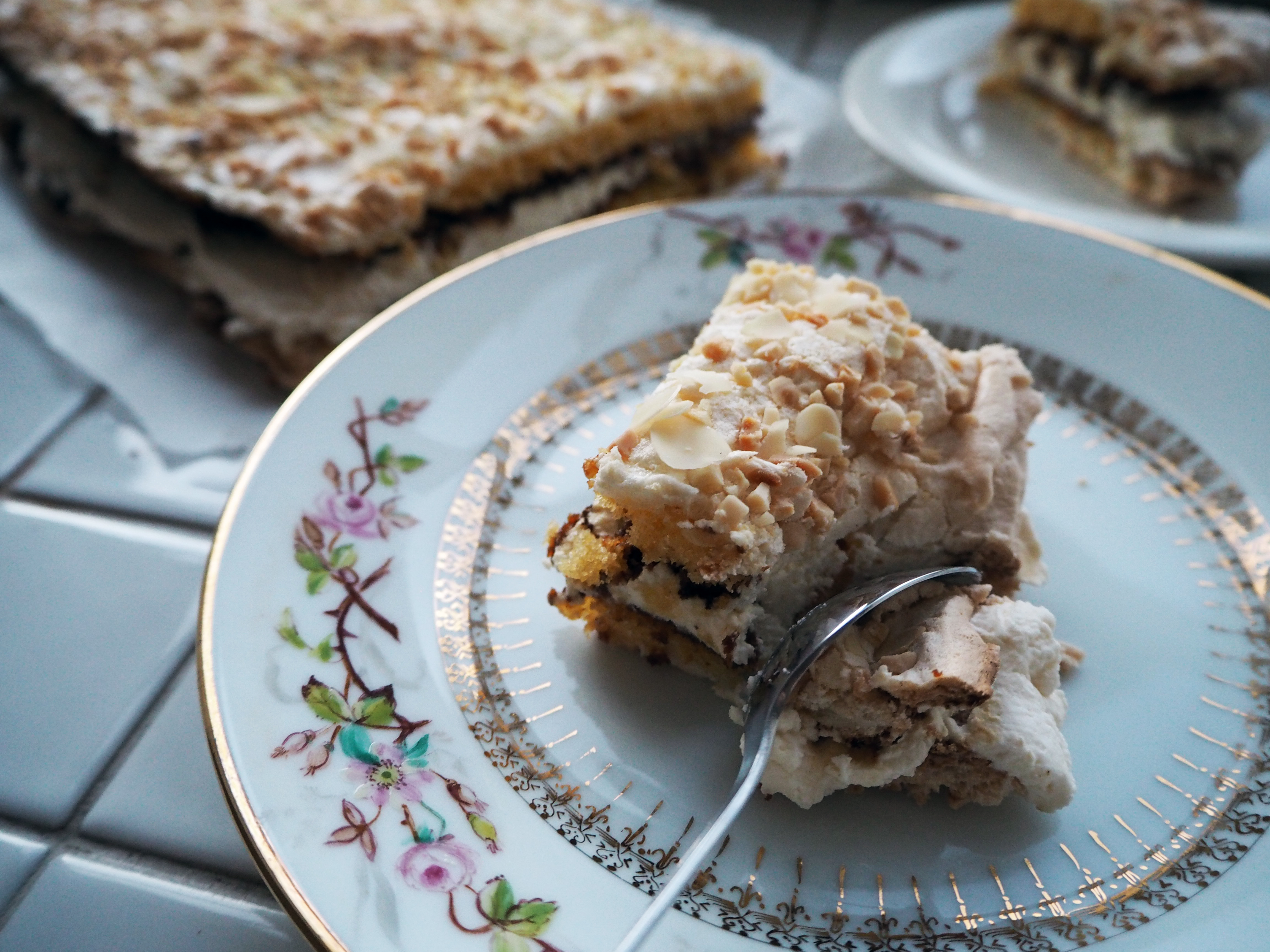 It is quite simple actually: prepare a basic sponge cake, top with meringue and almond pieces, bake altogether, cut in two and assemble with vanilla cream. The ingredients are really not that hard to find and aside from almonds, you probably have almost all of them at hand in your kitchen already (if you are an almond crazy person like me, you may also have that at hand at all times…).