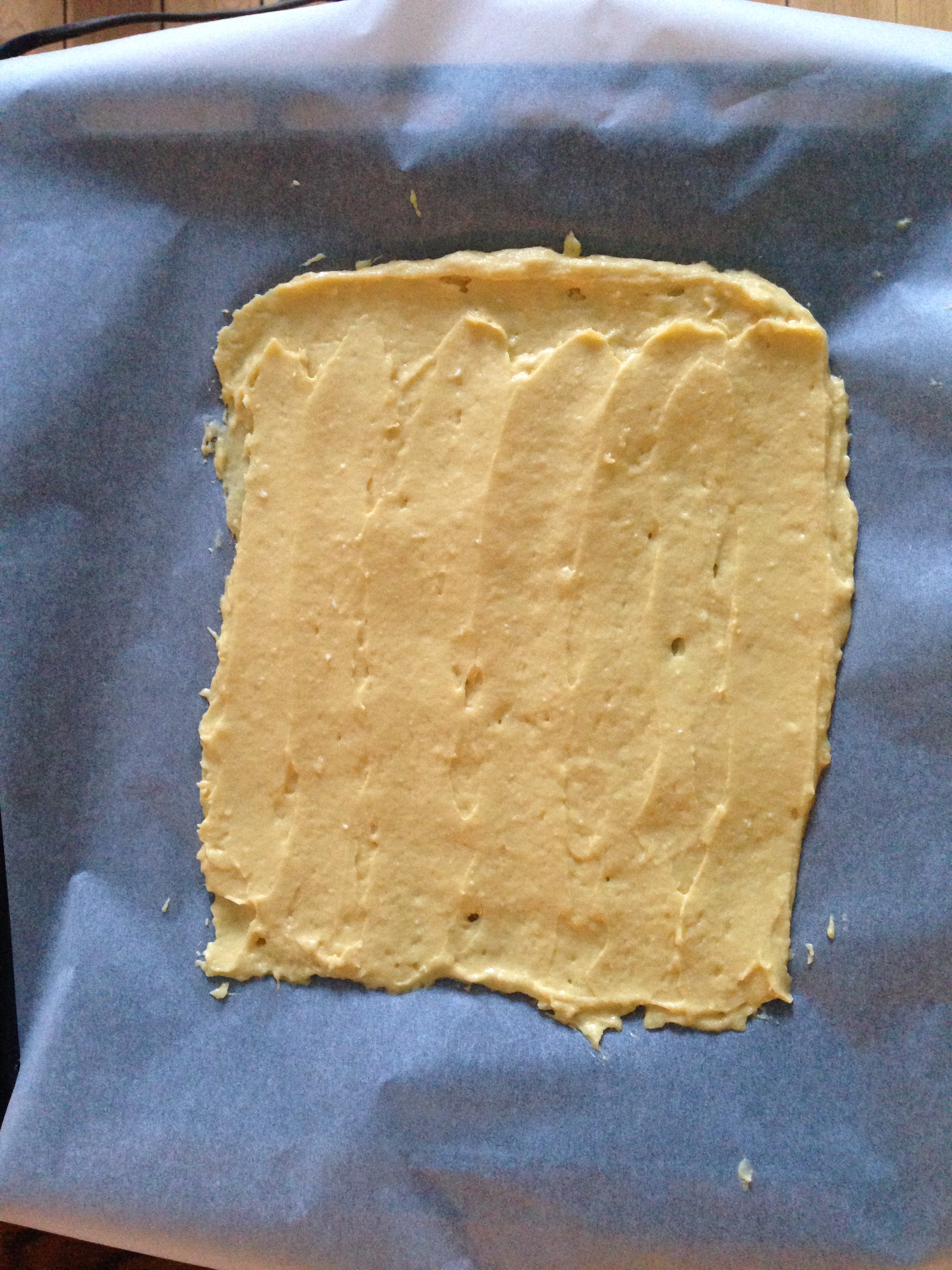 6. On an oven tray with baking sheet, spread the sponge cake batter in a rectangle or square form. Put aside in a cool place.