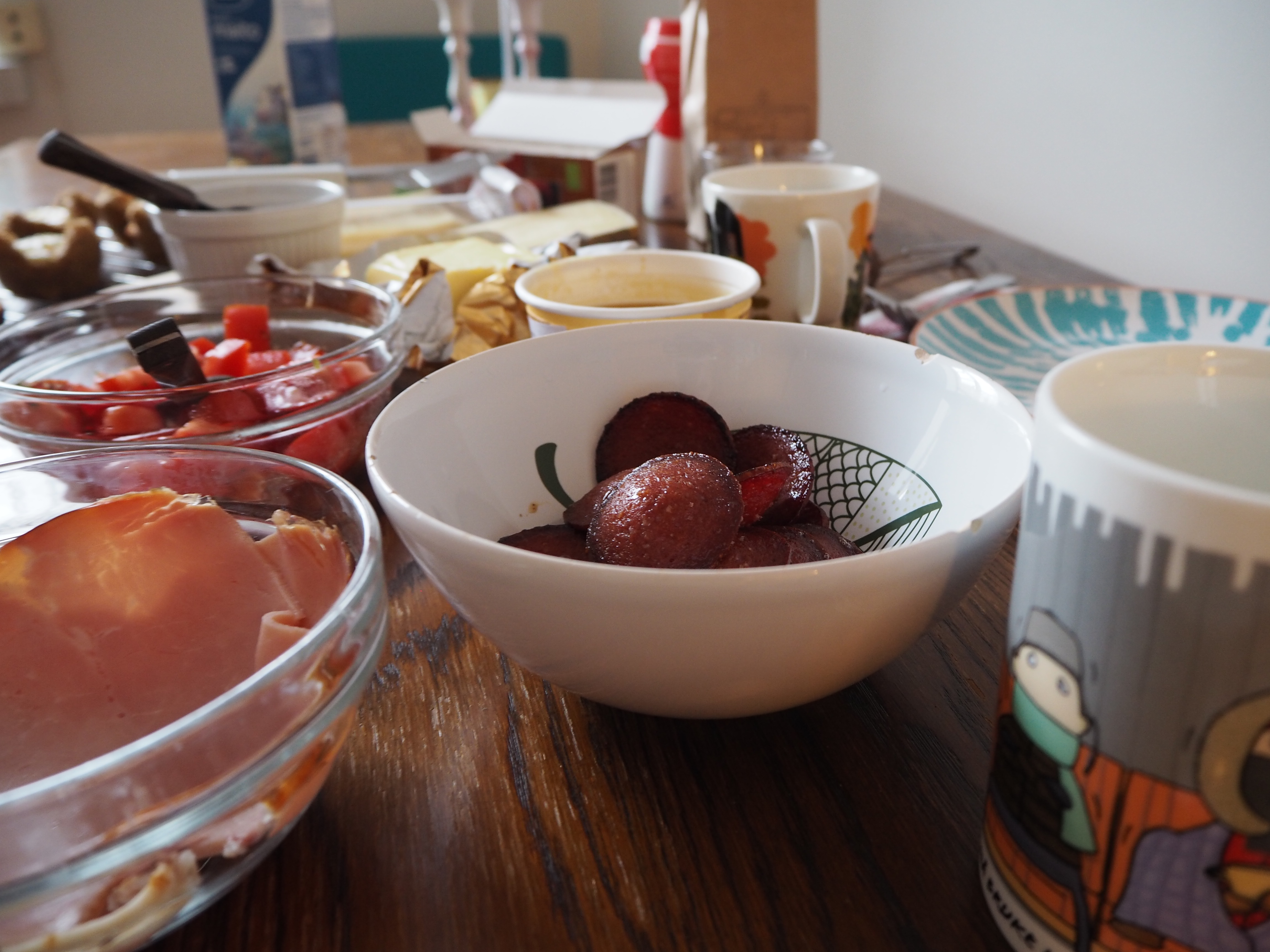 If you are not serving to a bunch of vegetarian friends, then meat is another must of a brunch table. You can have one or more different kinds of cold cuts. Another option is to sauté or fry some meat. I had a bit of Turkish sausage, named “sucuk”, that day. I knew that Pyry love it so I fried a few slices of sucuk. This is a quiet spicy sausage, generally made with ground beef. When you fry sucuk, you do not have to put any oil on the pan. Just put the slices on the pan and let it fry with its own fat.