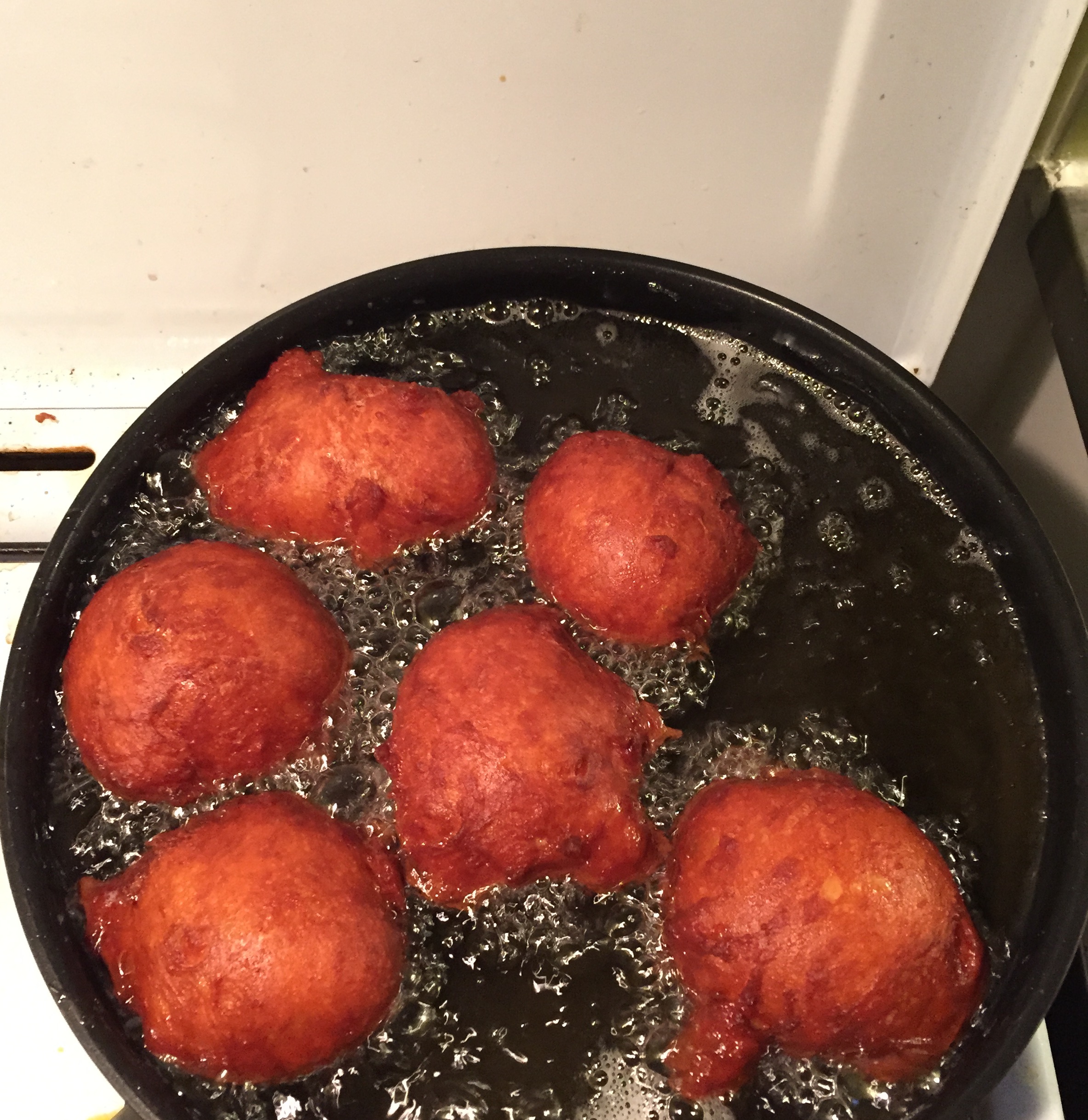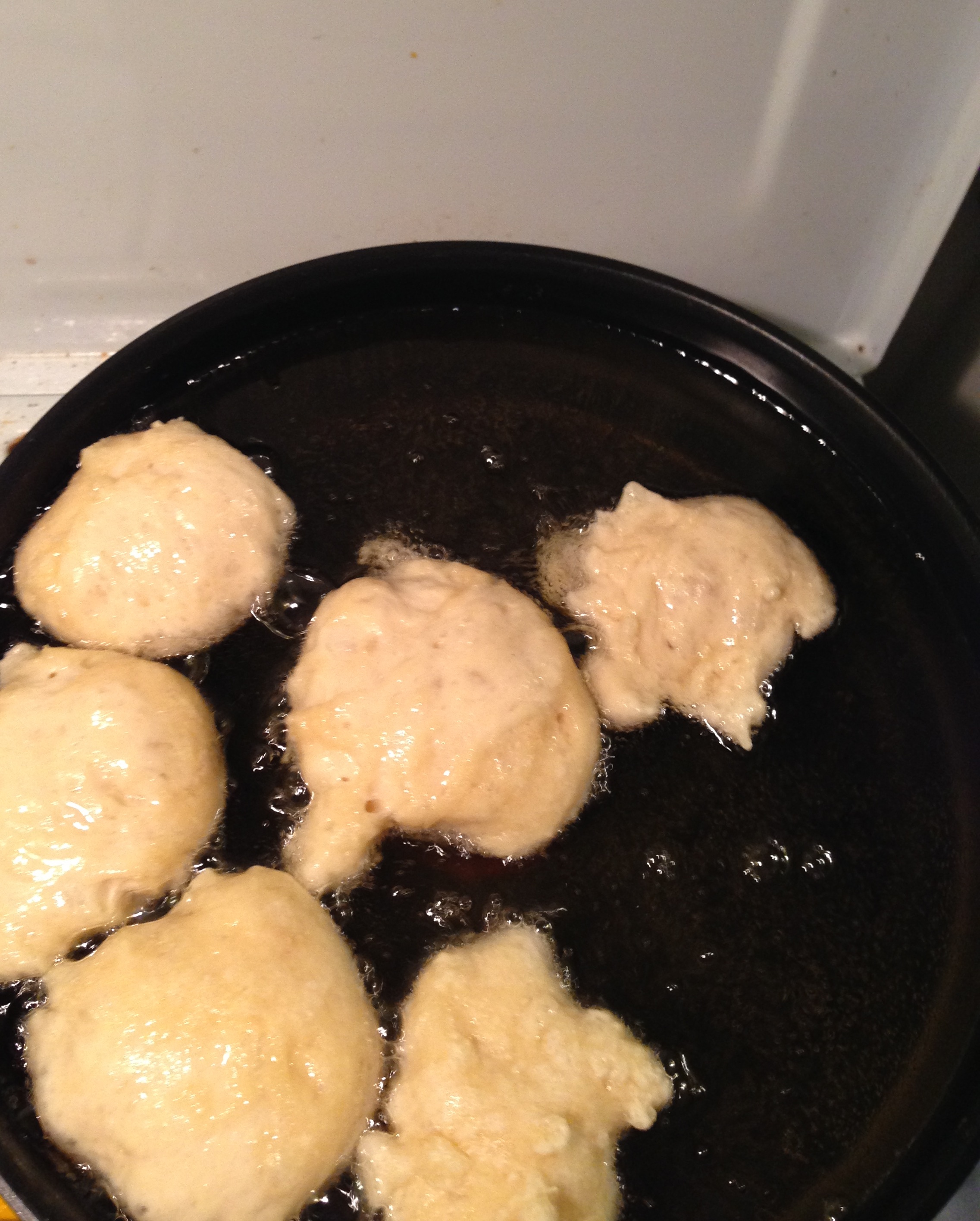 I like the plain version more, so here I will give the recipe for that one, but the only difference is to add raisins in the dough before you leave it to rise. You should eat them when they are warm, preferably right after they come out of the pan. In the Netherlands, in market squares and many other places, there are kiosks where they have giant pans with sizzling oil in which they fry the dough and give you your oliebollen right away.