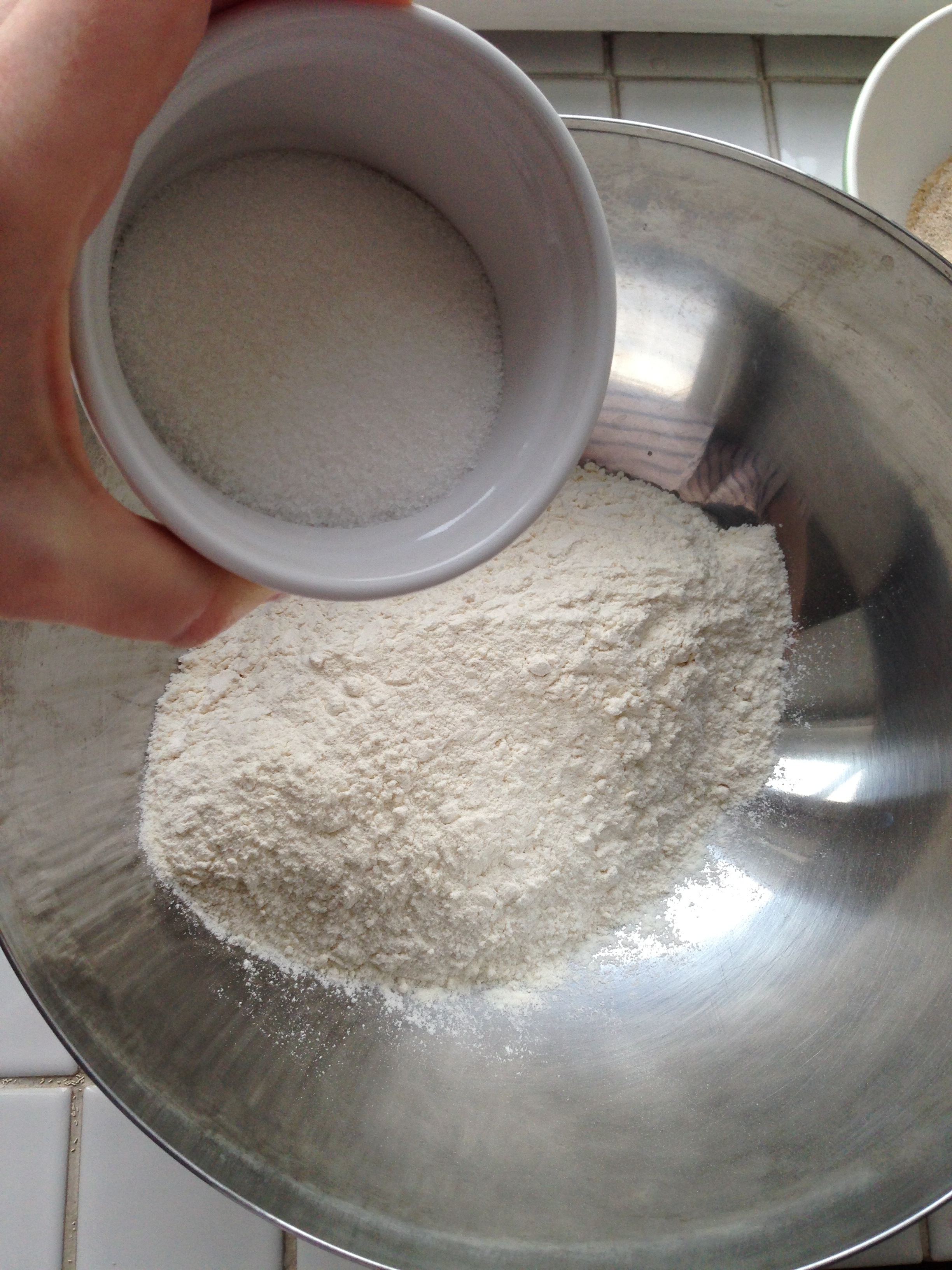 3. In the meantime, in a big mixing bowl, put flour and 1/4 cup / 0.6 dl sugar and whisk a little.