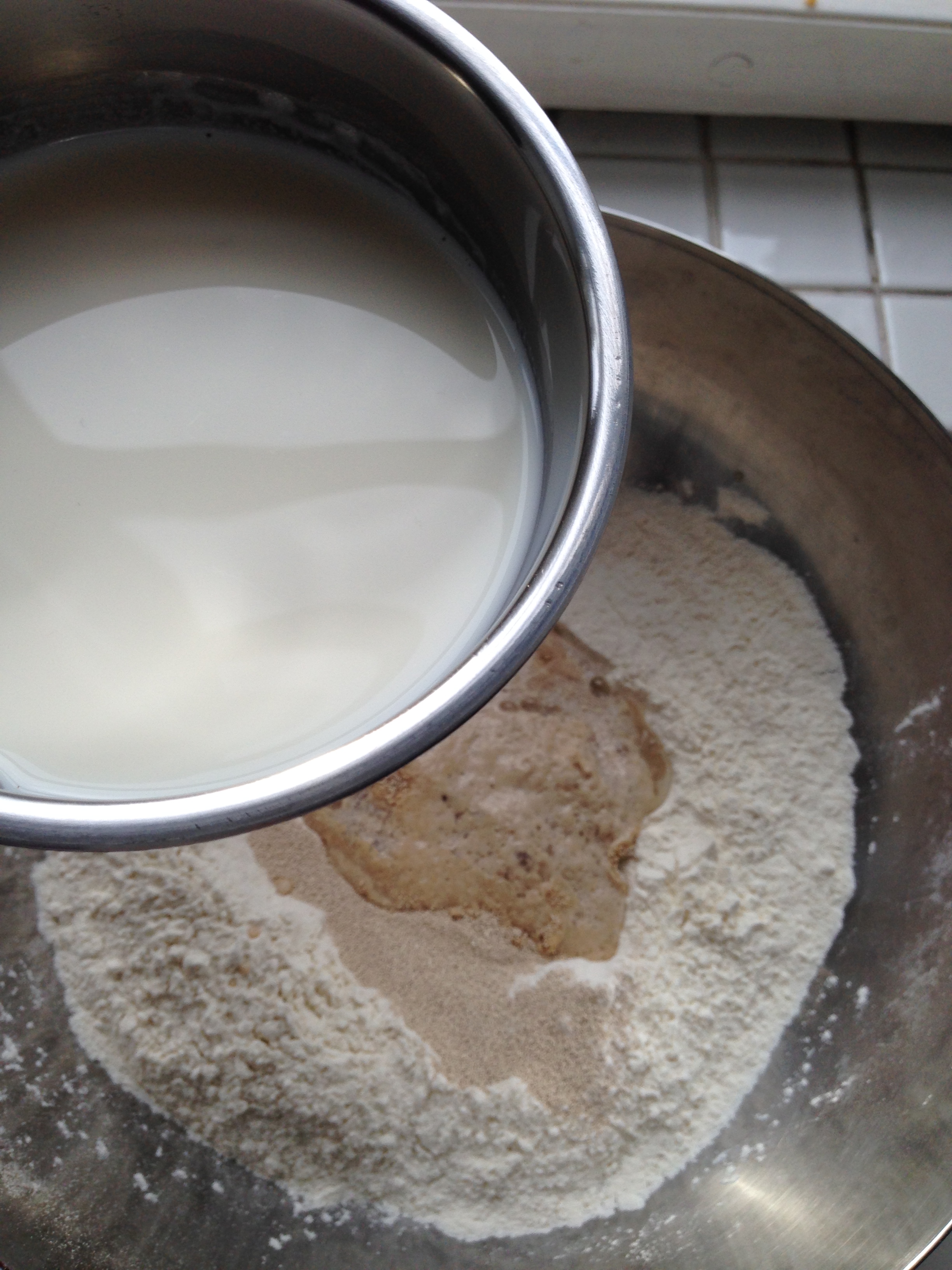 4. Make a well in the middle of flour mixture and add eggs and yeast mixture.