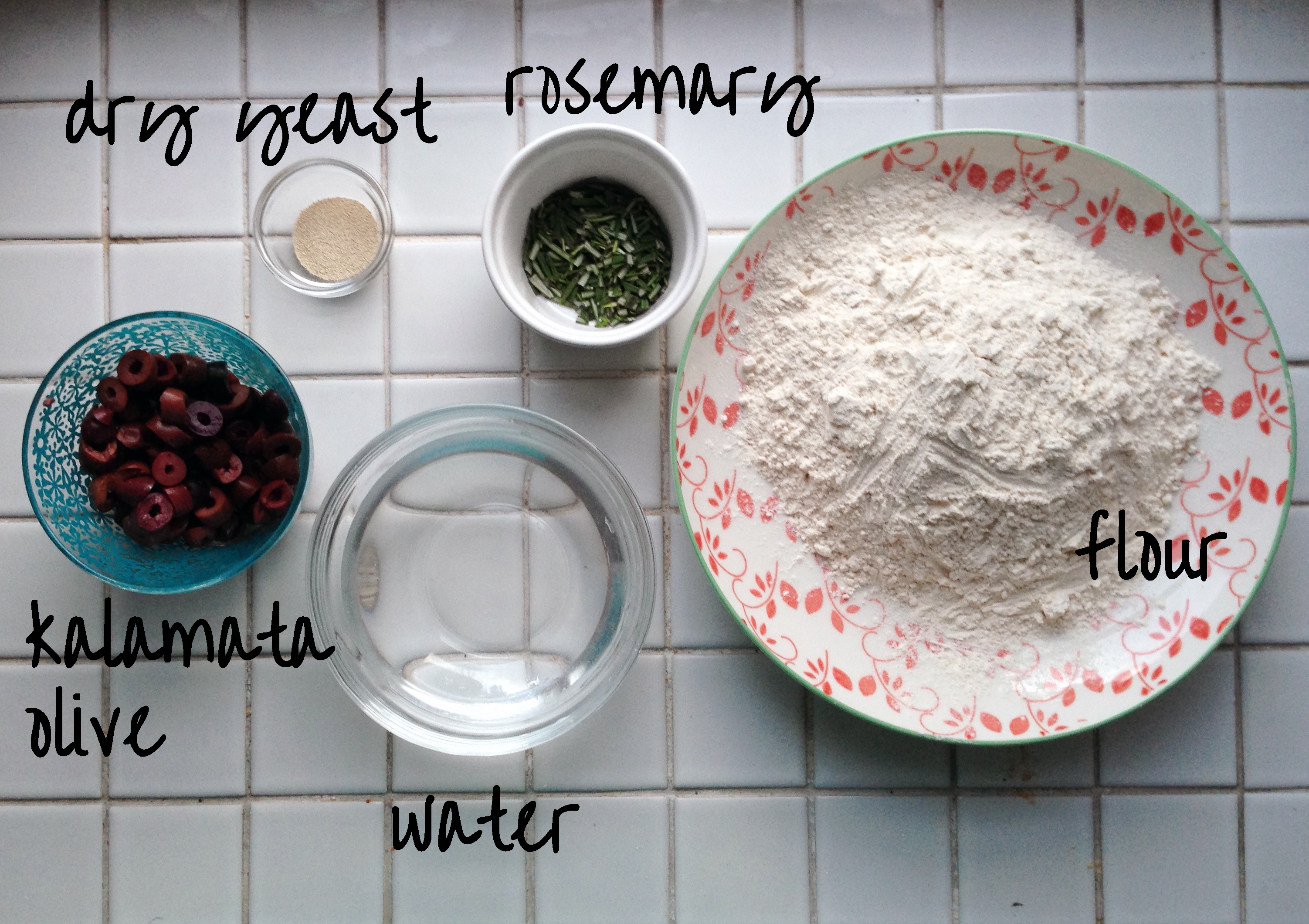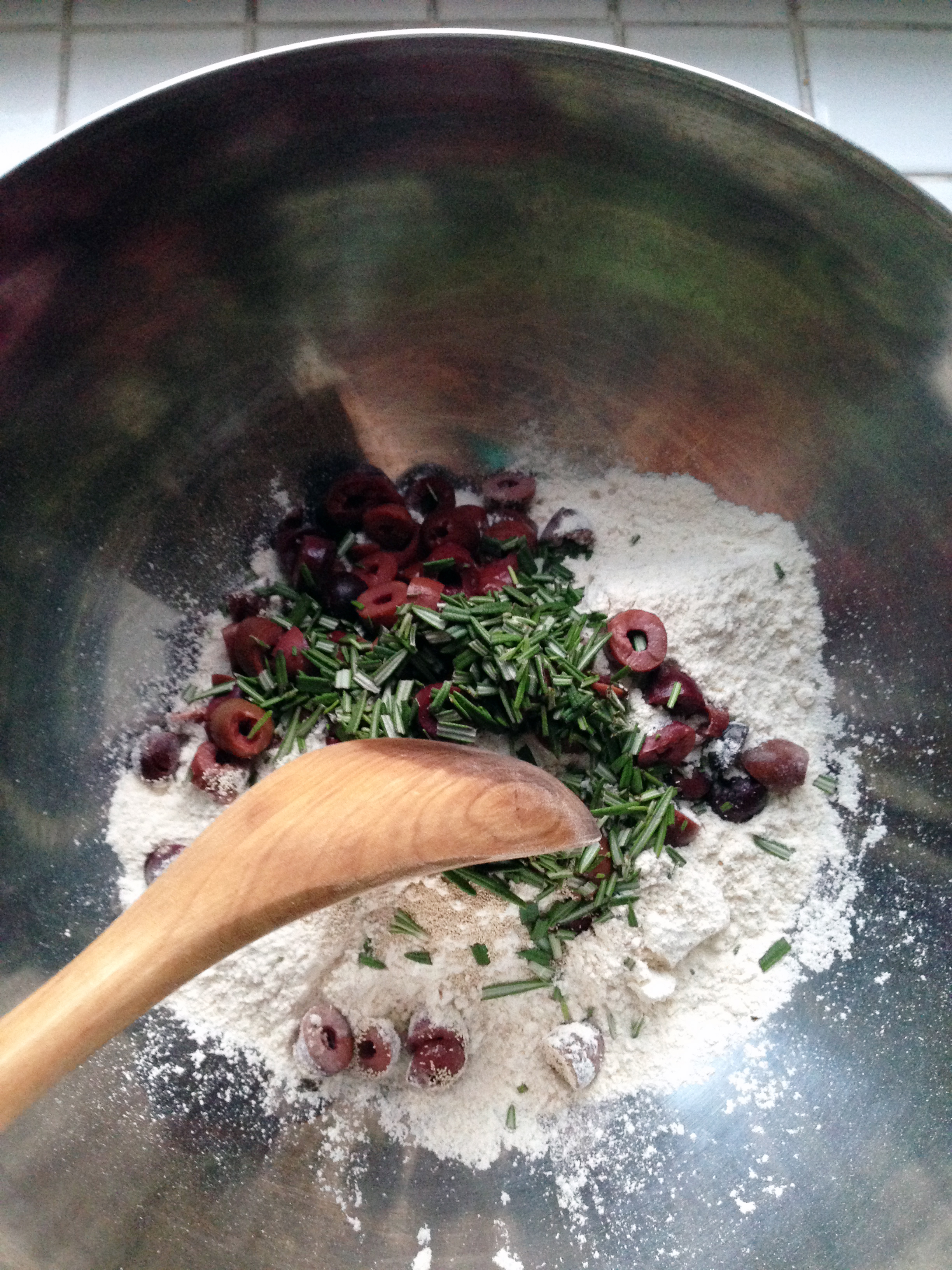 1. Put flour, yeast, olives and rosemary into the mixing bowl and stir just a little.
