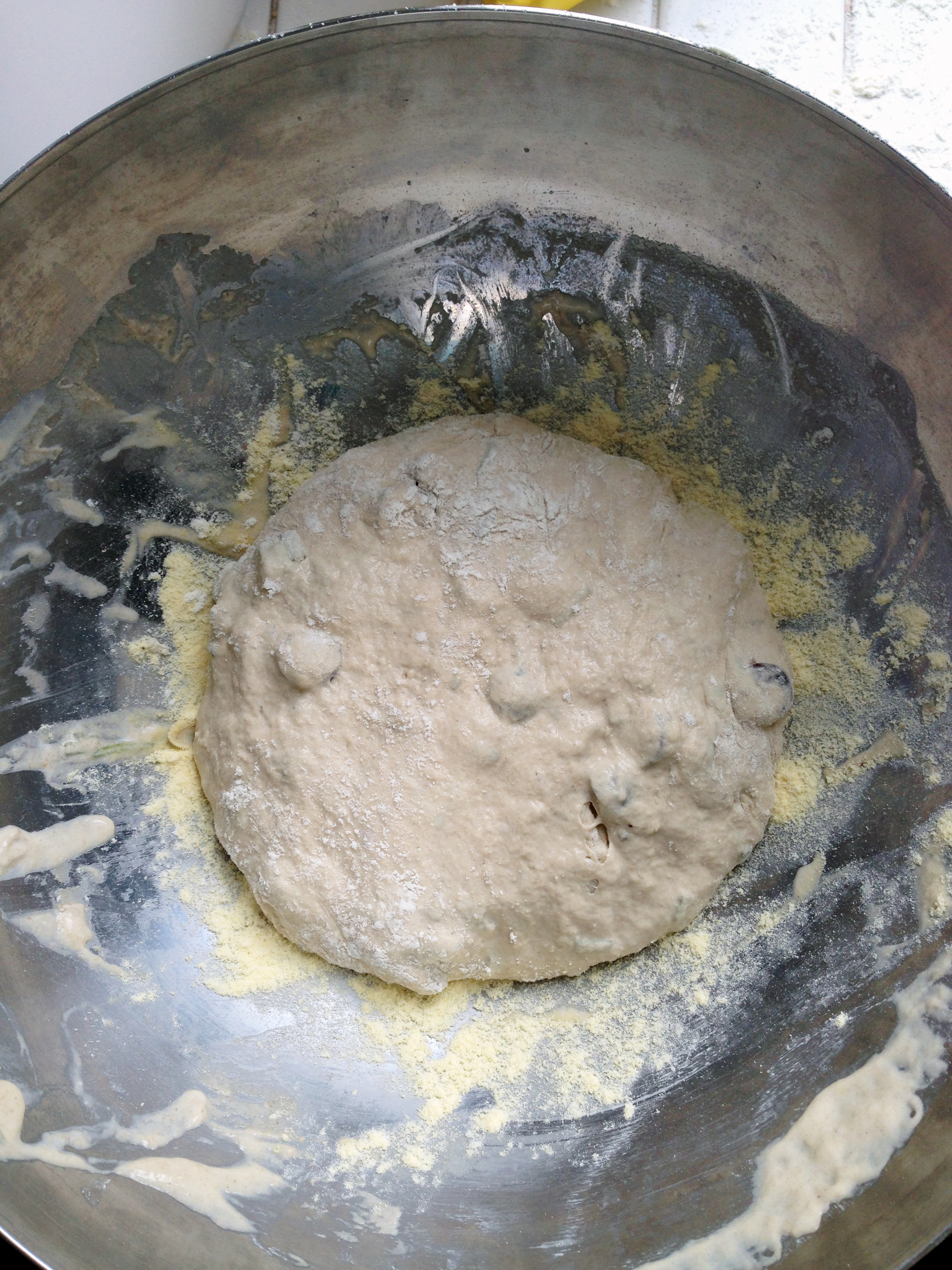 3. Flour a surface and put the bread dough on this surface. Adding a bit more flour needed to get the dough smooth, try to keep the dough together and slightly firm. Cover the base of a big mixing bowl with corn flour and let the dough go through proofing for another 2 hours. In the meantime, during the last half hour, heat the oven to 220C and put the iron cast pan inside the oven while it is warming up (without the lid; do not heat the lid in the oven.