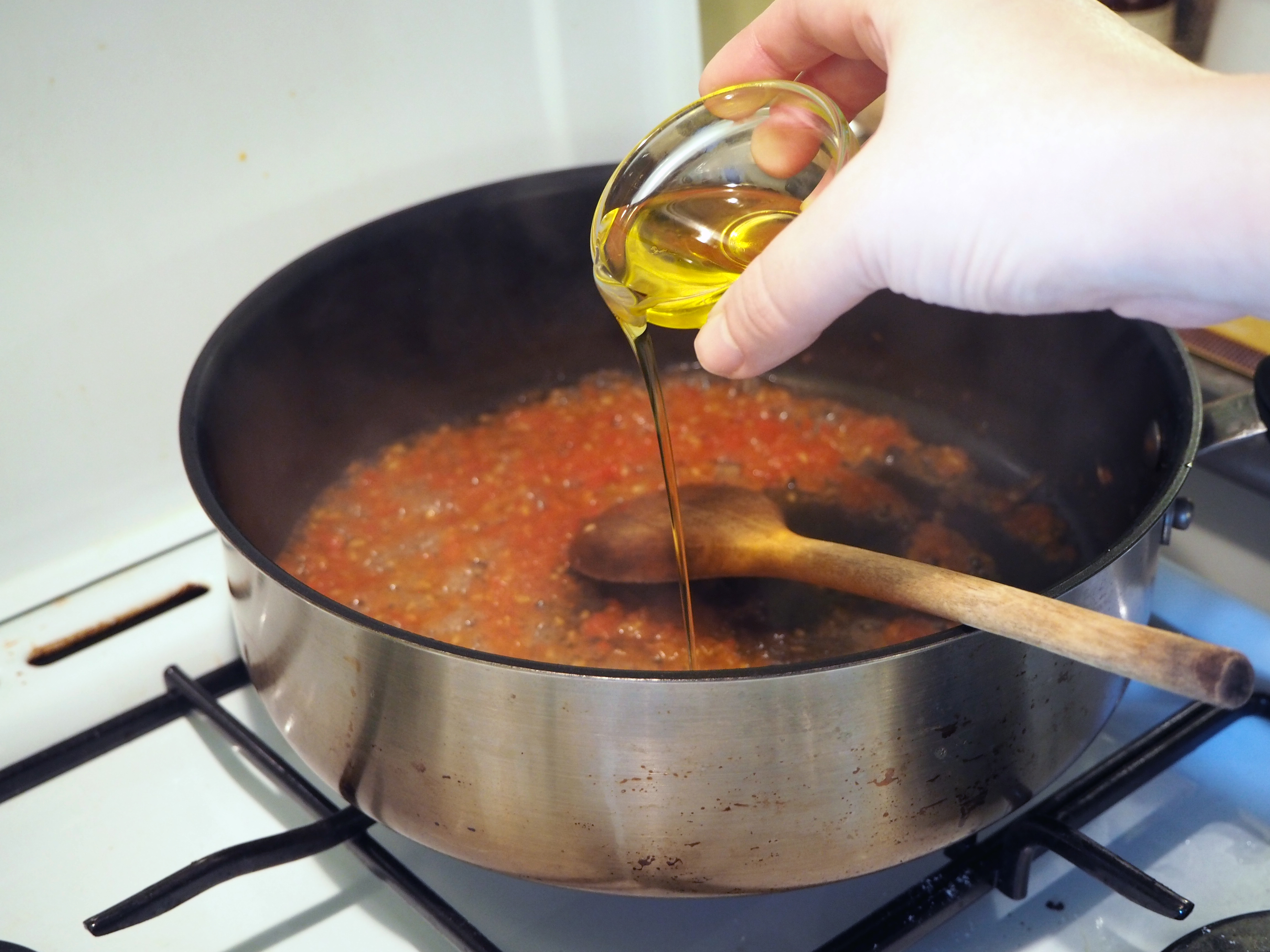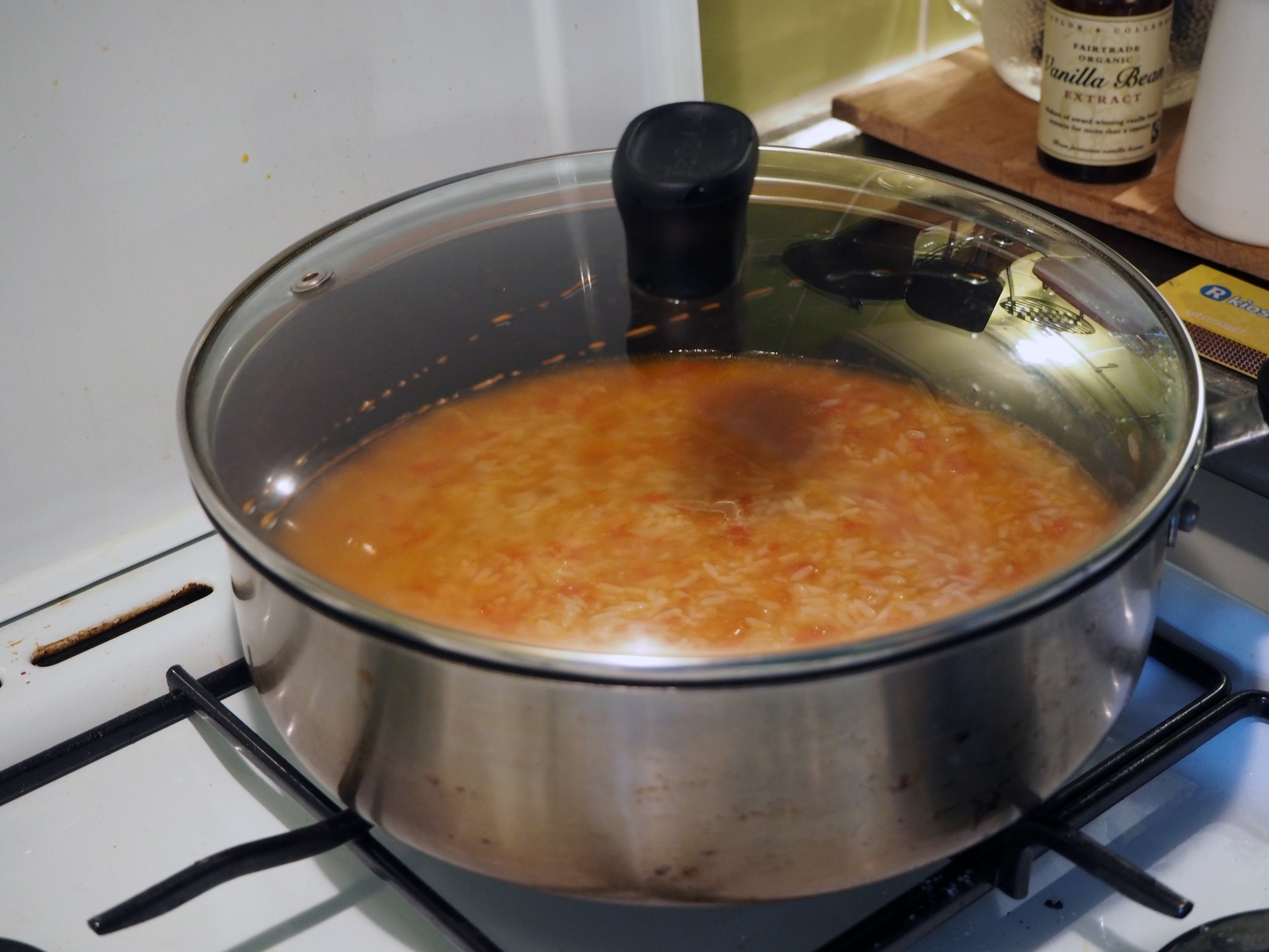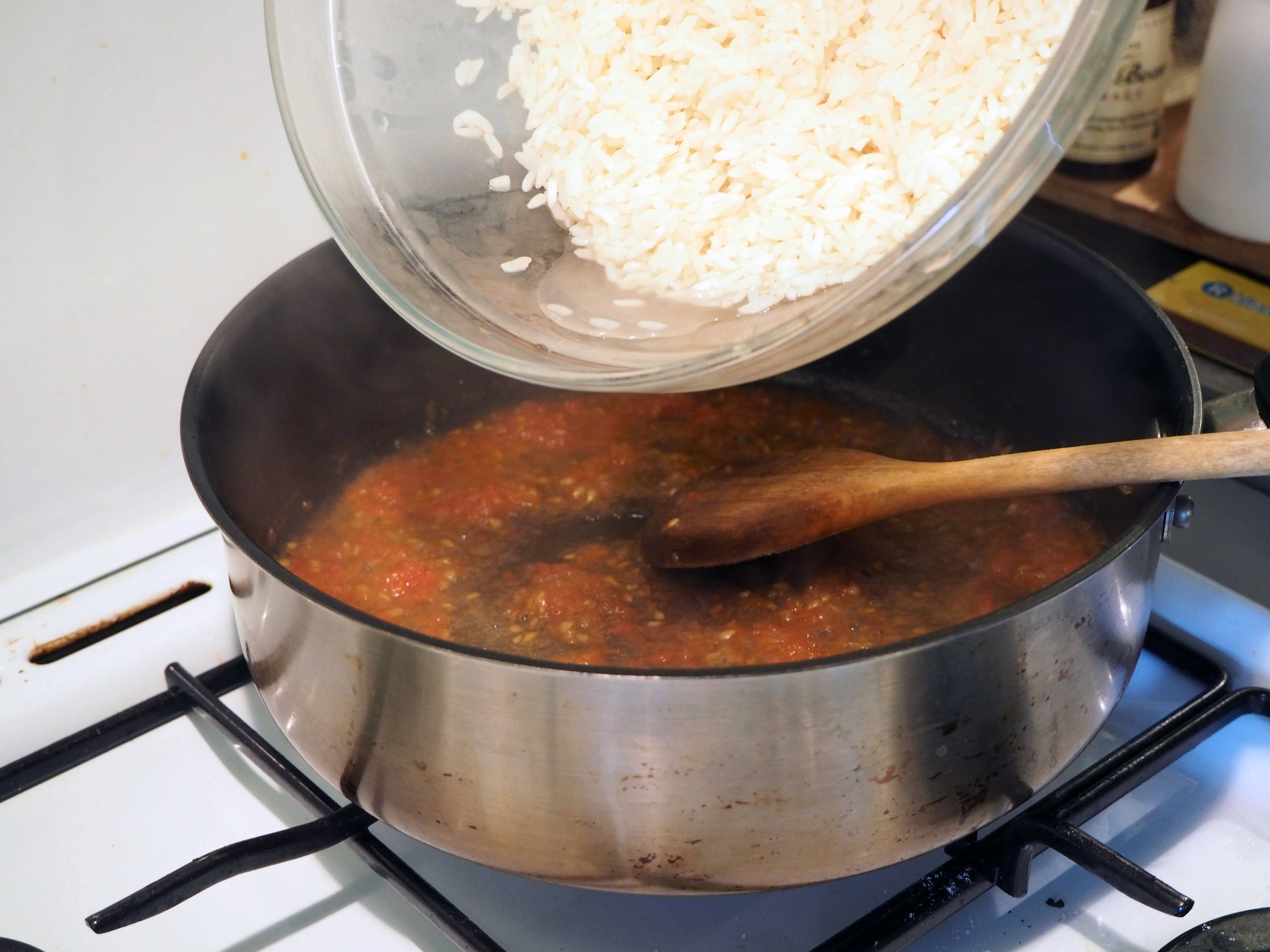 1. Put grated tomatoes in a shallow but large pan (if you have.. if you don’t, then it’s perfectly fine to cook rice in normal pan, just check how much it cooks often). Stir a bit, cover with a lid and let it cook, in medium heat, for about 5 minutes.
