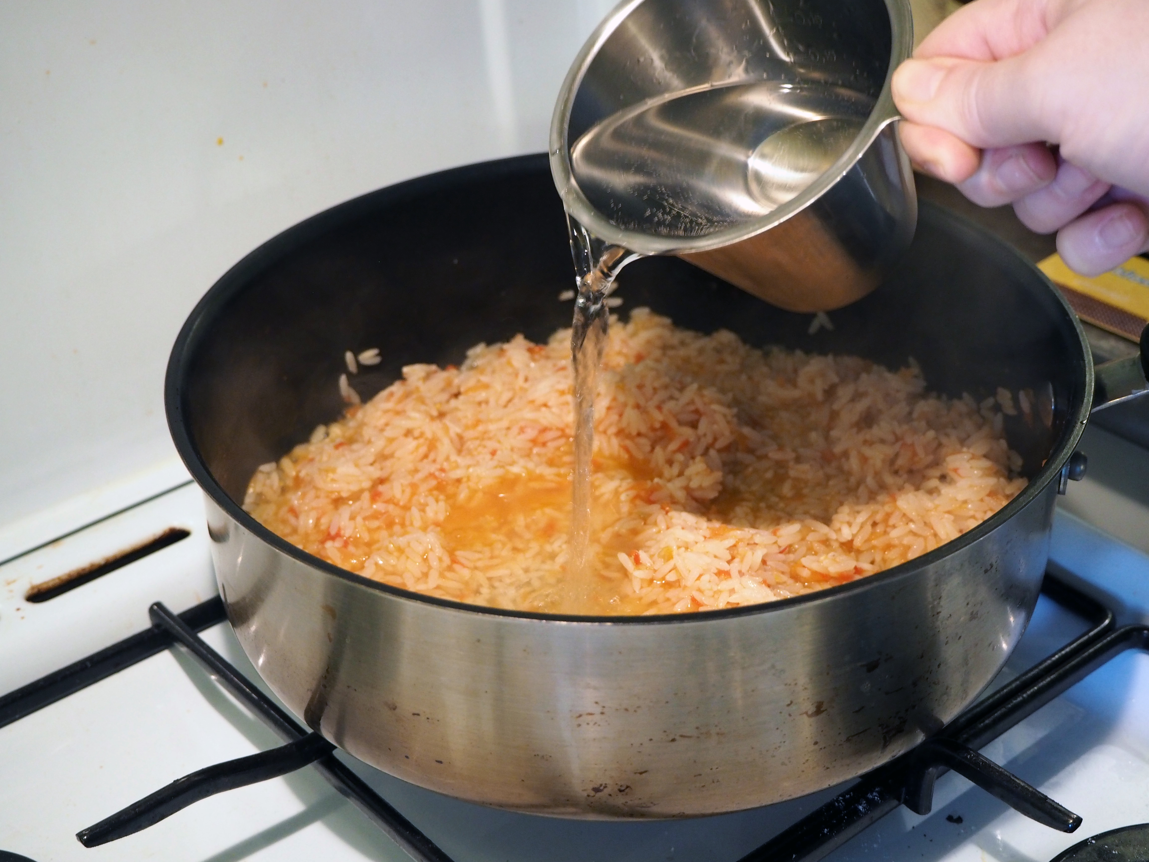 4. Add water, just stir half a minute to make sure that all rice is evenly covered with water.