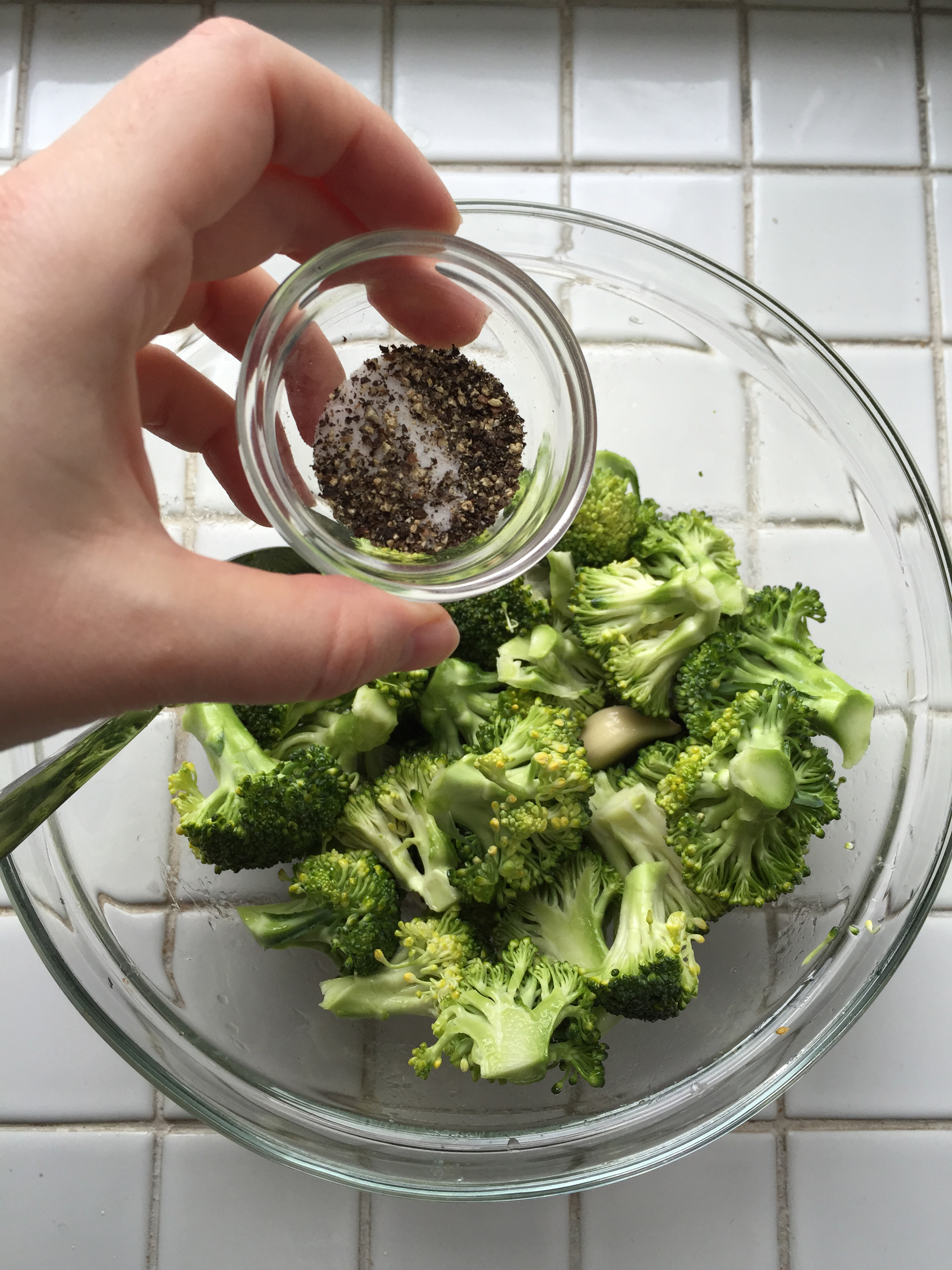 3. Add salt and pepper, mix again, and put all on an oven tray with a baking sheet. Bake for about 10-15 minutes, or until broccoli pieces start browning. When done, take them out of the oven and let cool for about 5 minutes.