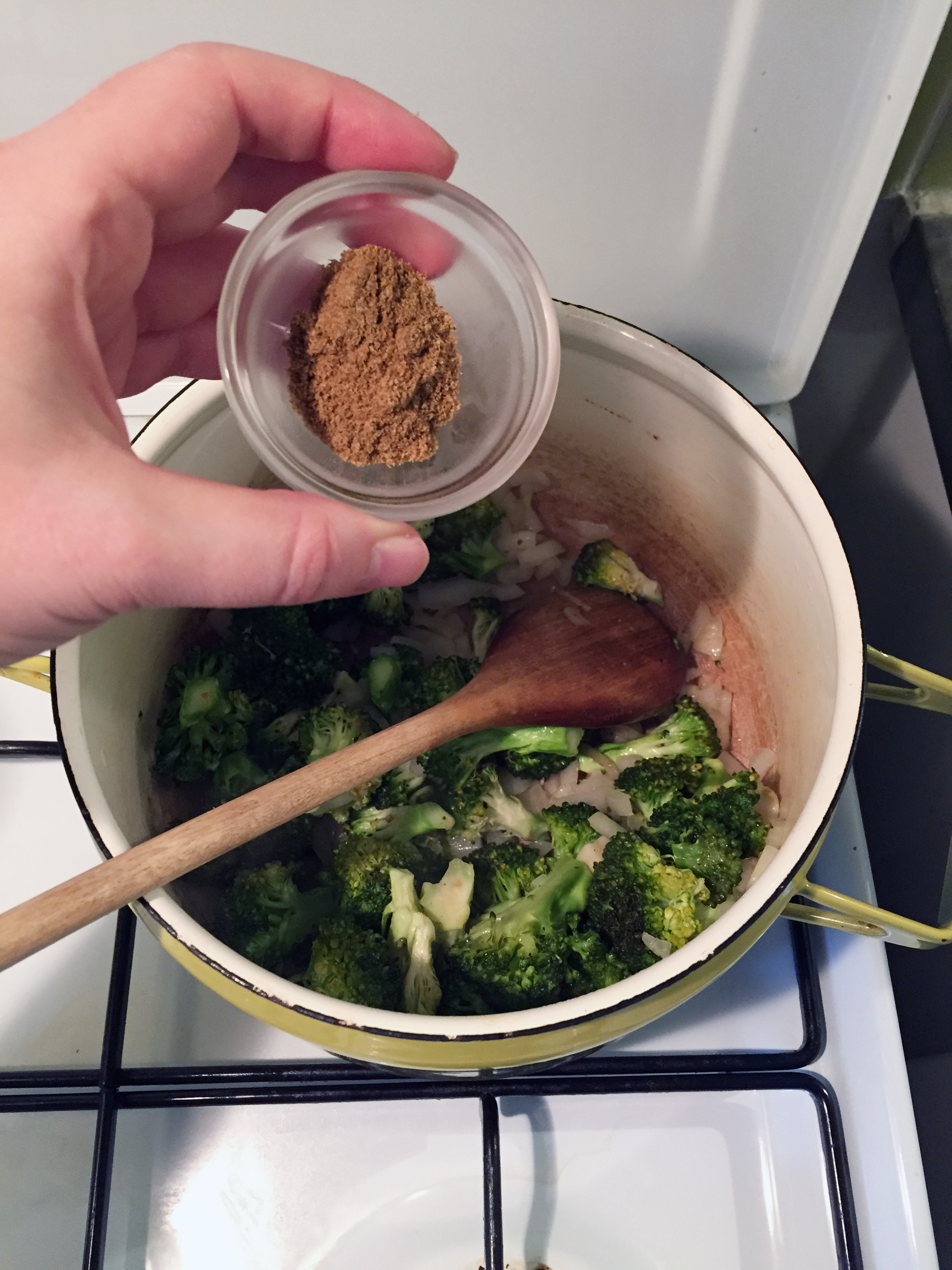 5. Add roasted broccoli and cumin in the pan and stir on medium heat for a couple of minutes.