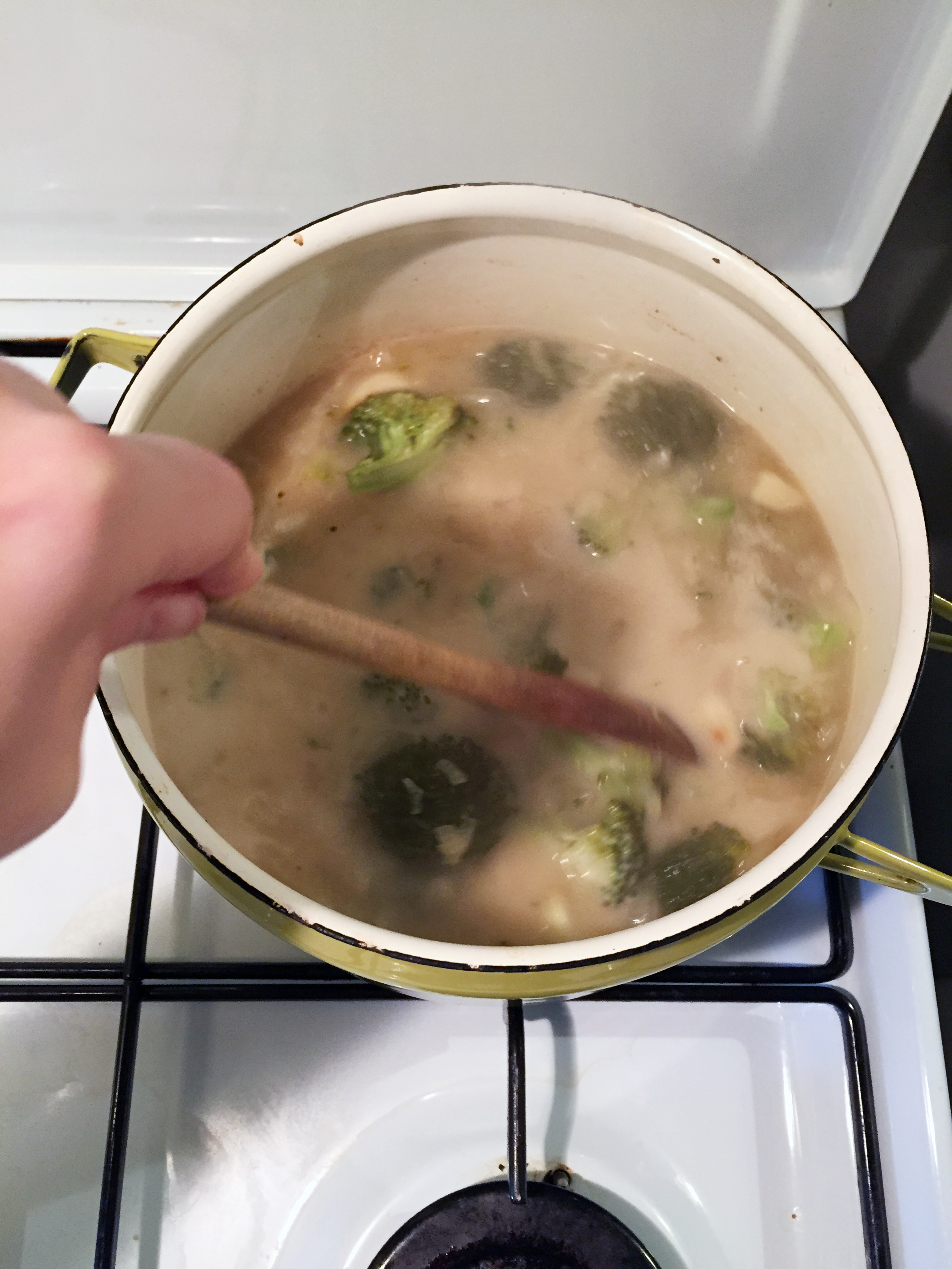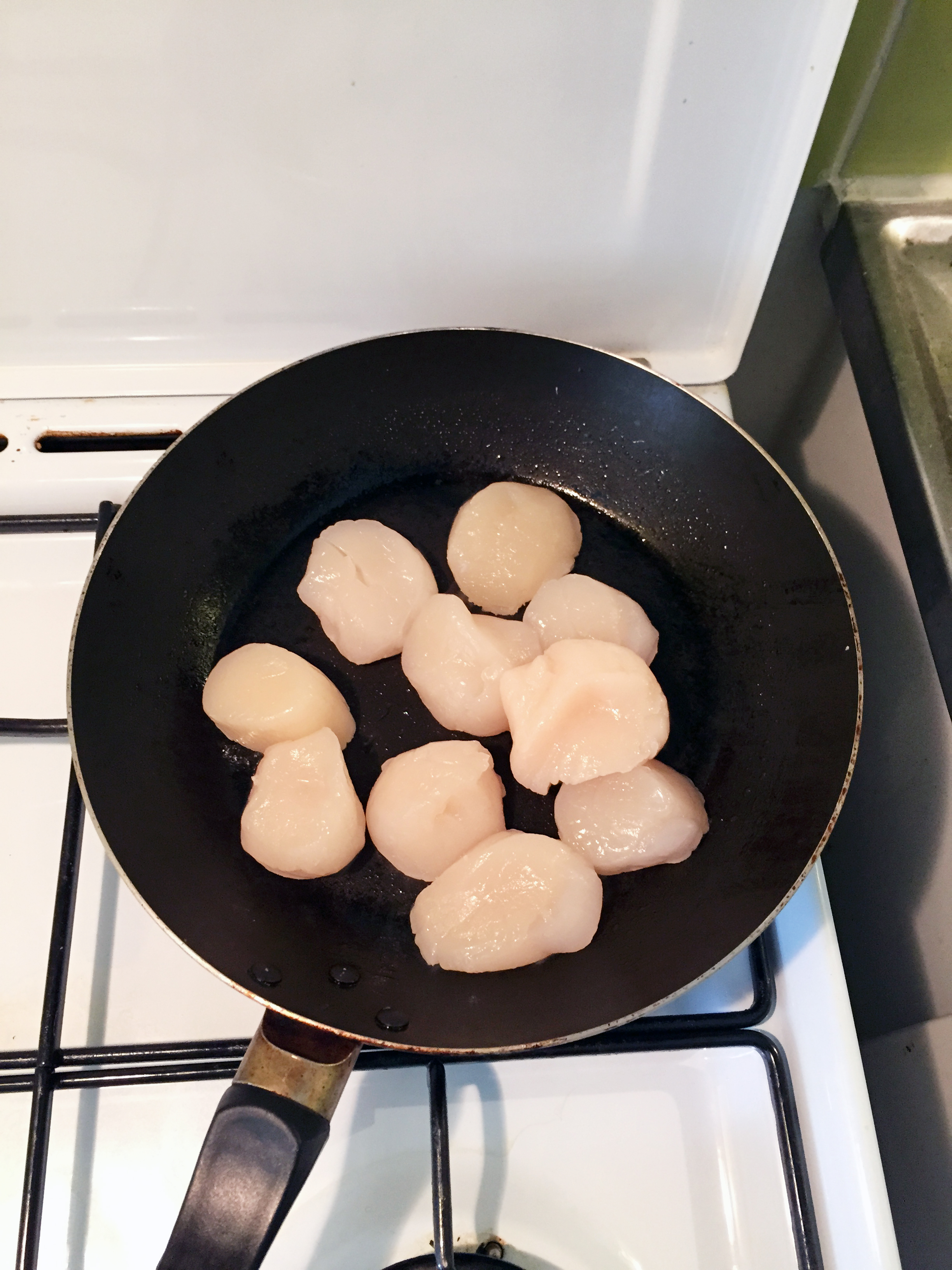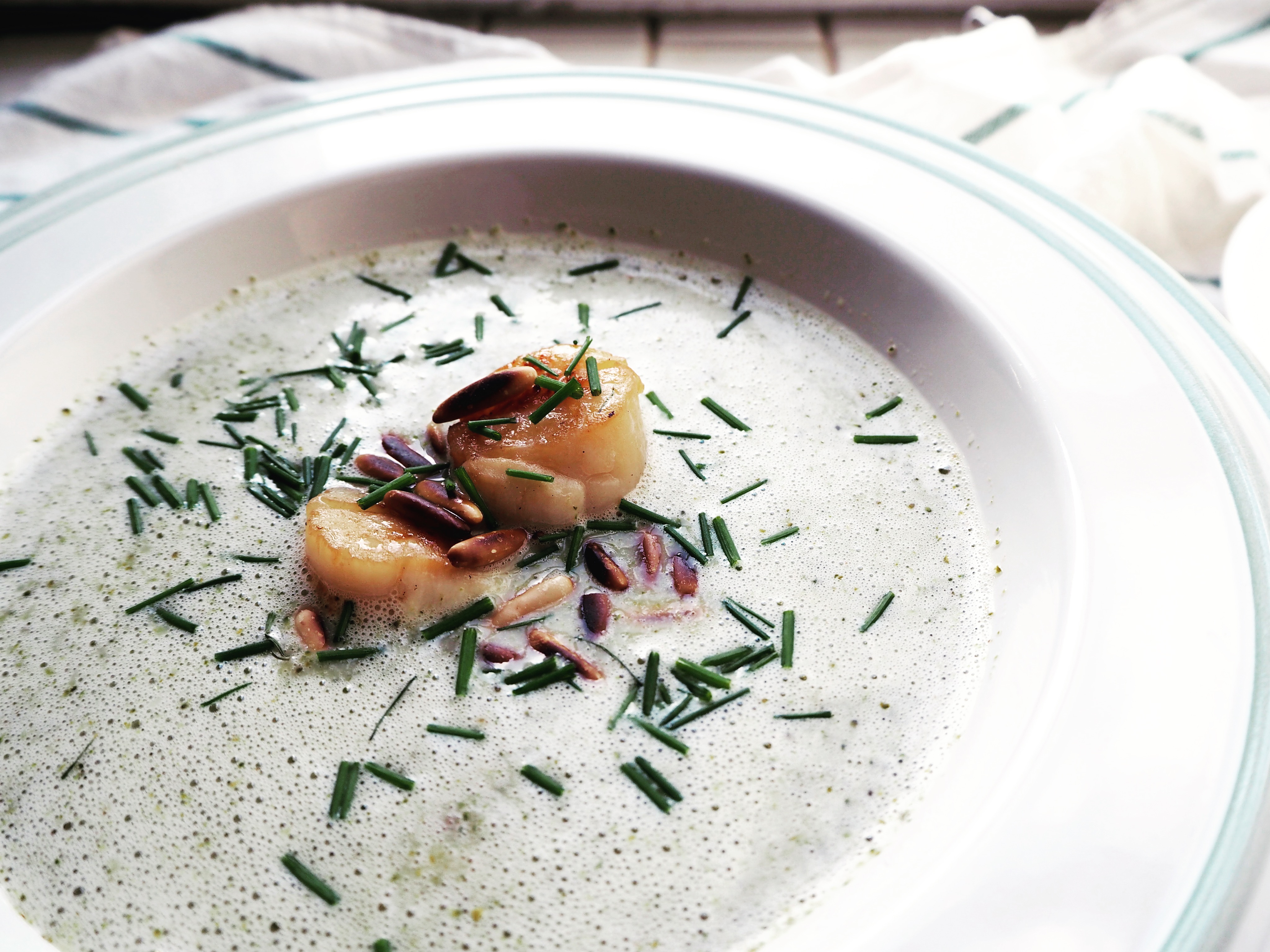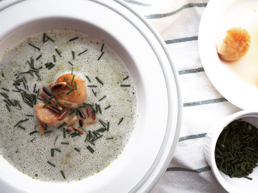So after this little trial, I can say that creamy broccoli soup and pan fried scallops work great together. You can top it with chives and some nuts. I had roasted pine nuts hanging around on my kitchen counter so I just added them. Parsley would go well too. It’s up to you, you can top it with your favourite herbs and nuts.