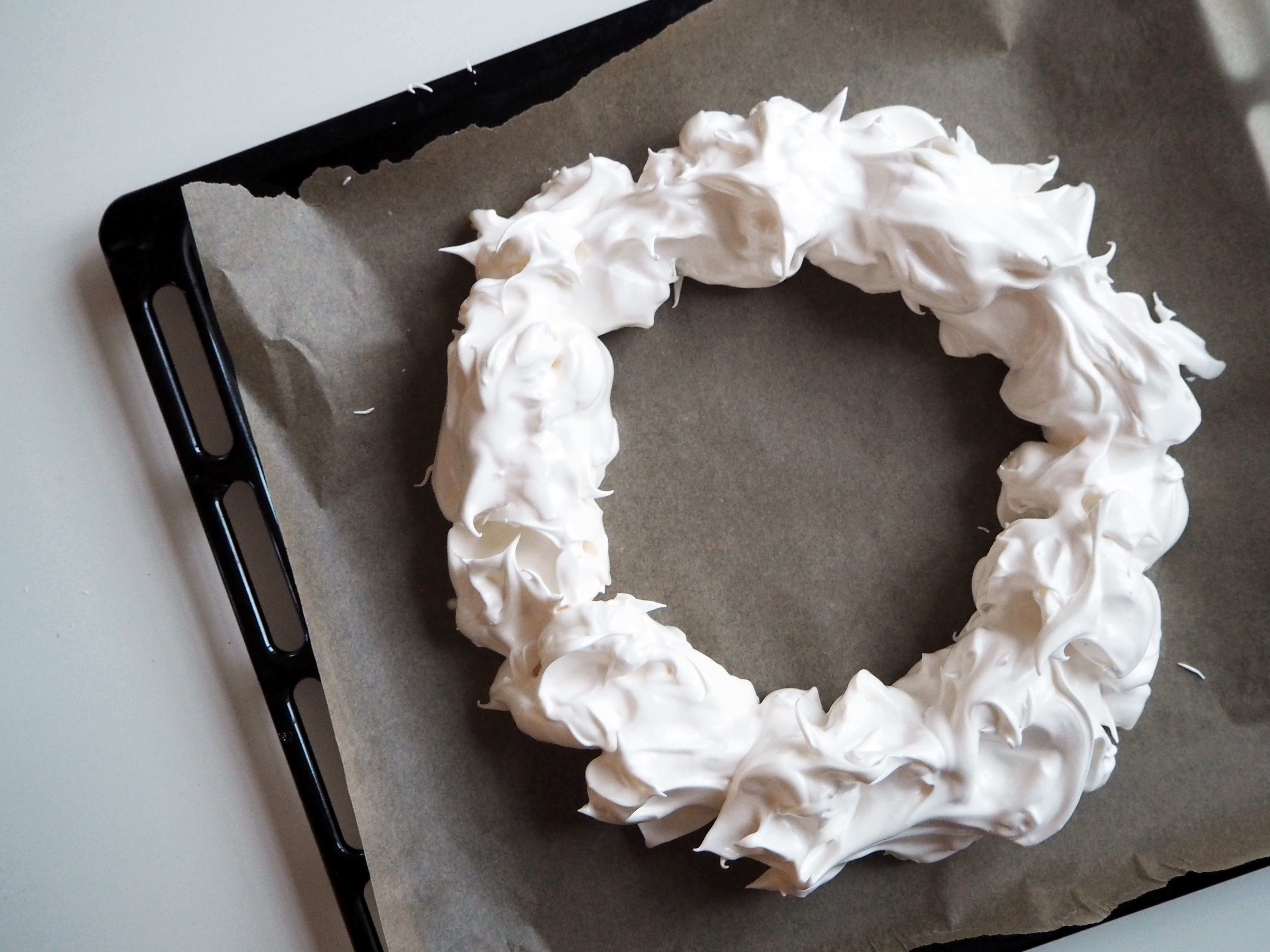 4. By taking 1 spoon at a time from the meringue, give the shape of the wreath on baking sheet as seen in the photo.