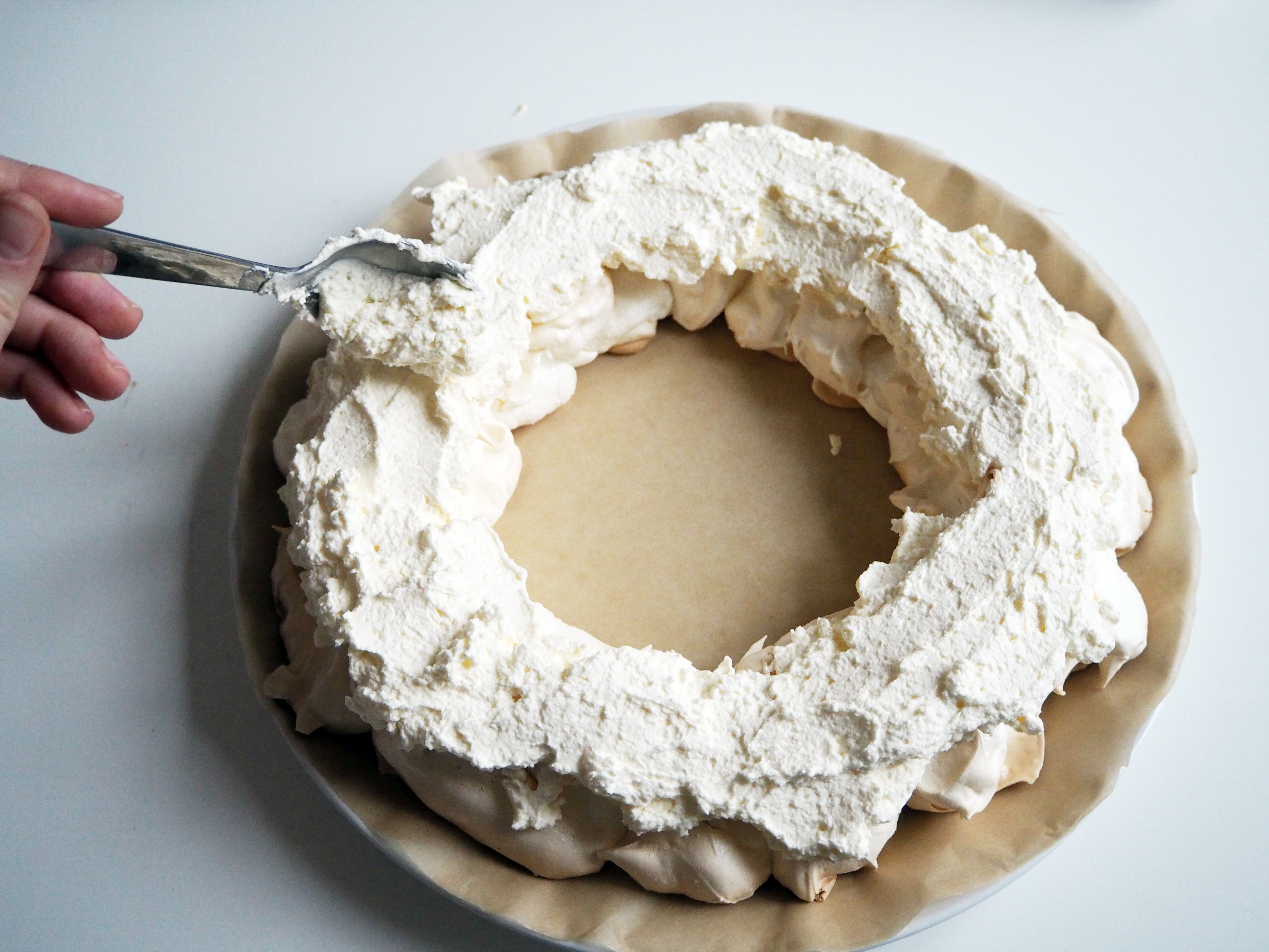 3. Take a plate or, like me, the base of a spring form pan, and draw a circle on a baking sheet. This will be your guide while shaping the pavlova. Turn the baking sheet so that the side with ink does not touch your cake.