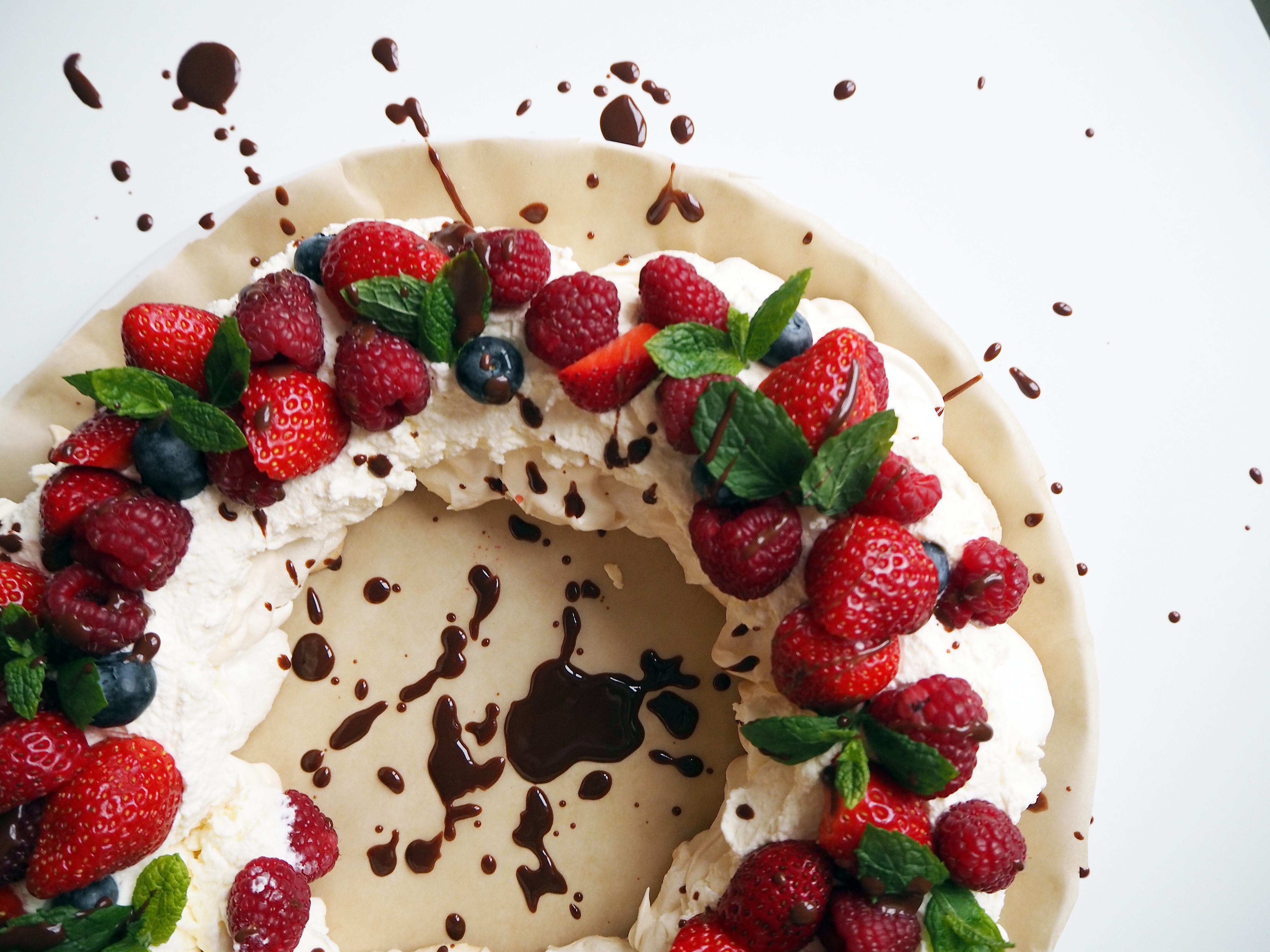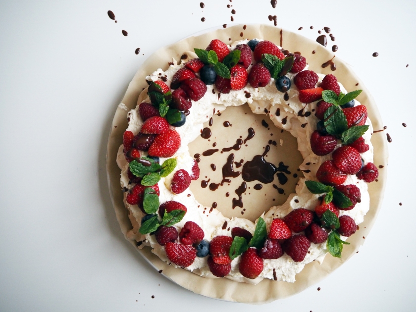 So what you simply need to do is to make the same pavlova and cream, and but just shape the pavlova as a wreath and make your assembly accordingly. I drizzled a little chocolate sauce on top, but you can keep it chocolate free and just use the fresh fruits. You can also add nuts to this if you like, roasted slivered almonds would go great!