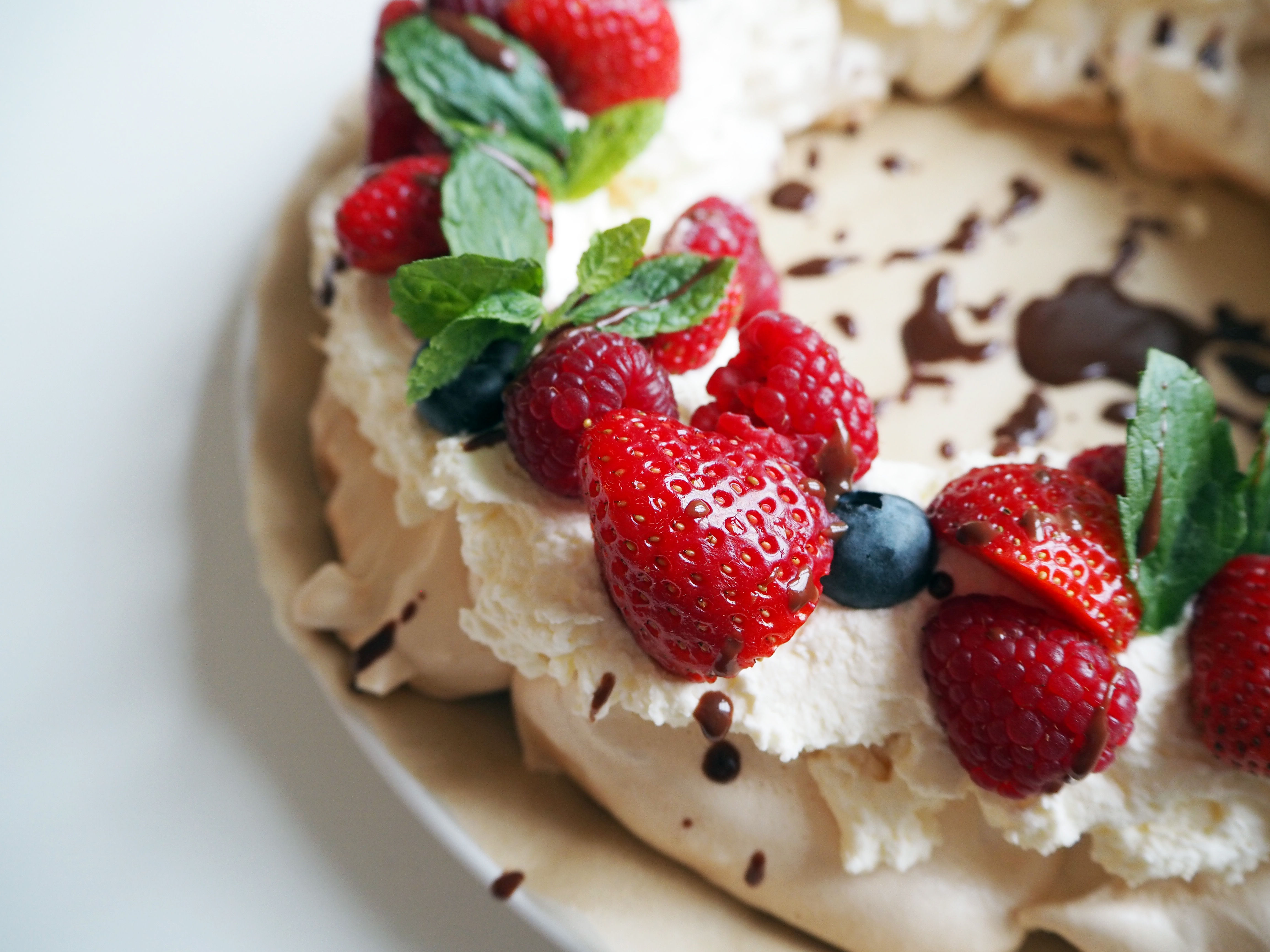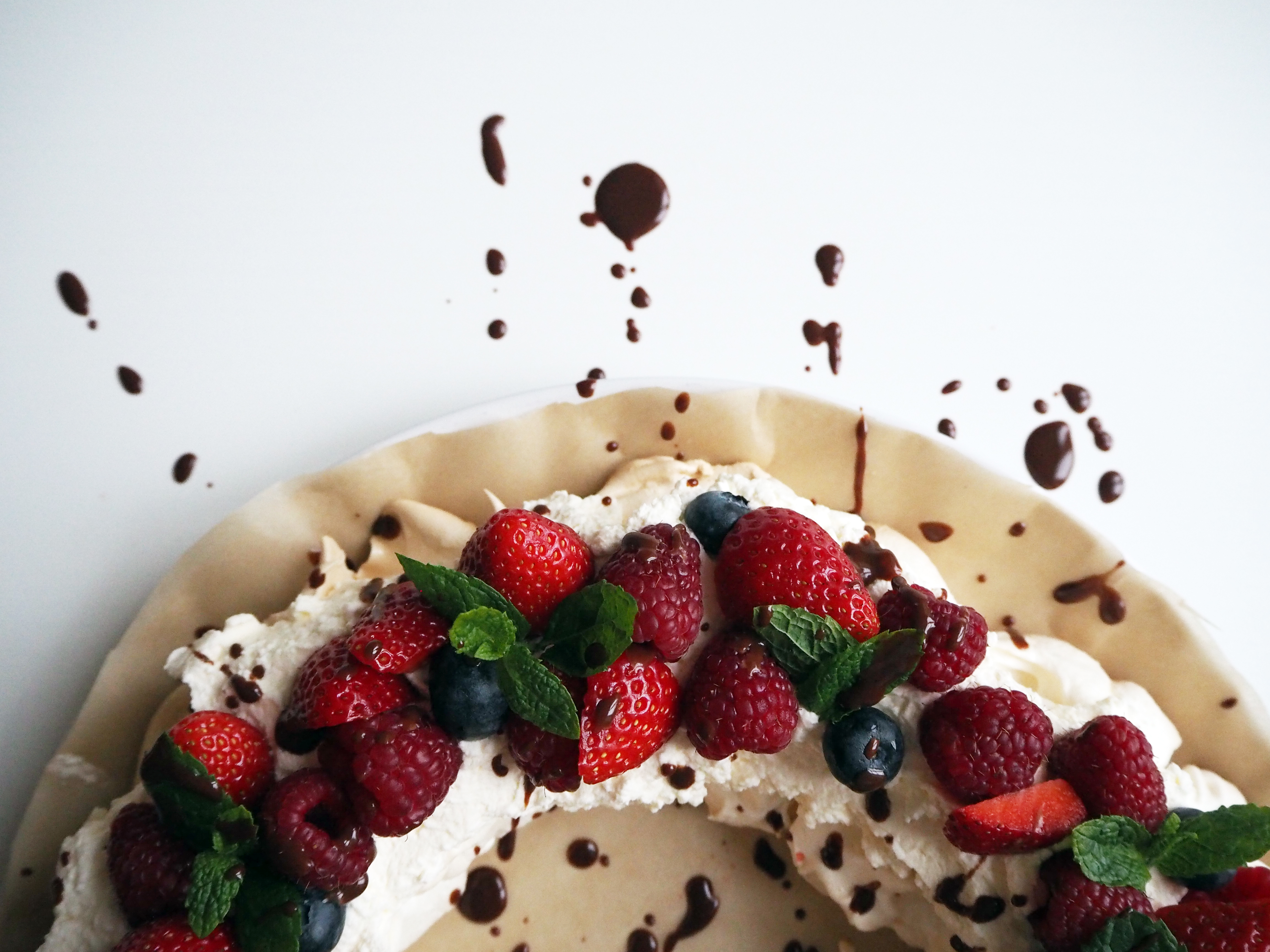 8. Now assemble: Transfer the meringue gently to a plate or to a clean sheet etc. Put cream on top. Decorate generously with fruits and mint leaves. Drizzle with chocolate sauce. Enjoy!