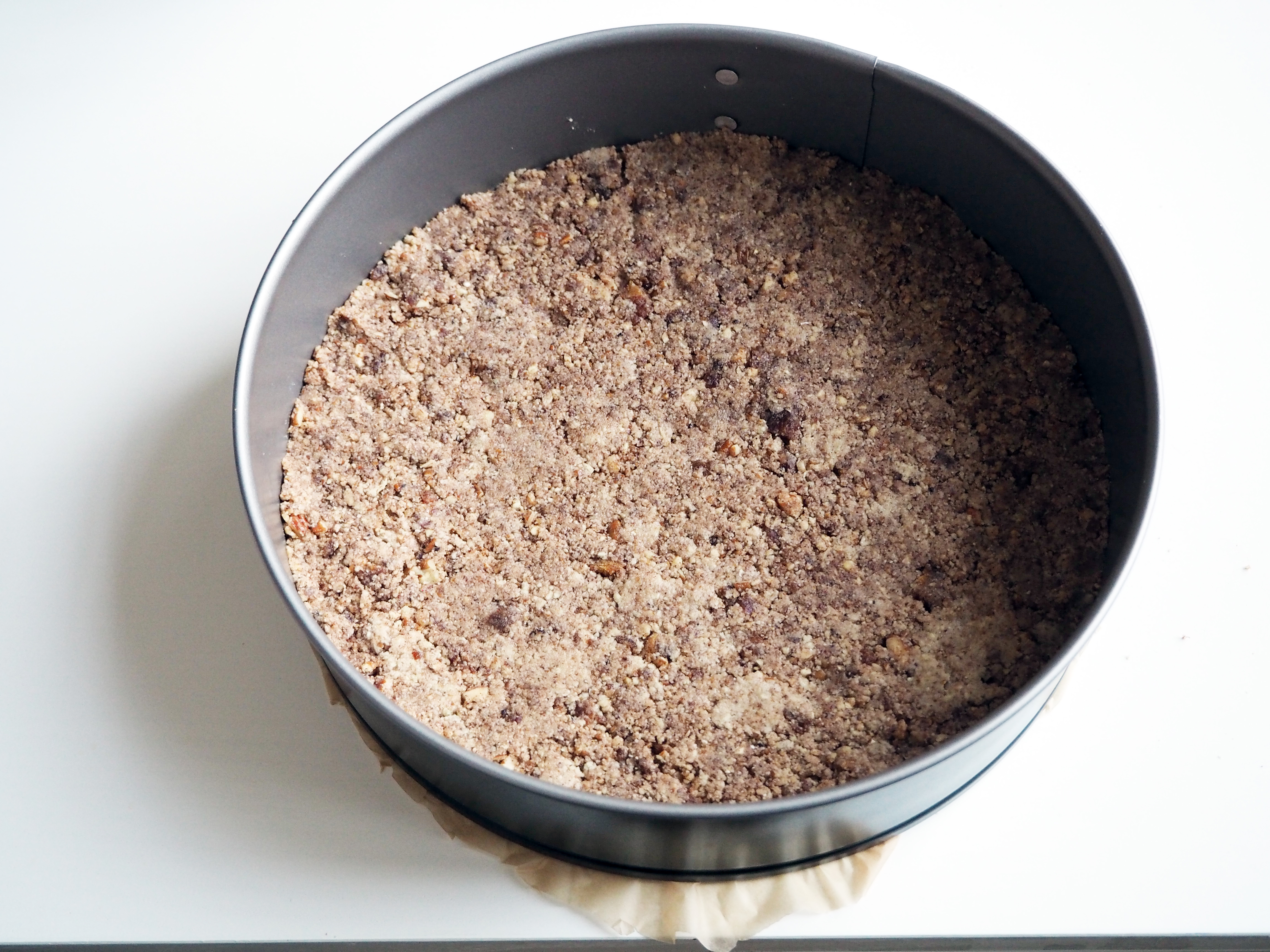 1. Make the crust: Put ALL THE INGREDIENTS FOR CRUST in a food processor / blender and process until it’s crumbly but feels like a dough, which can stick to the cake pan.