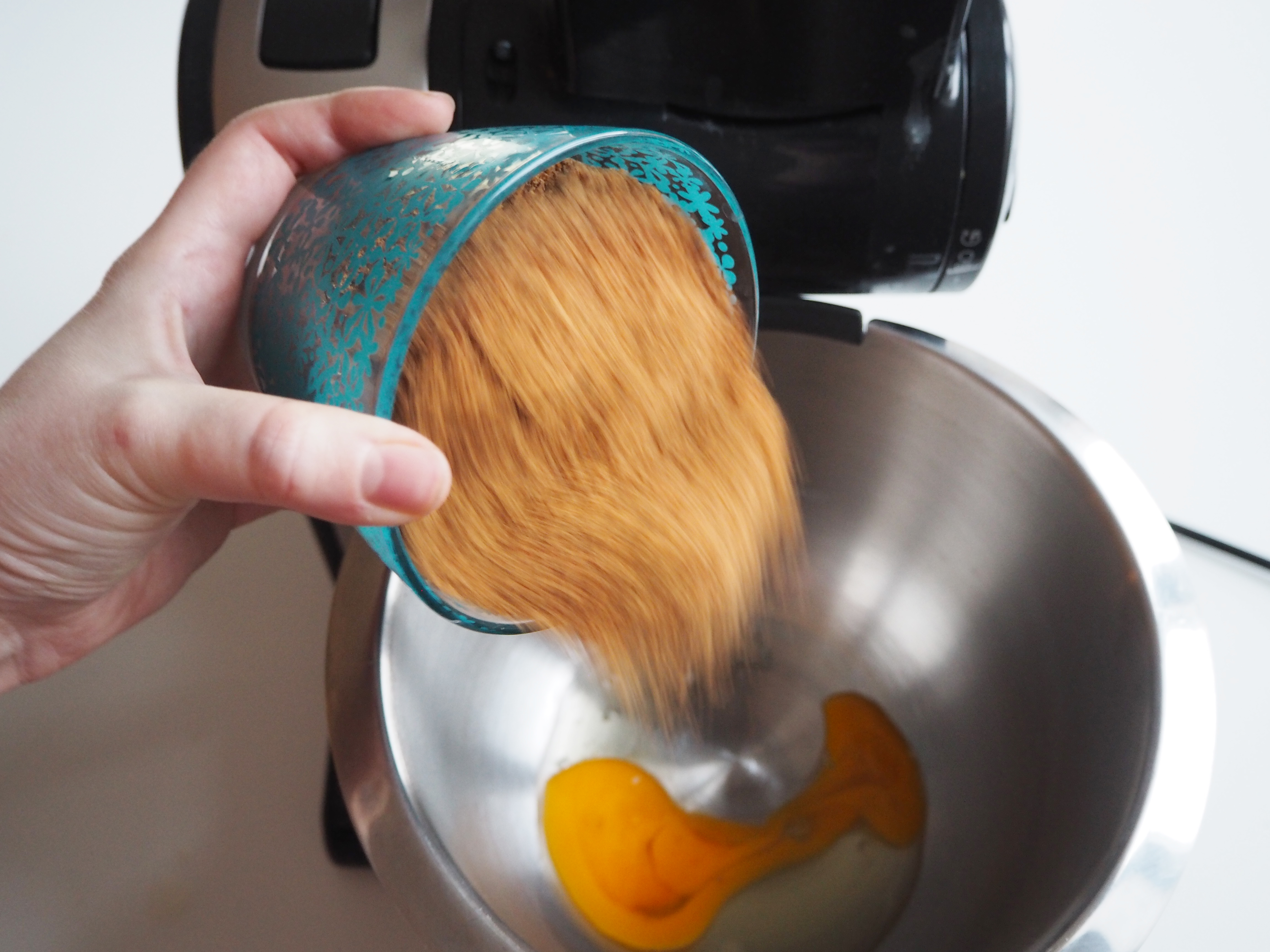 2. In a mixing bowl, put the egg and coconut sugar, and mix in medium speed until they incorporate.