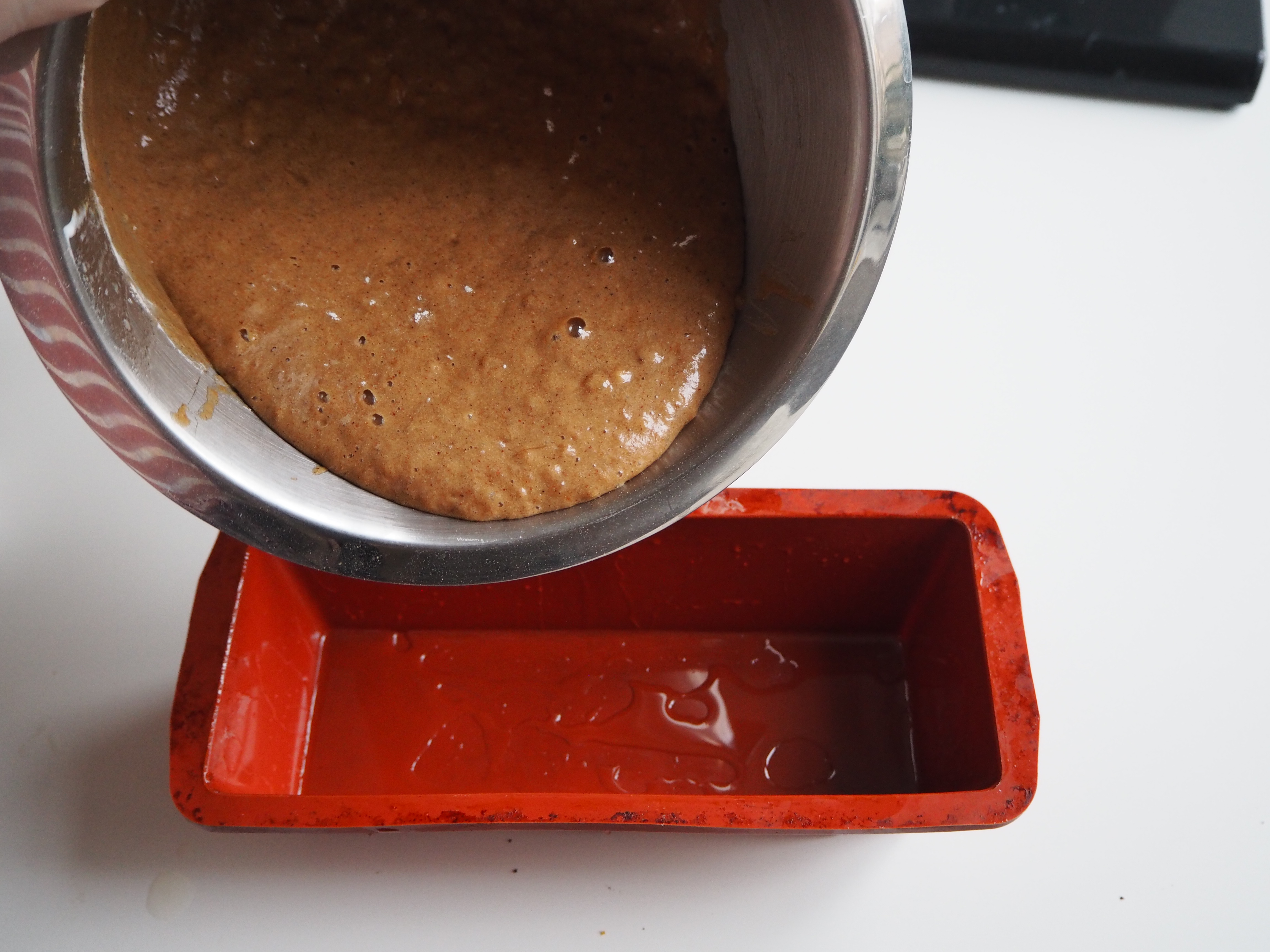 1. Preheat the oven to 160C. Grease your loaf mould with a little vegetable oil and put aside.