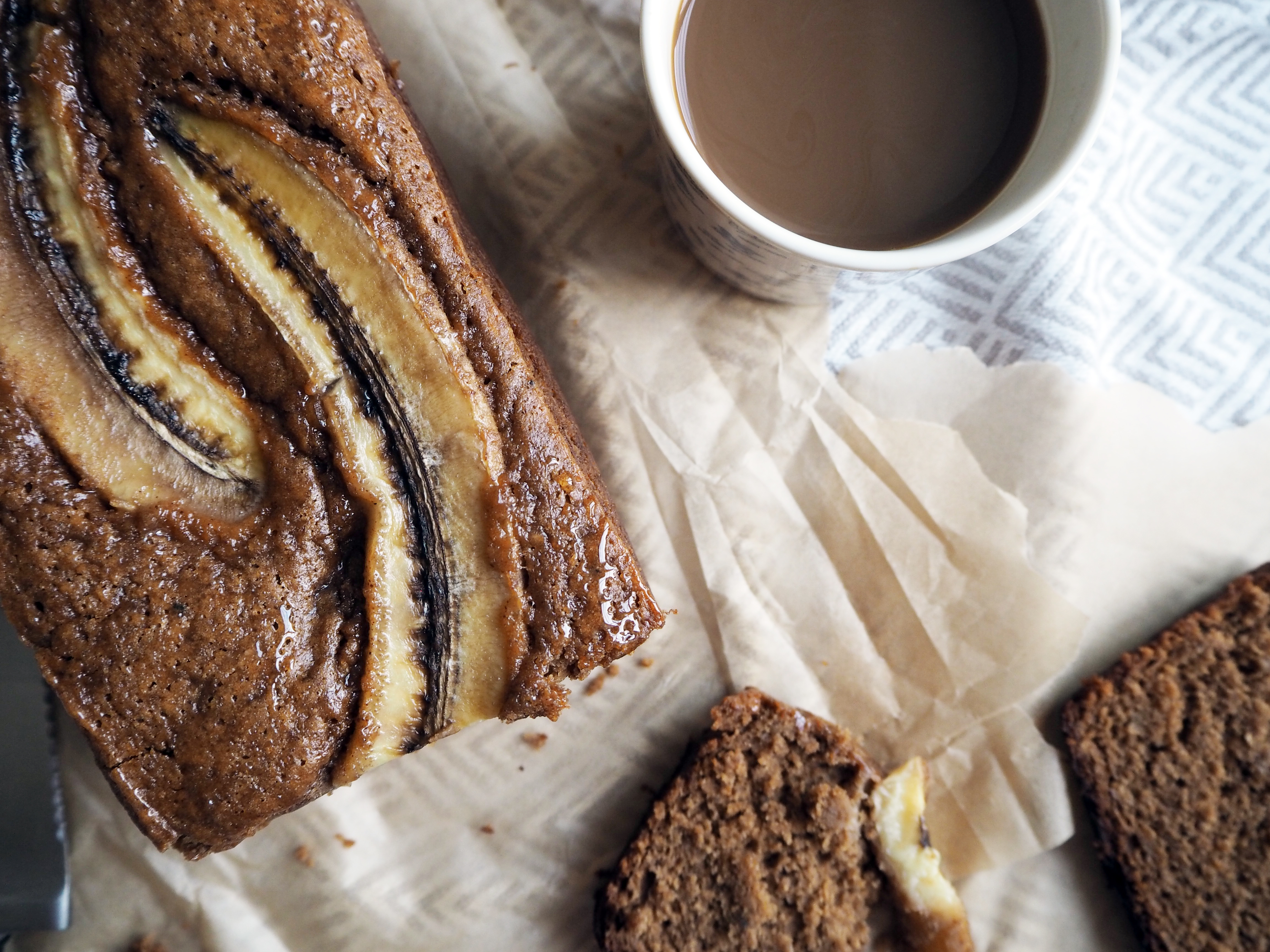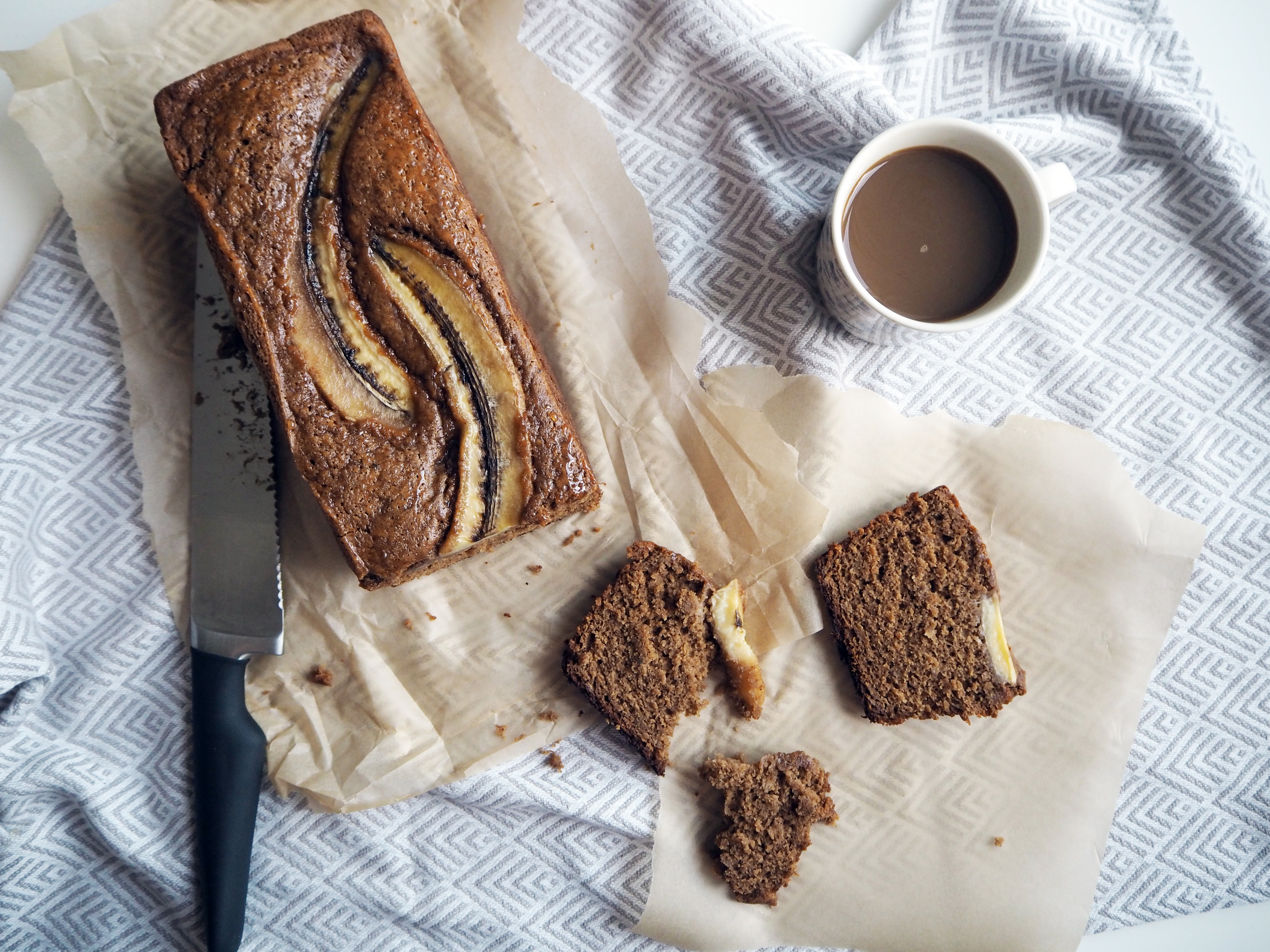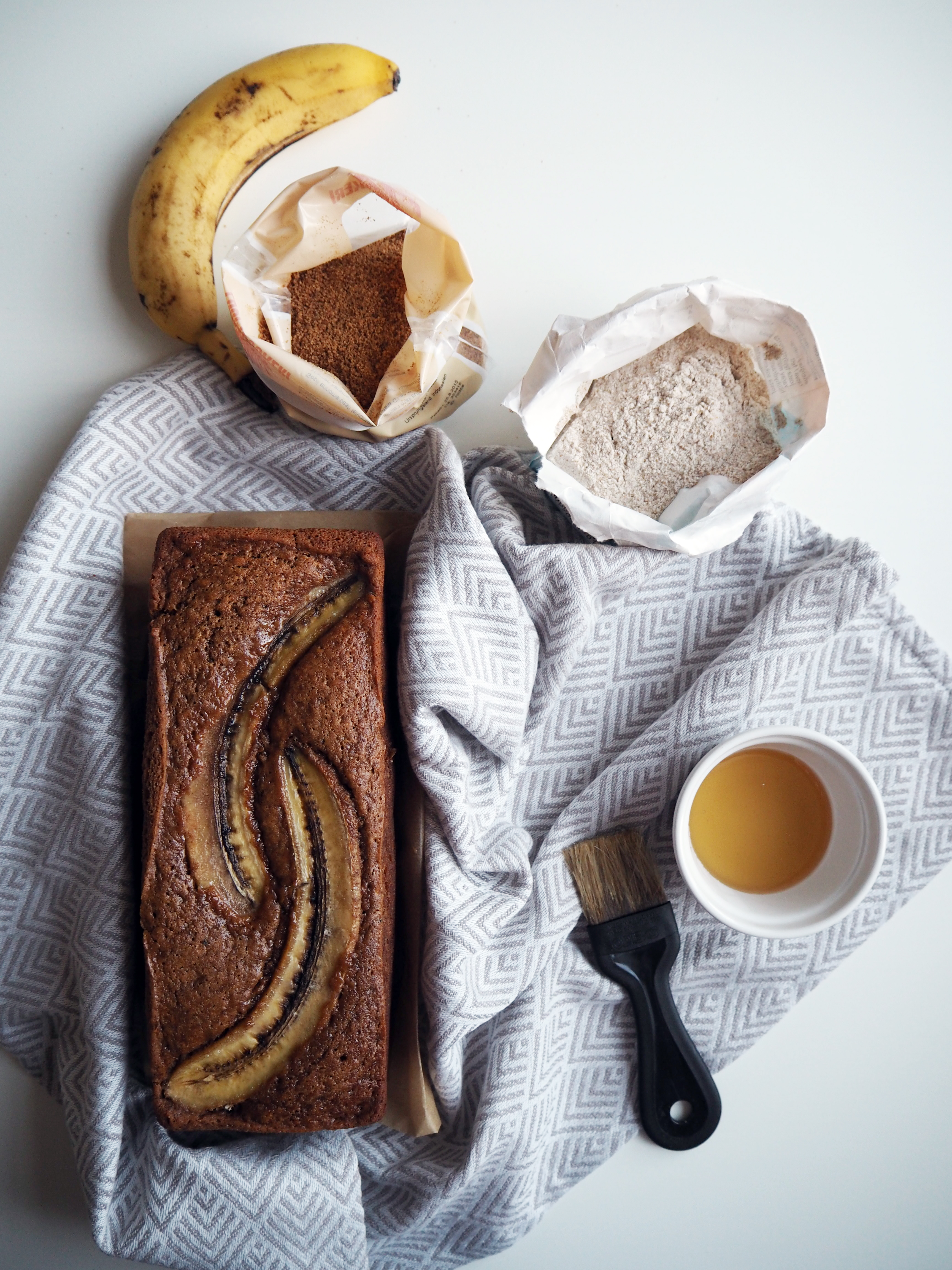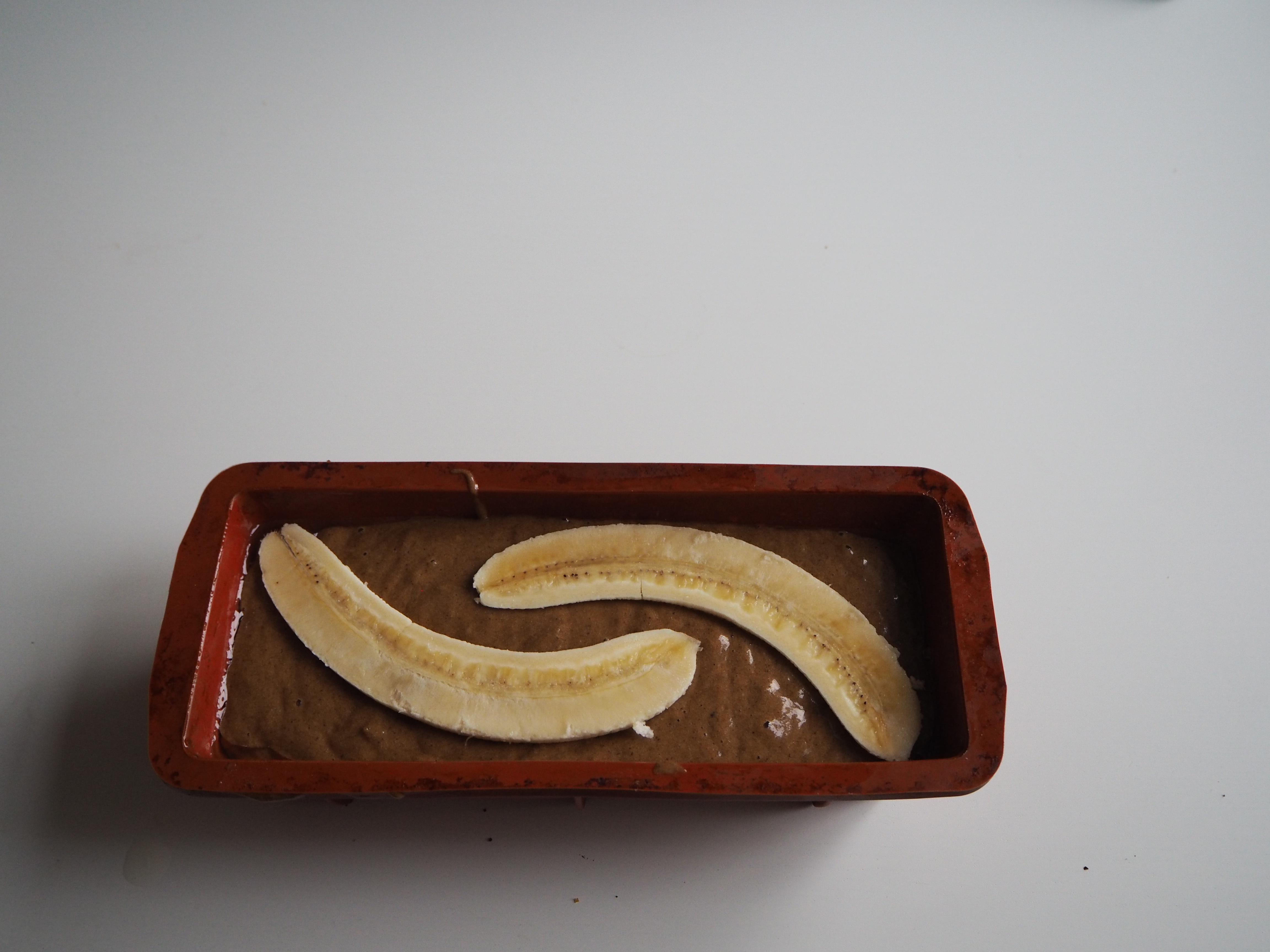 5. Peel that one extra banana and slice it in 2 pieces, put on top of the batter gently as seen in the photo (cut side looking up). Bake for 60 to 70 minutes in middle rack in your oven, until it gets brown on surface and when a toothpick inserted in the middle comes out clean. Once baked, take out of the oven and leave to cool for 5 minutes, then take out of the mould and cool a bit more before you slice and eat. Optionally, you can brush the surface with a little bit of rice syrup. Enjoy!