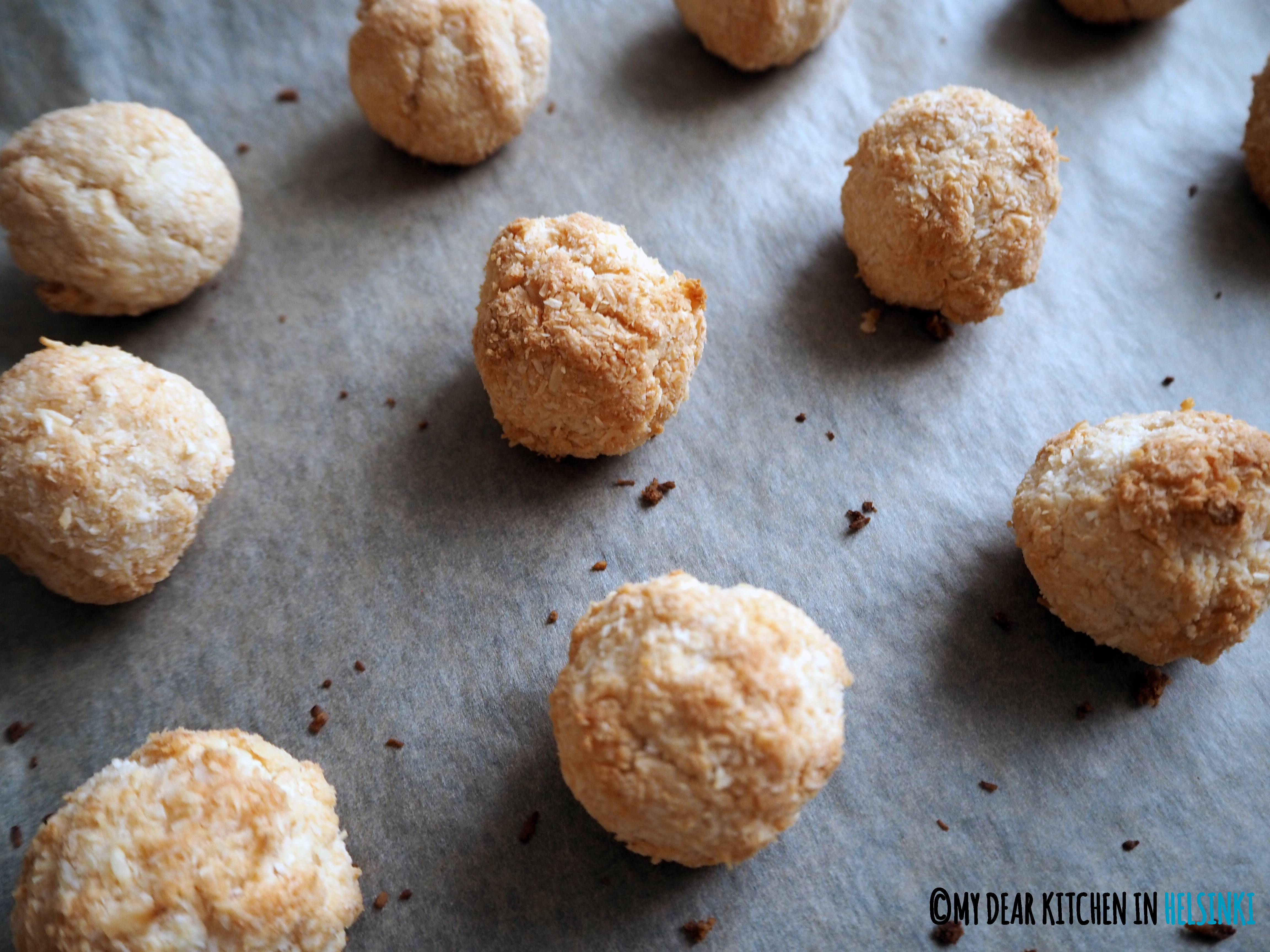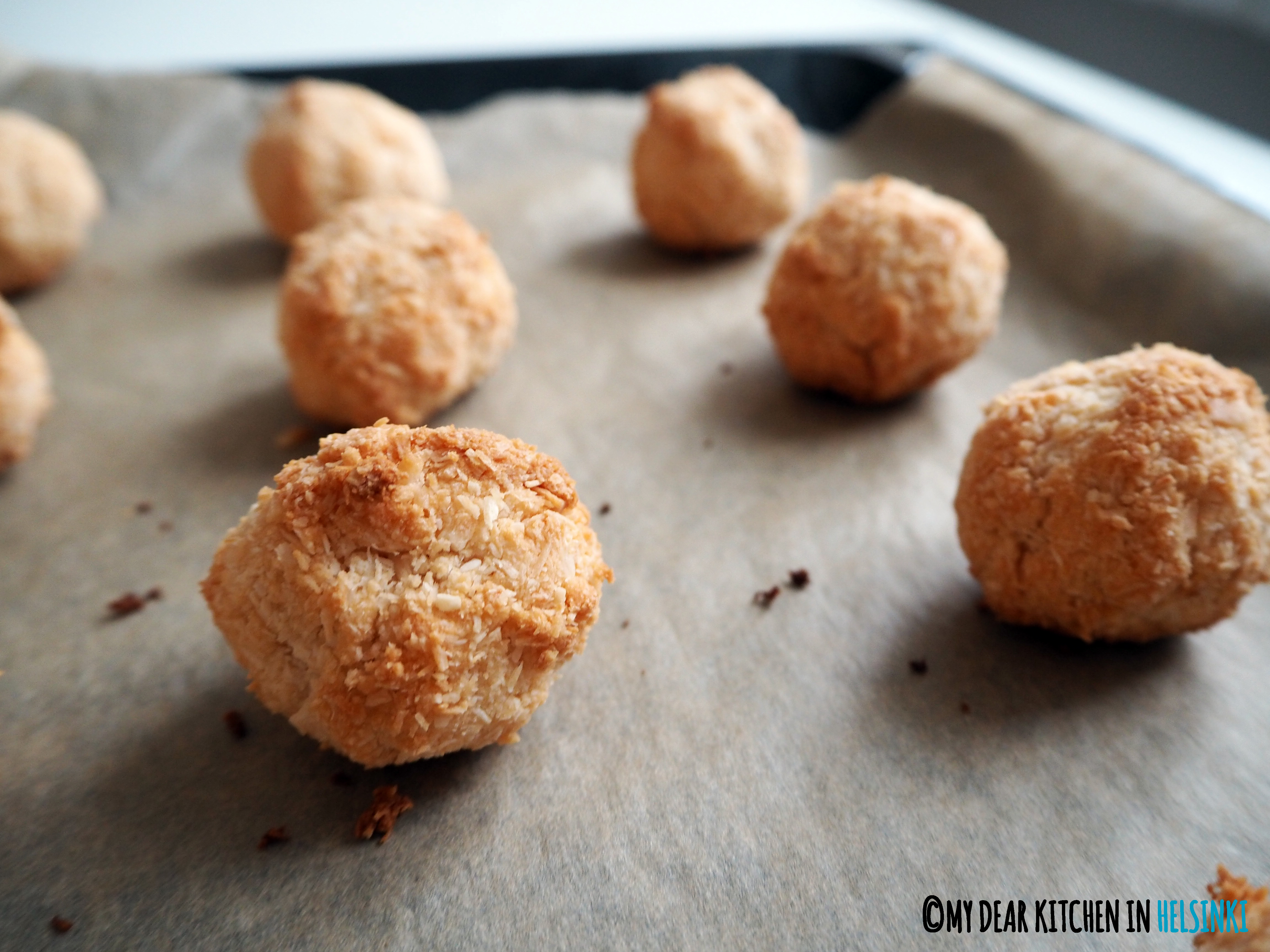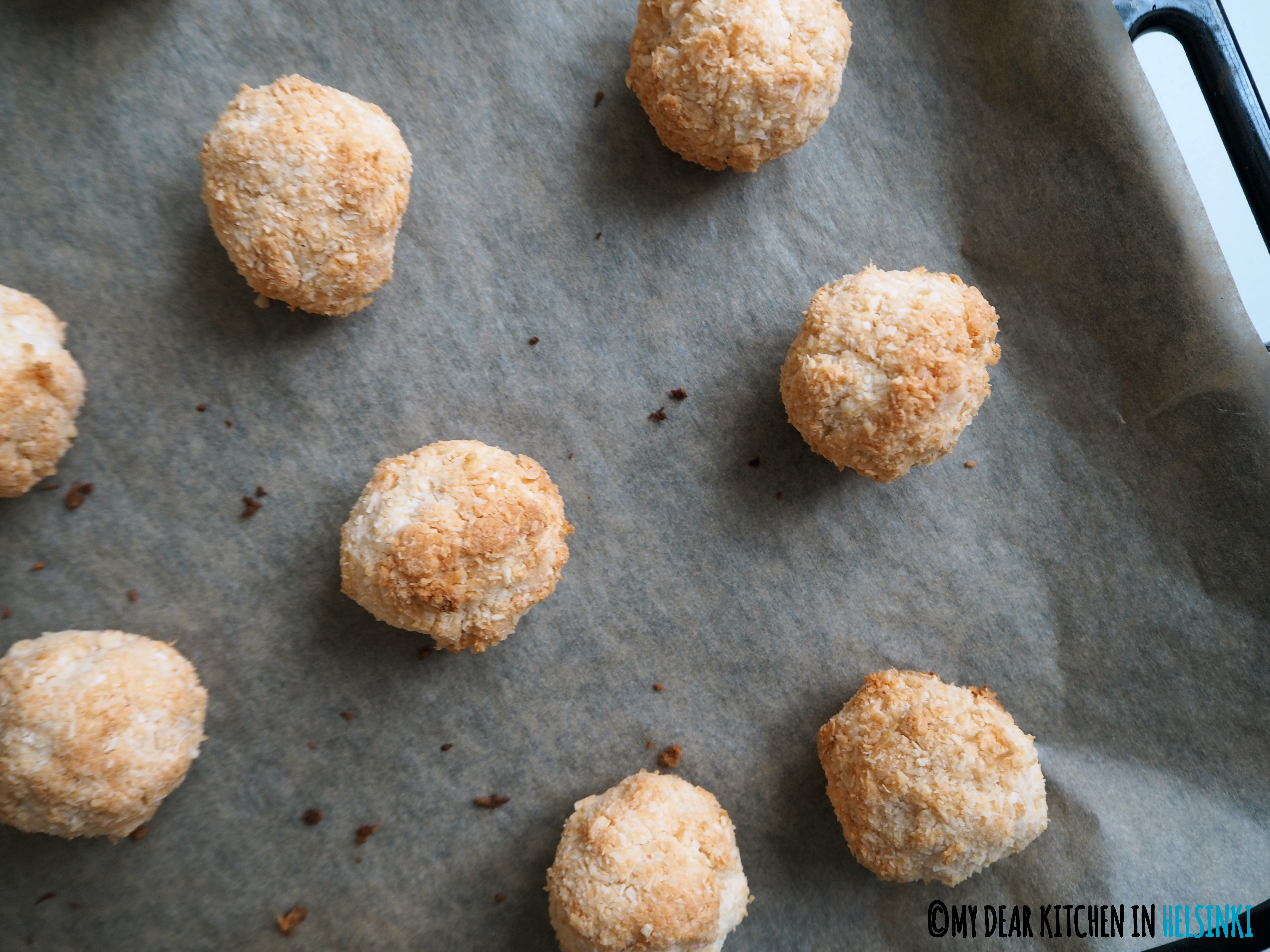 7. Take about a big walnut size piece from the dough and make balls. Put them on the baking paper, about 2 cm apart from each other. If you chilled the dough enough before, then they won’t spread, but it is still good to put them apart. Bake them about 20-25 minutes, or until macaroons get golden brown.