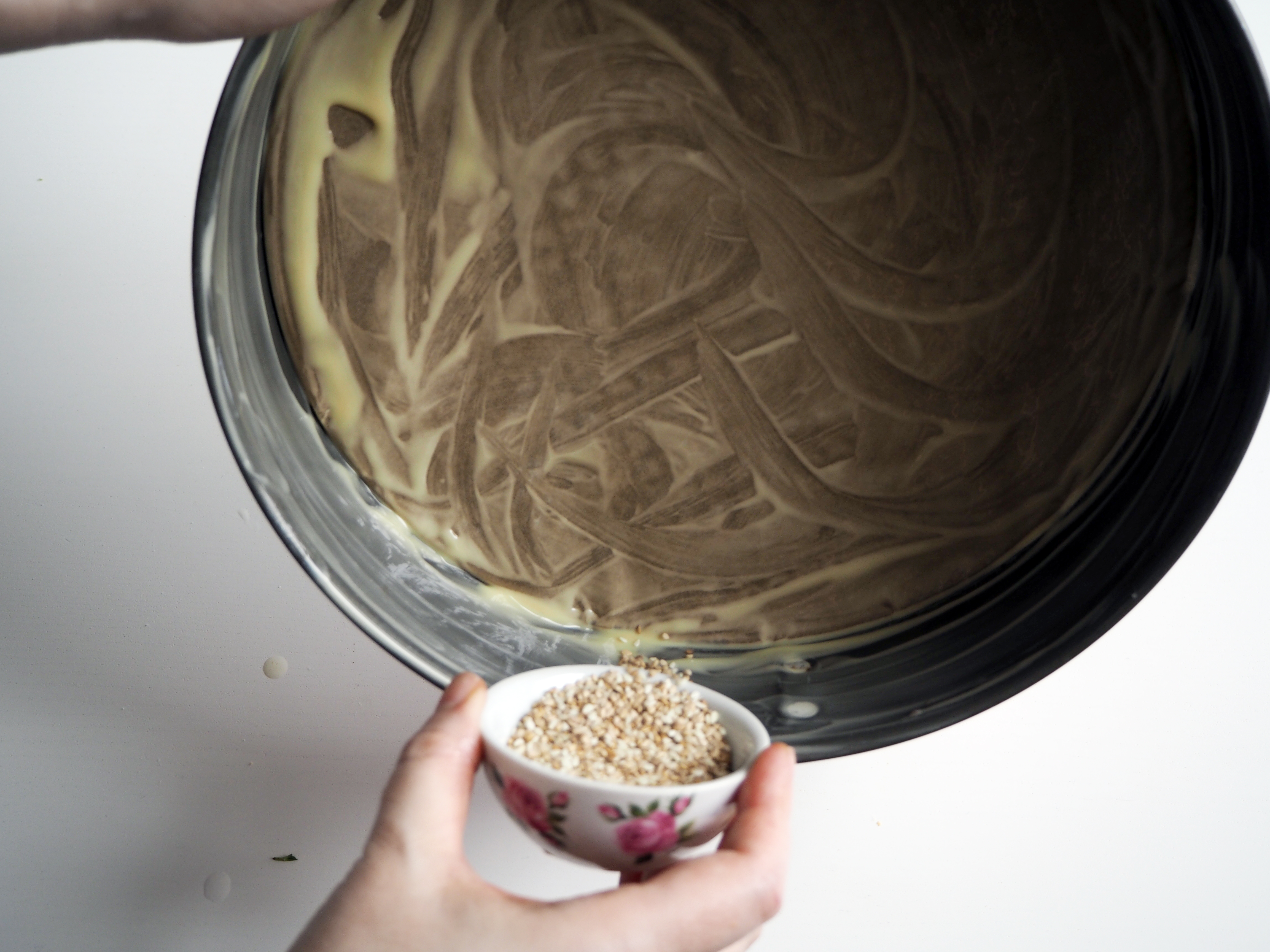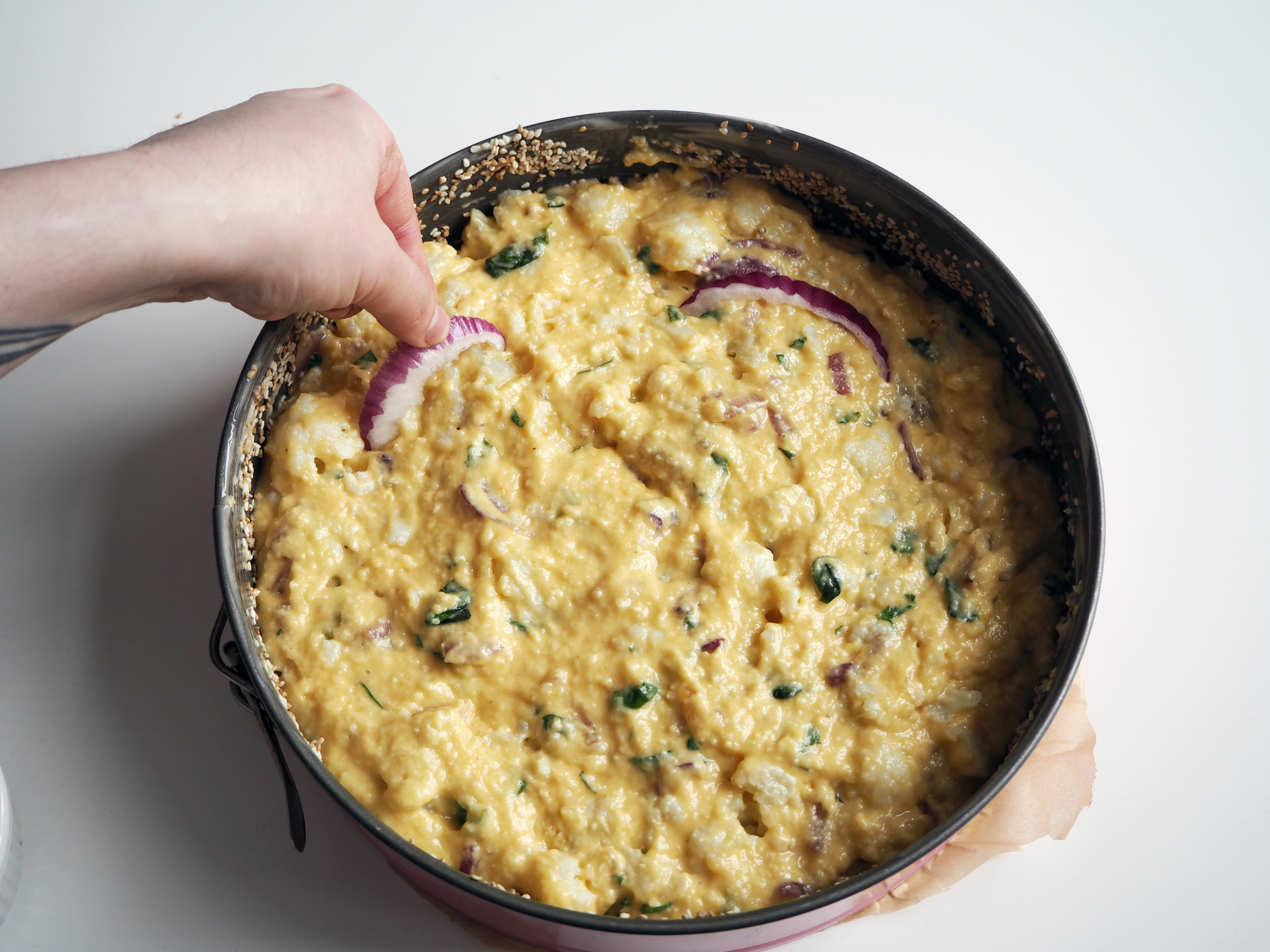 10. Grease a 24cm springform (or any other type) pan with soft or melted butter. Sprinkle and cover the sides with sesame seeds.