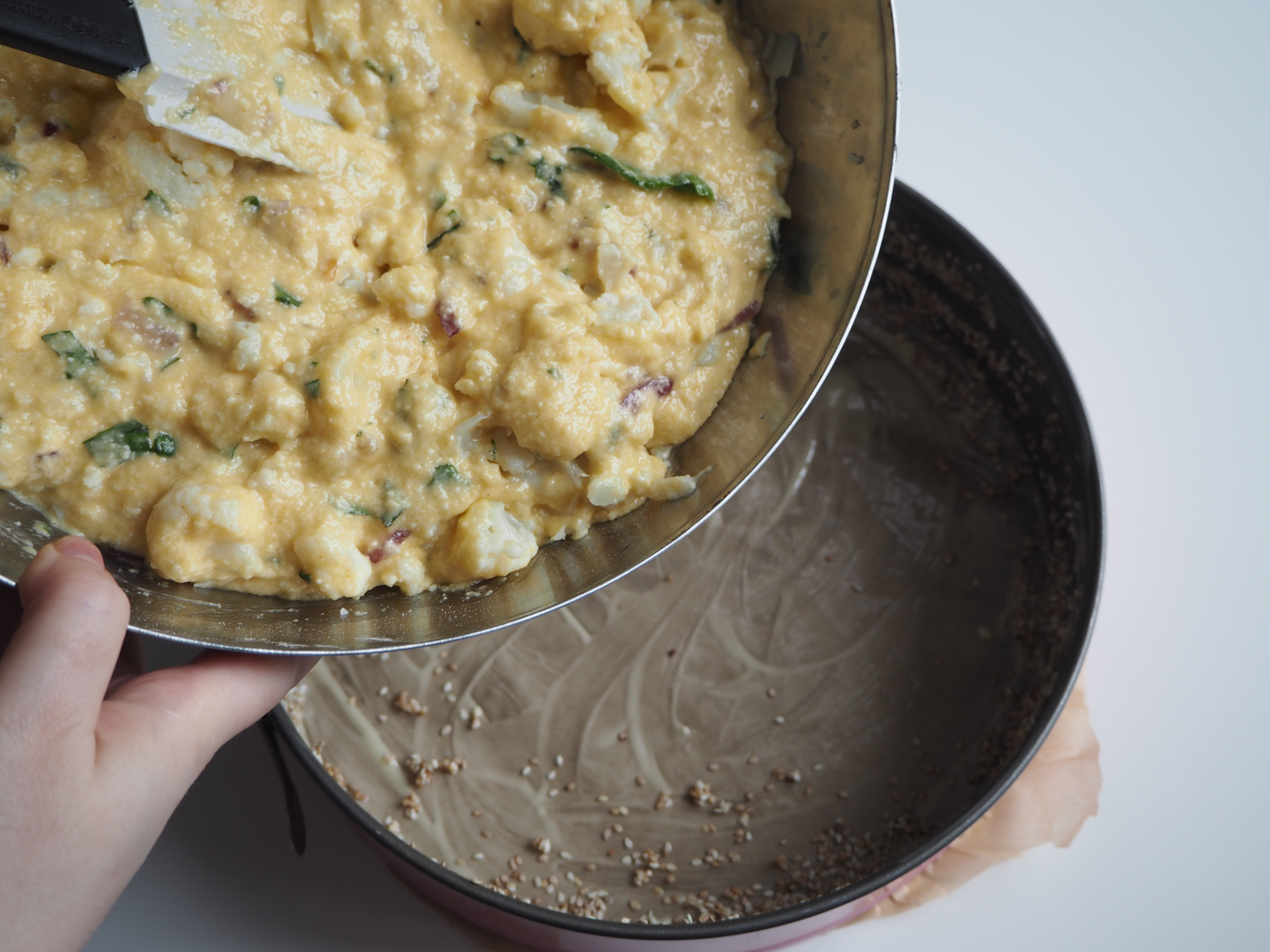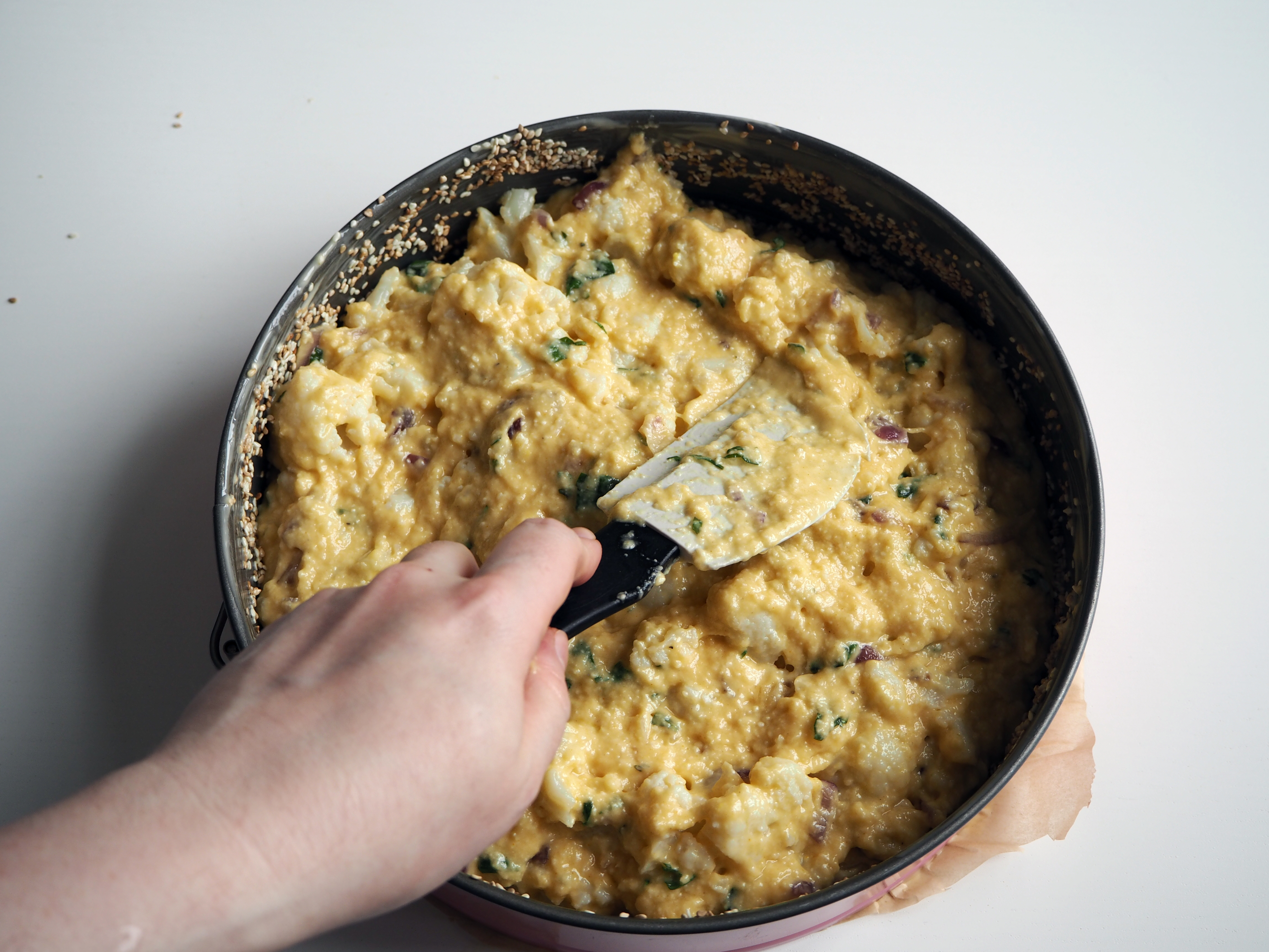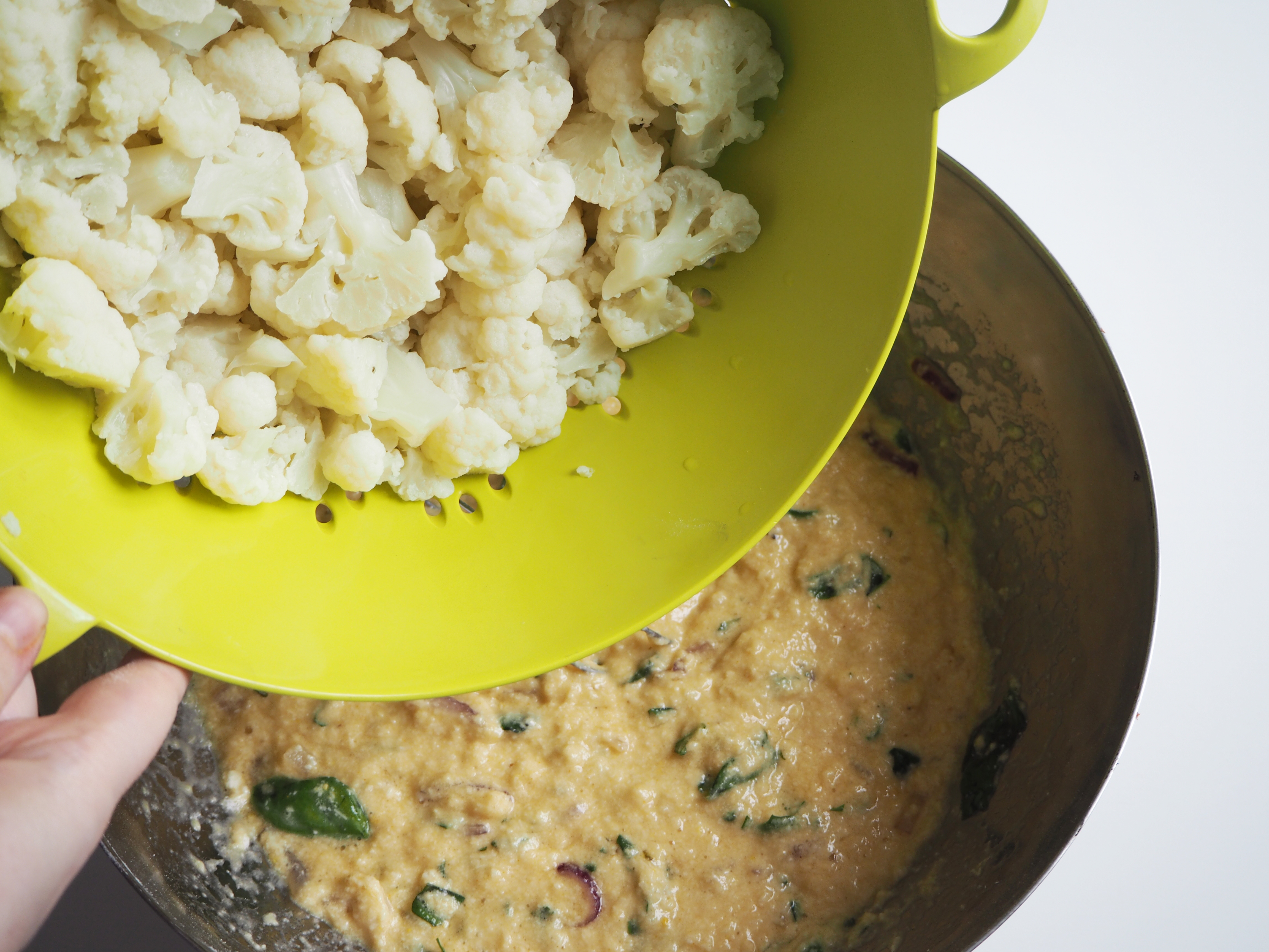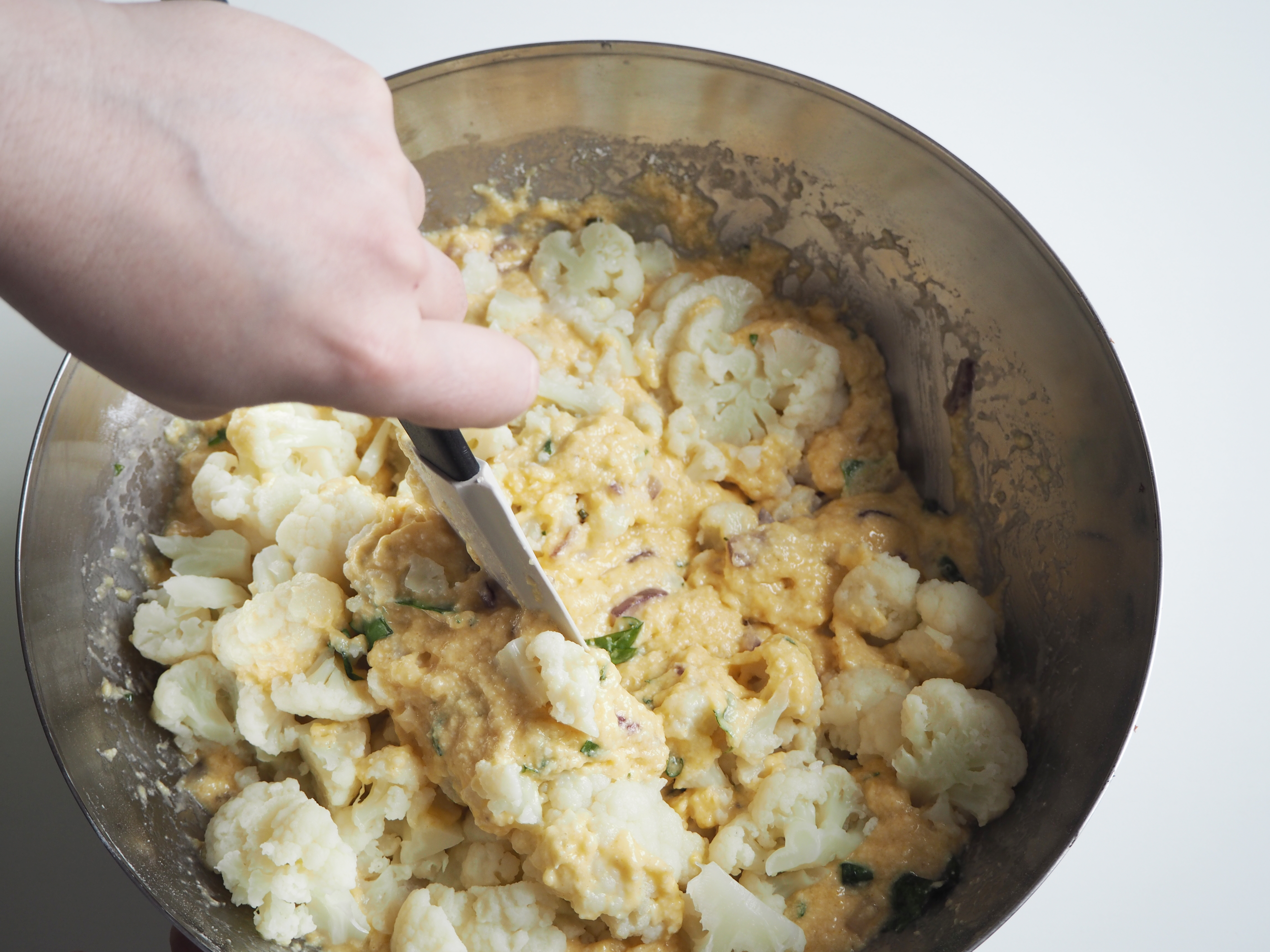 9. Add cauliflower and fold.