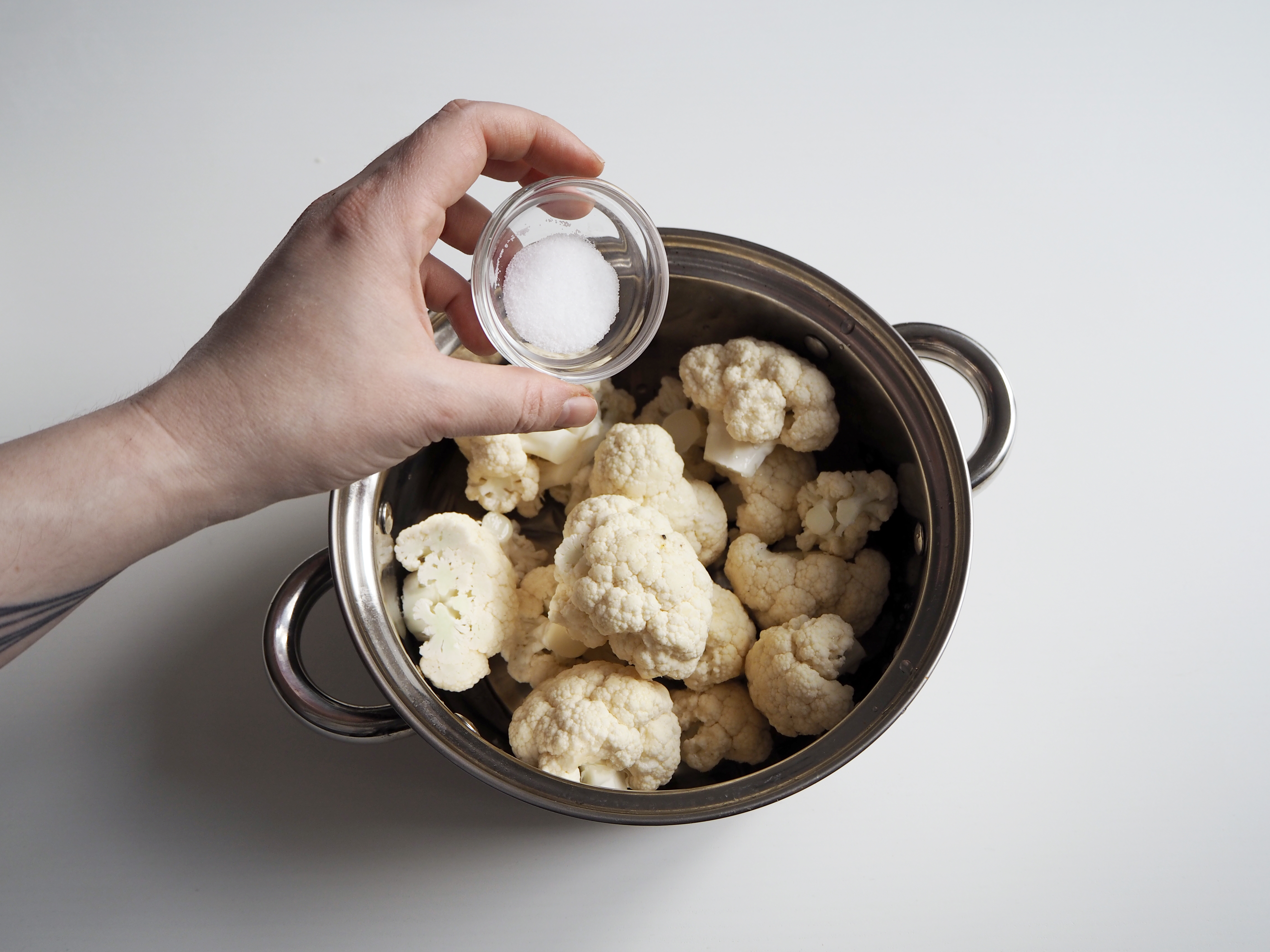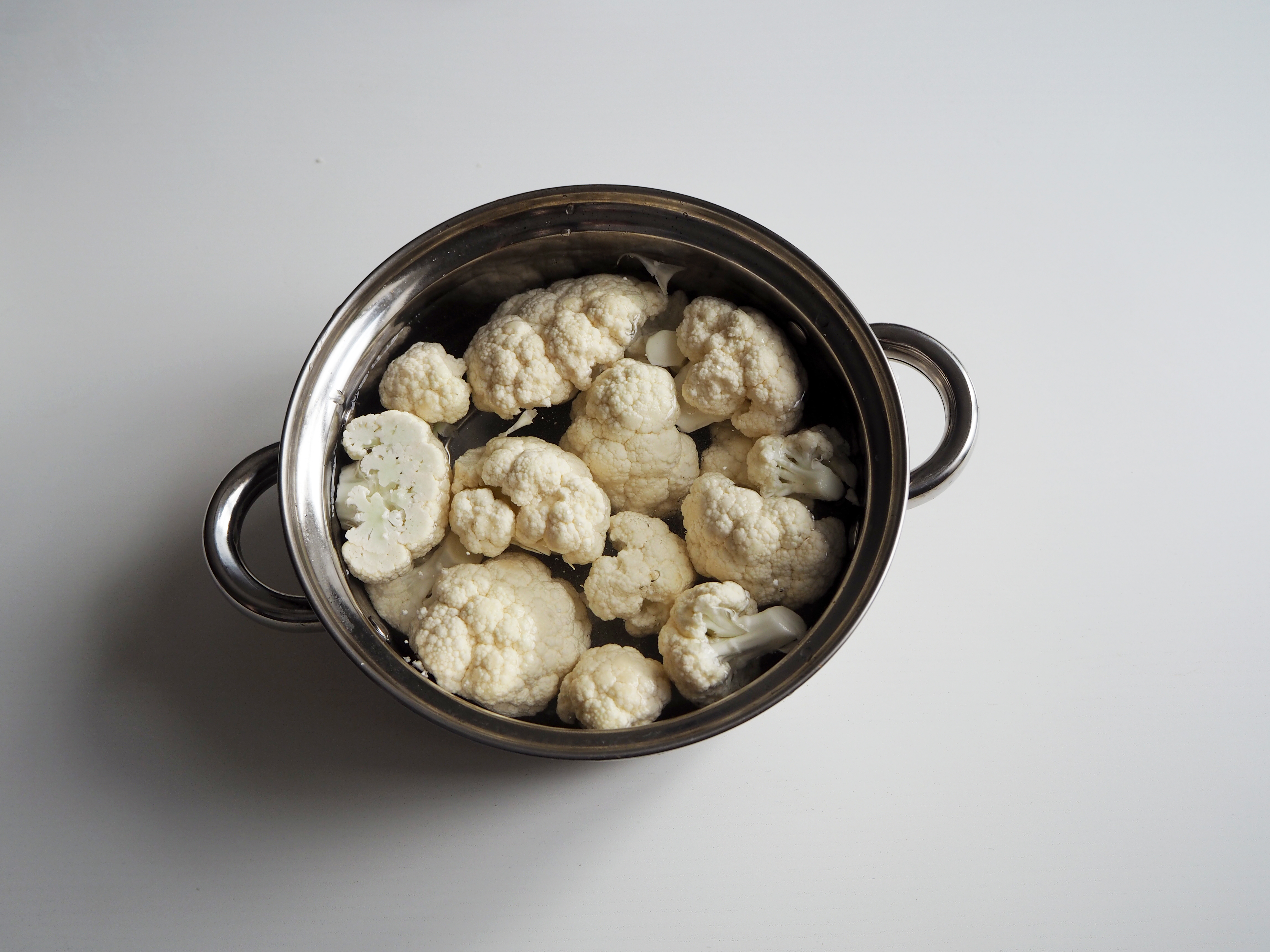 2. In a medium pan, put cauliflower and 1 tsp salt, cover with water. Cook cauliflower until it is soft. Strain and set aside.