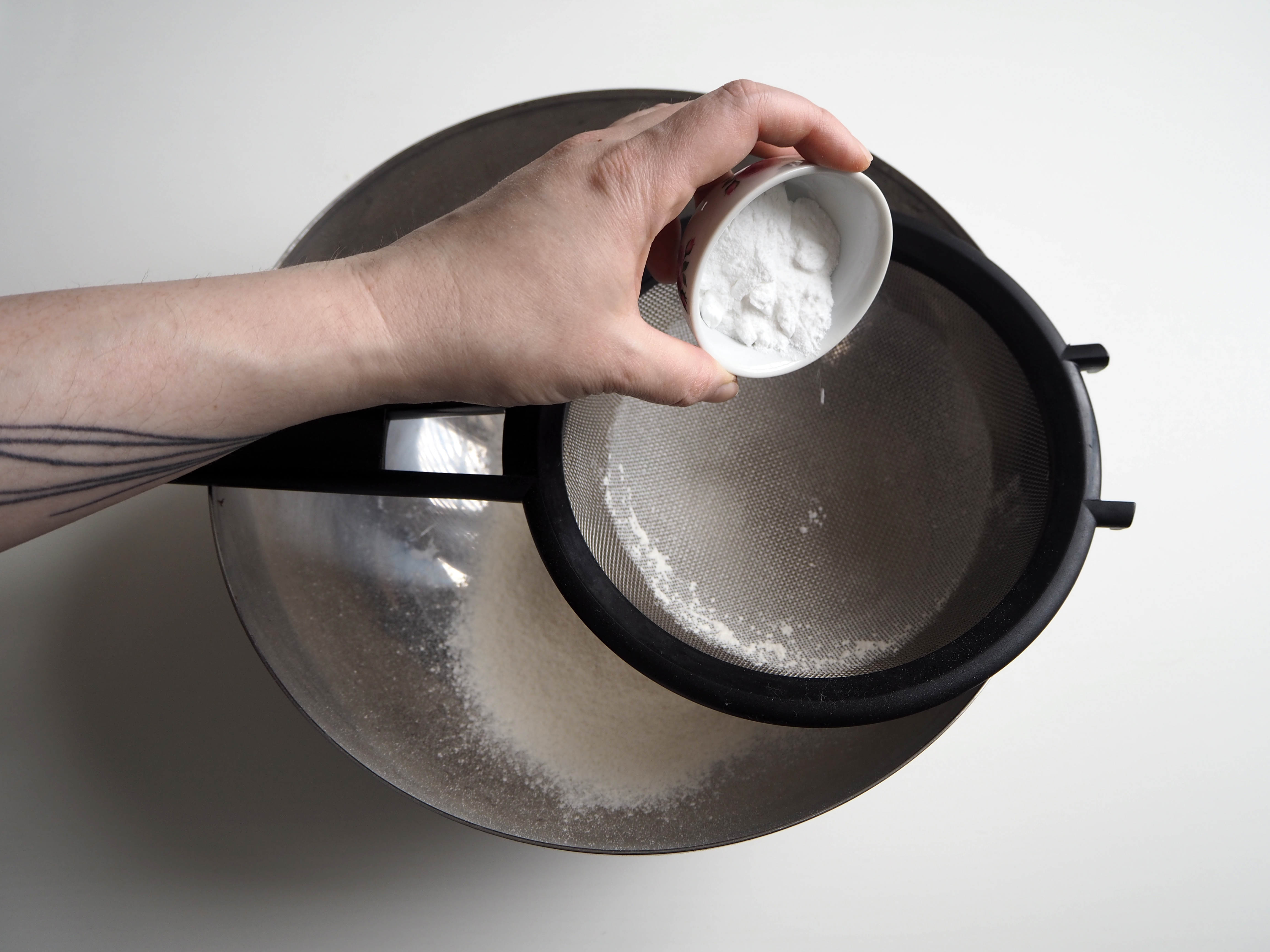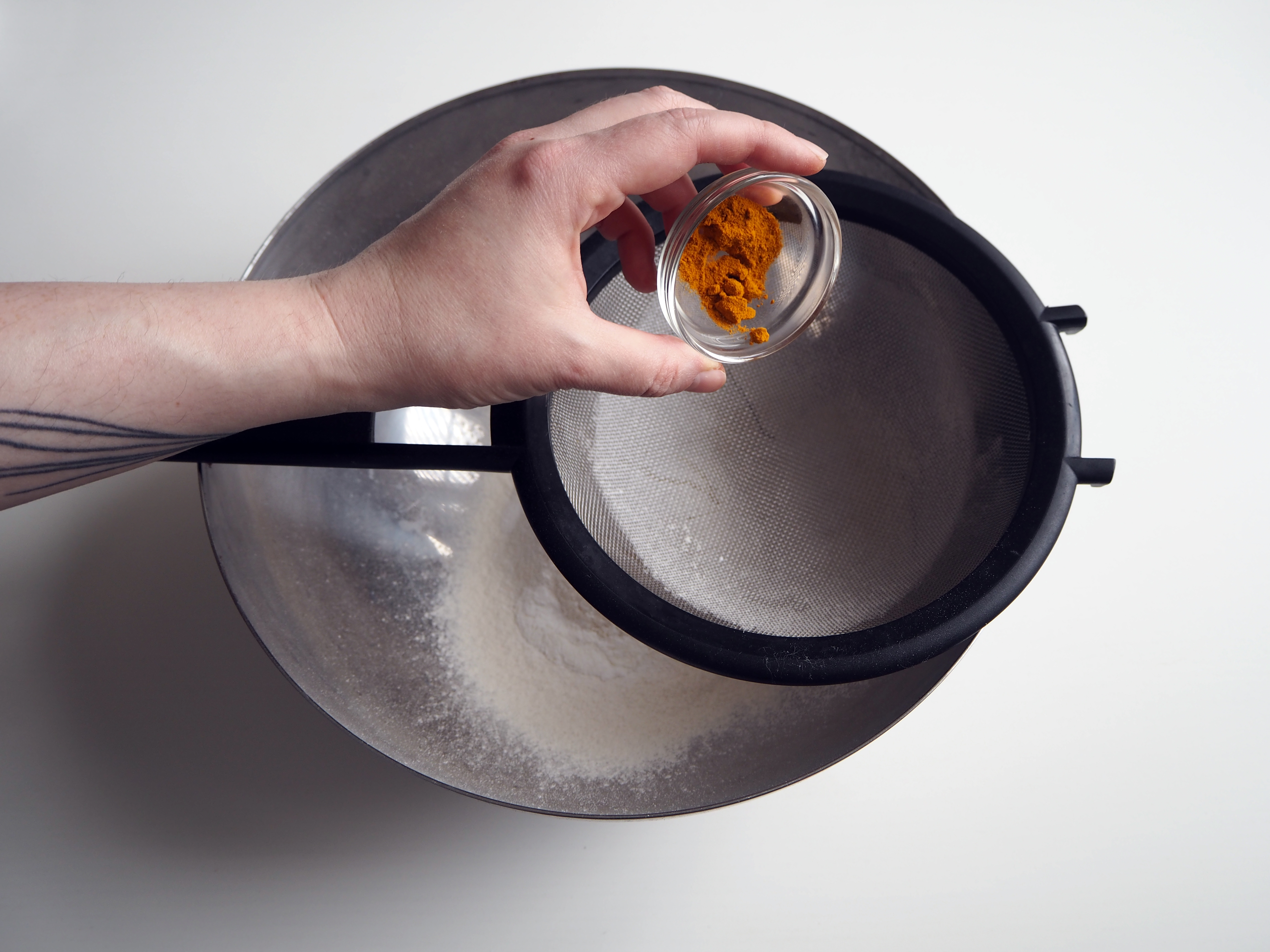 3. In a mixing bowl, sift flour, baking powder and turmeric.