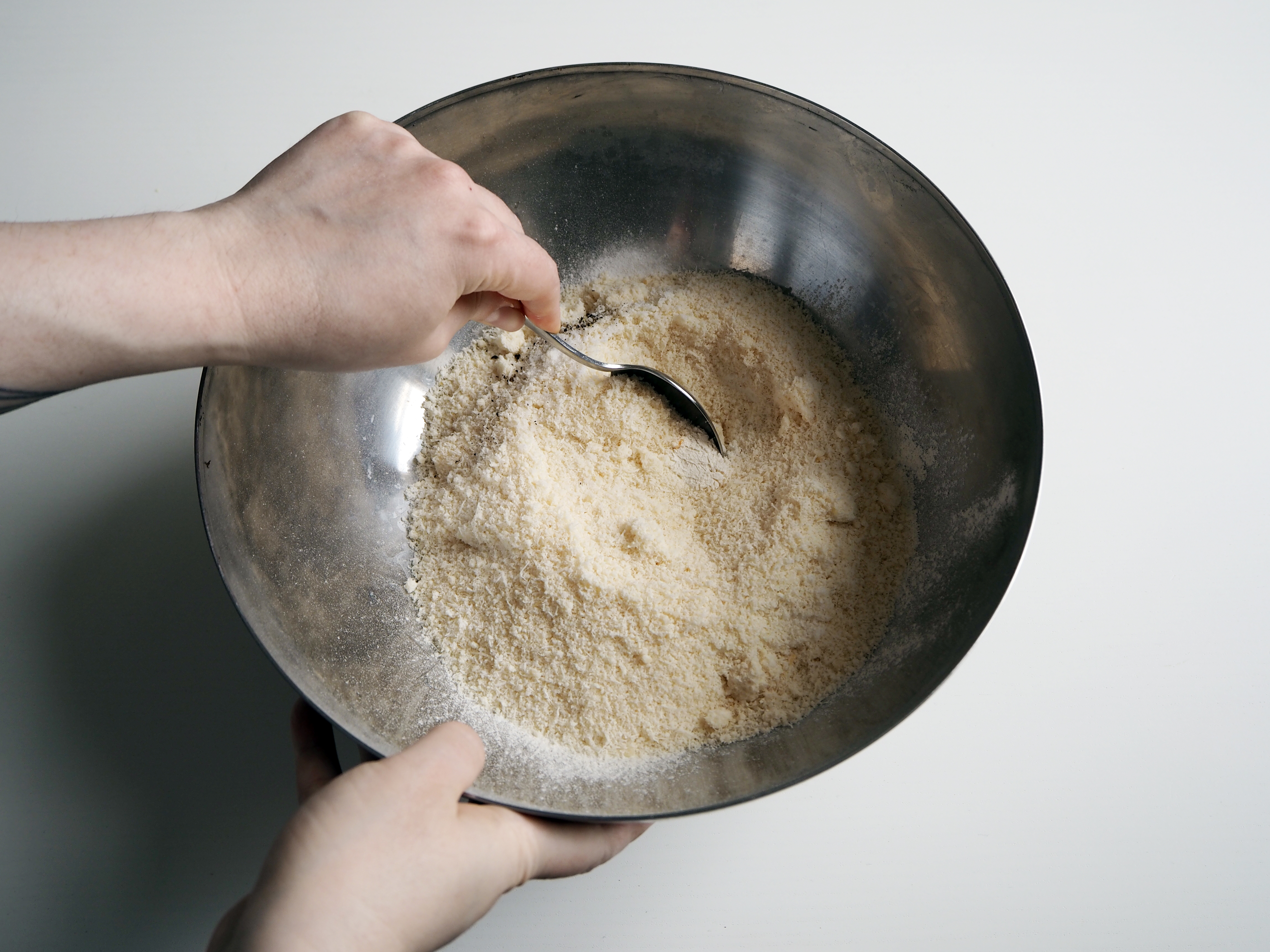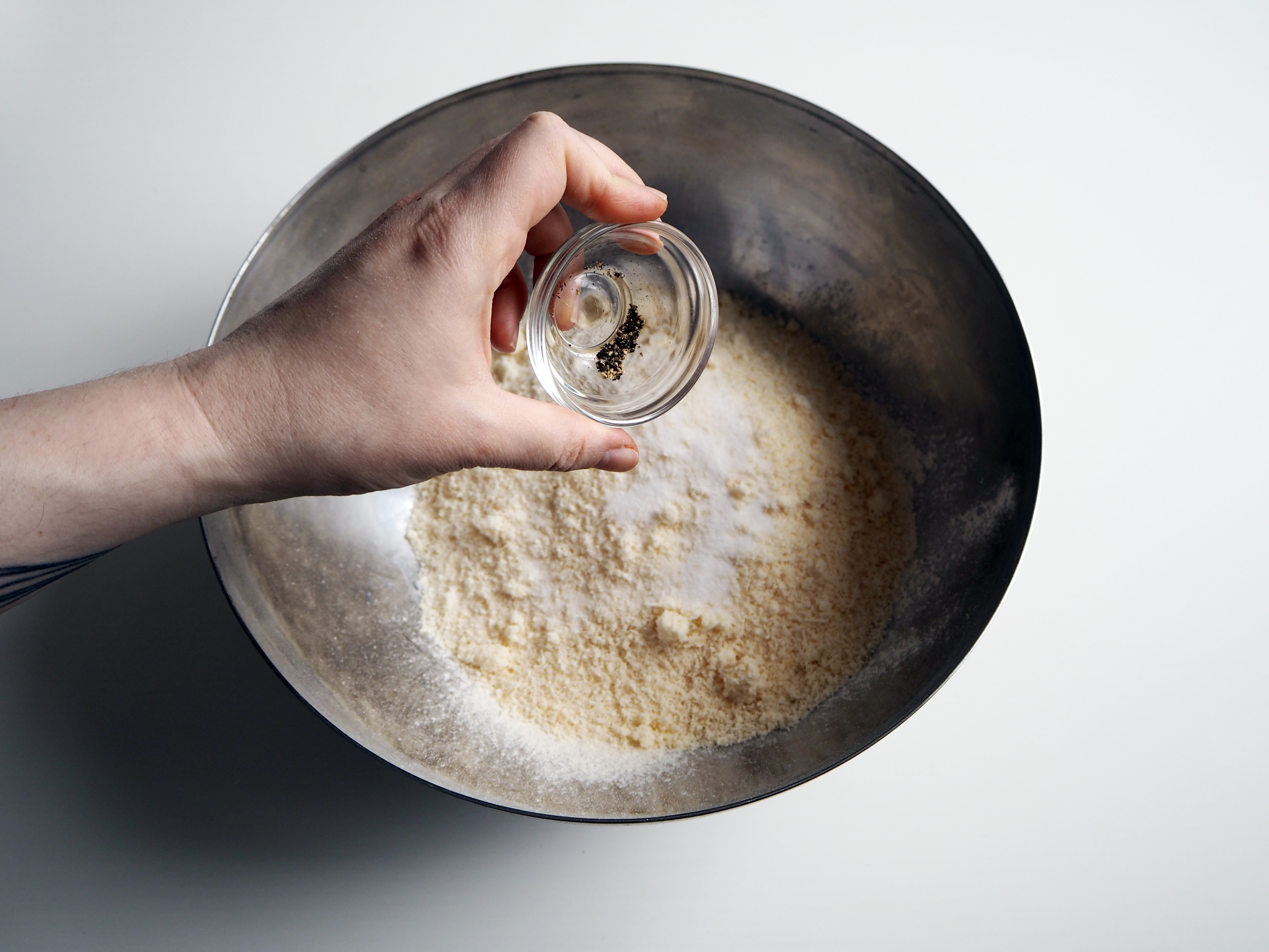 4. To the flour mixture, add grated parmesan, 1.5 tsp salt and black pepper; mix a little.