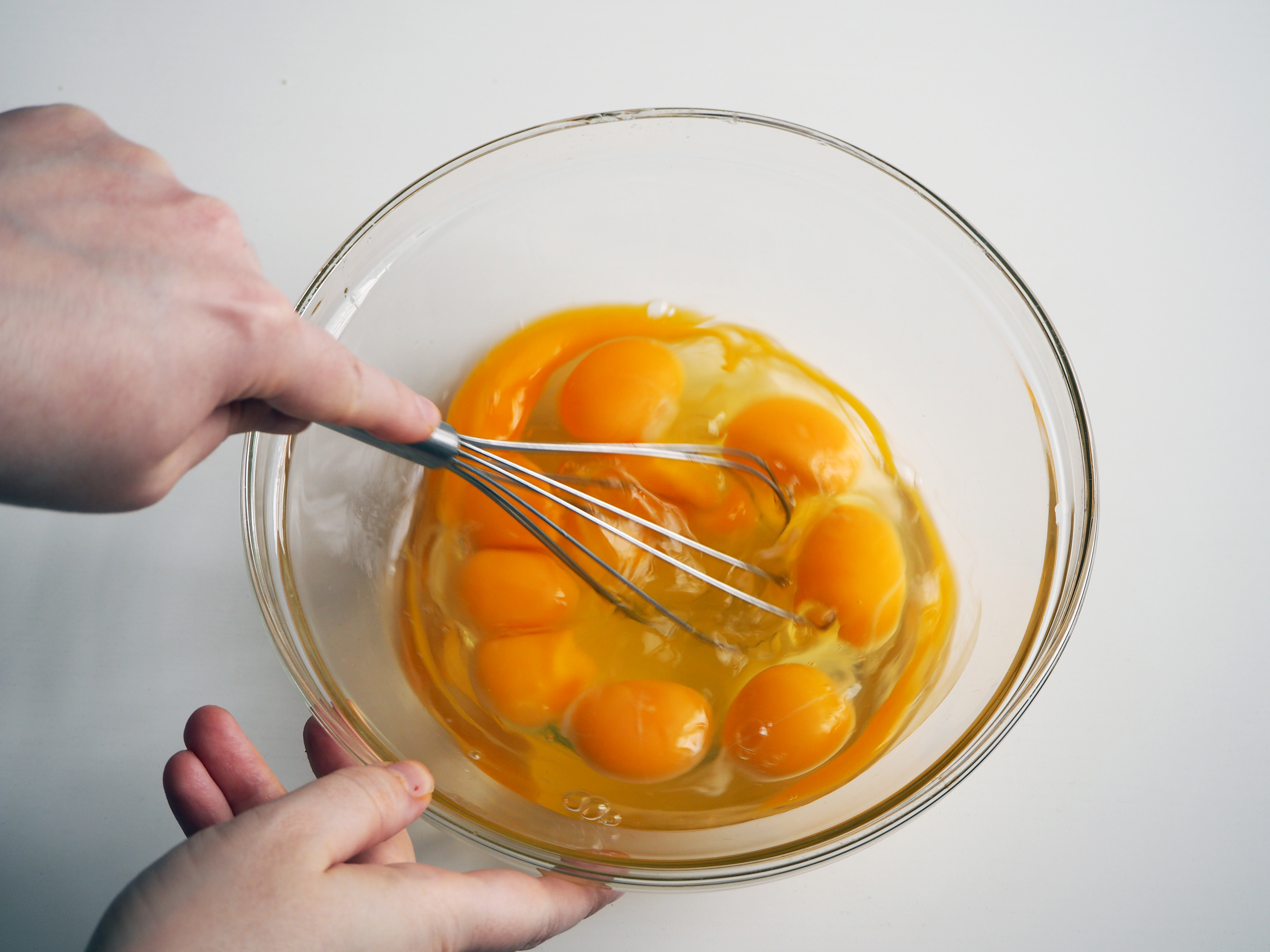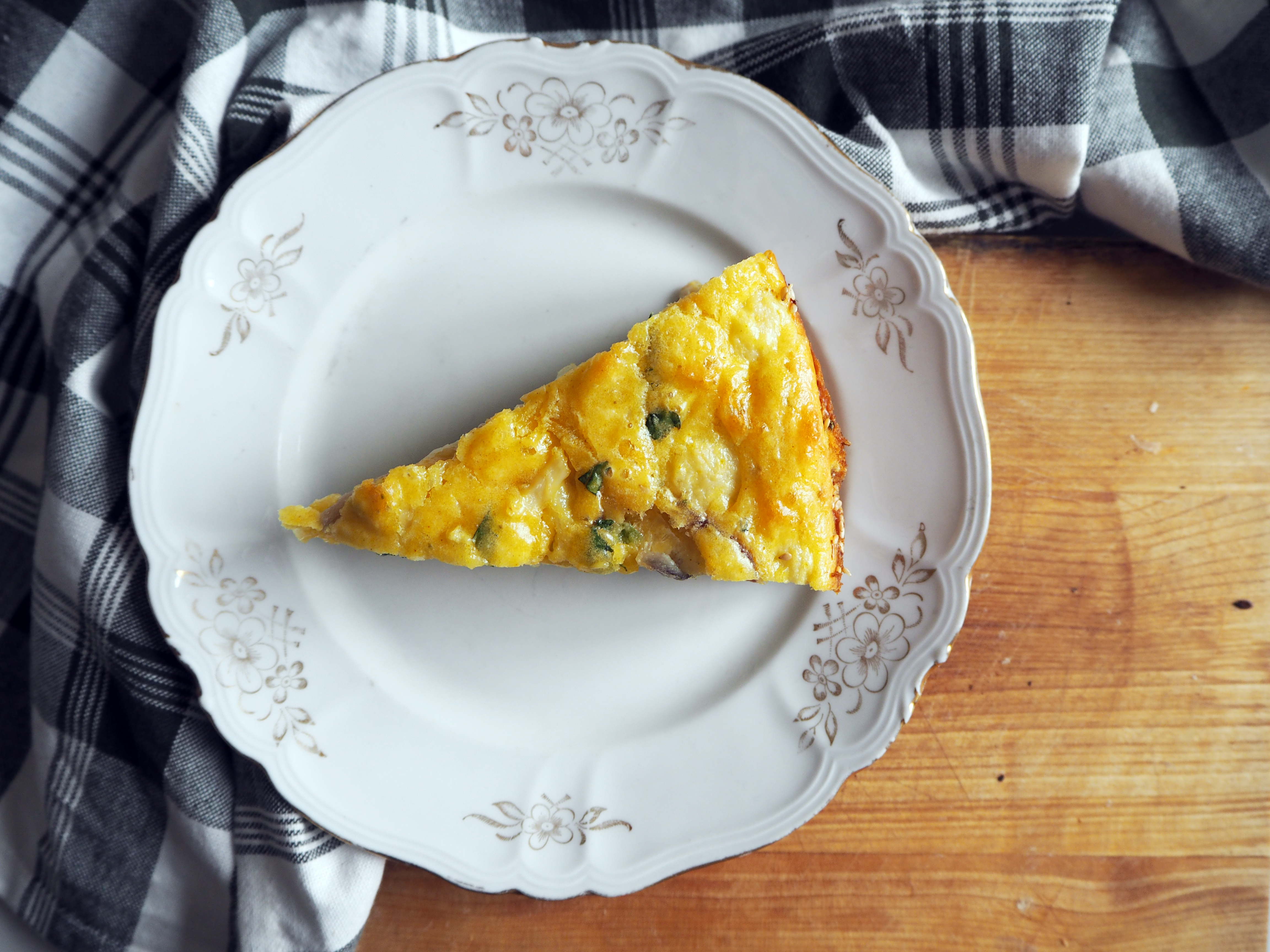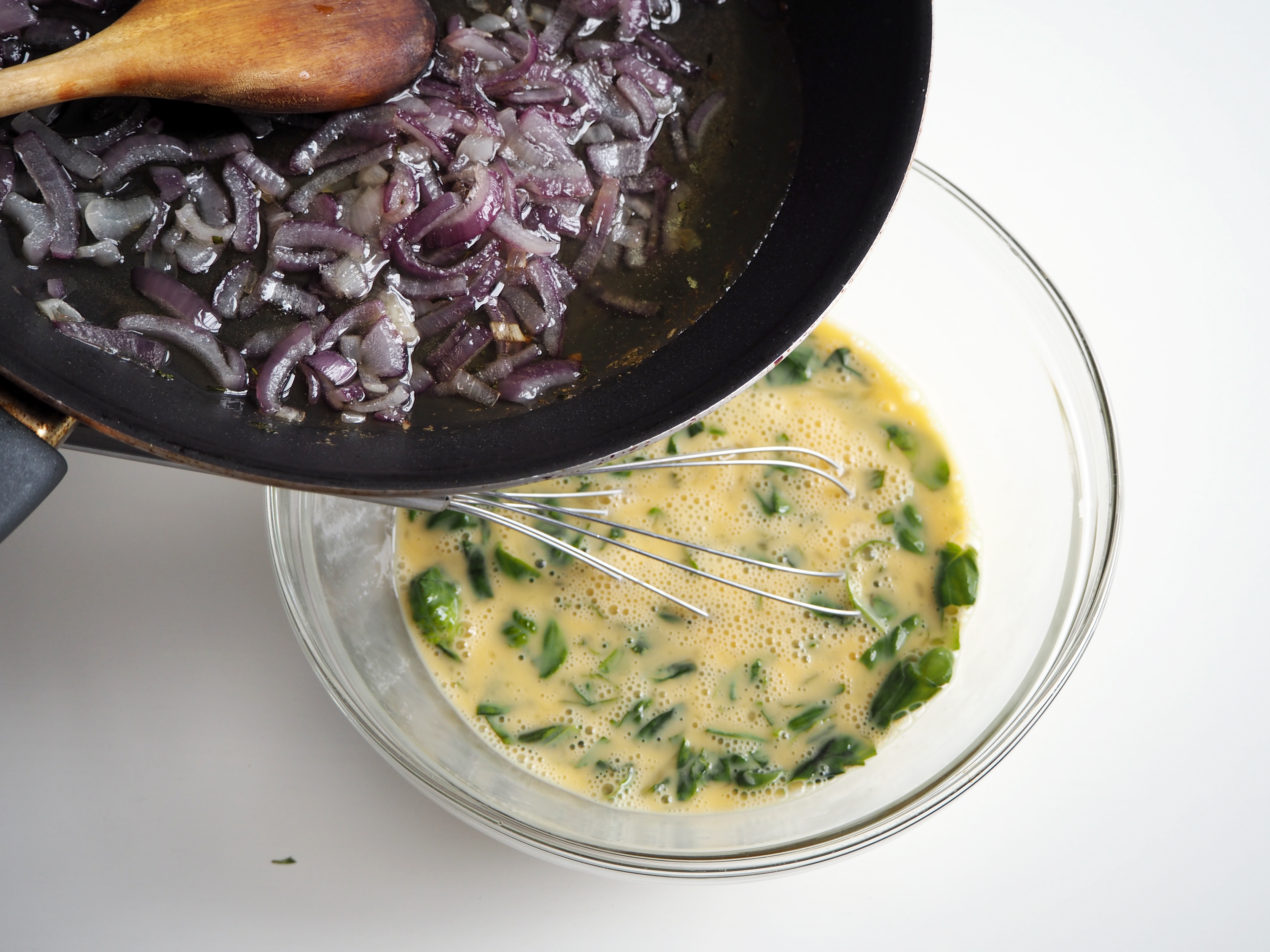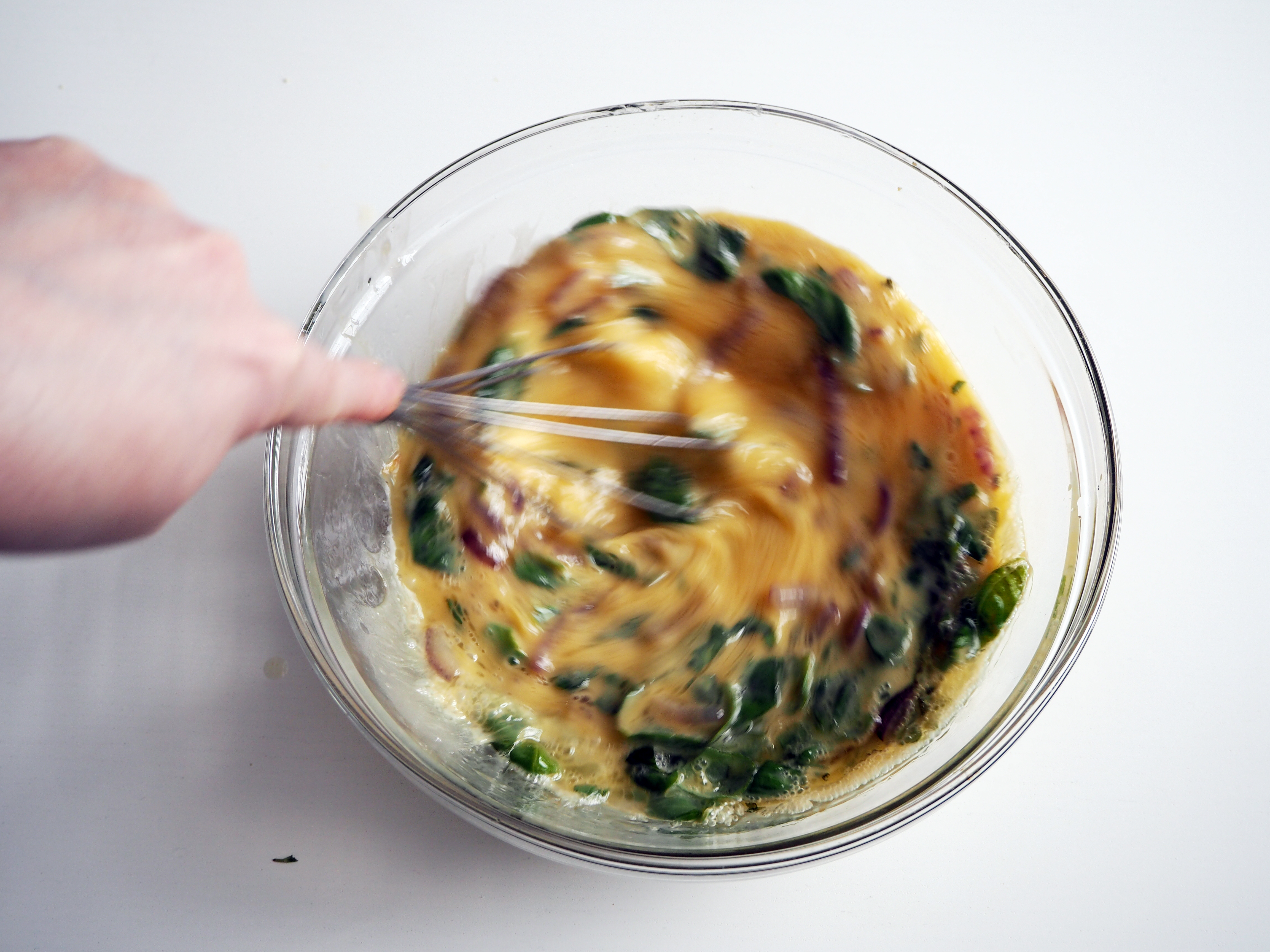 7. Add onion mixture to whisked eggs/basil mixture – if onion mixture is still warm, make sure that you continually whisk while adding it to eggs, so that you don’t end up with scrambled eggs.