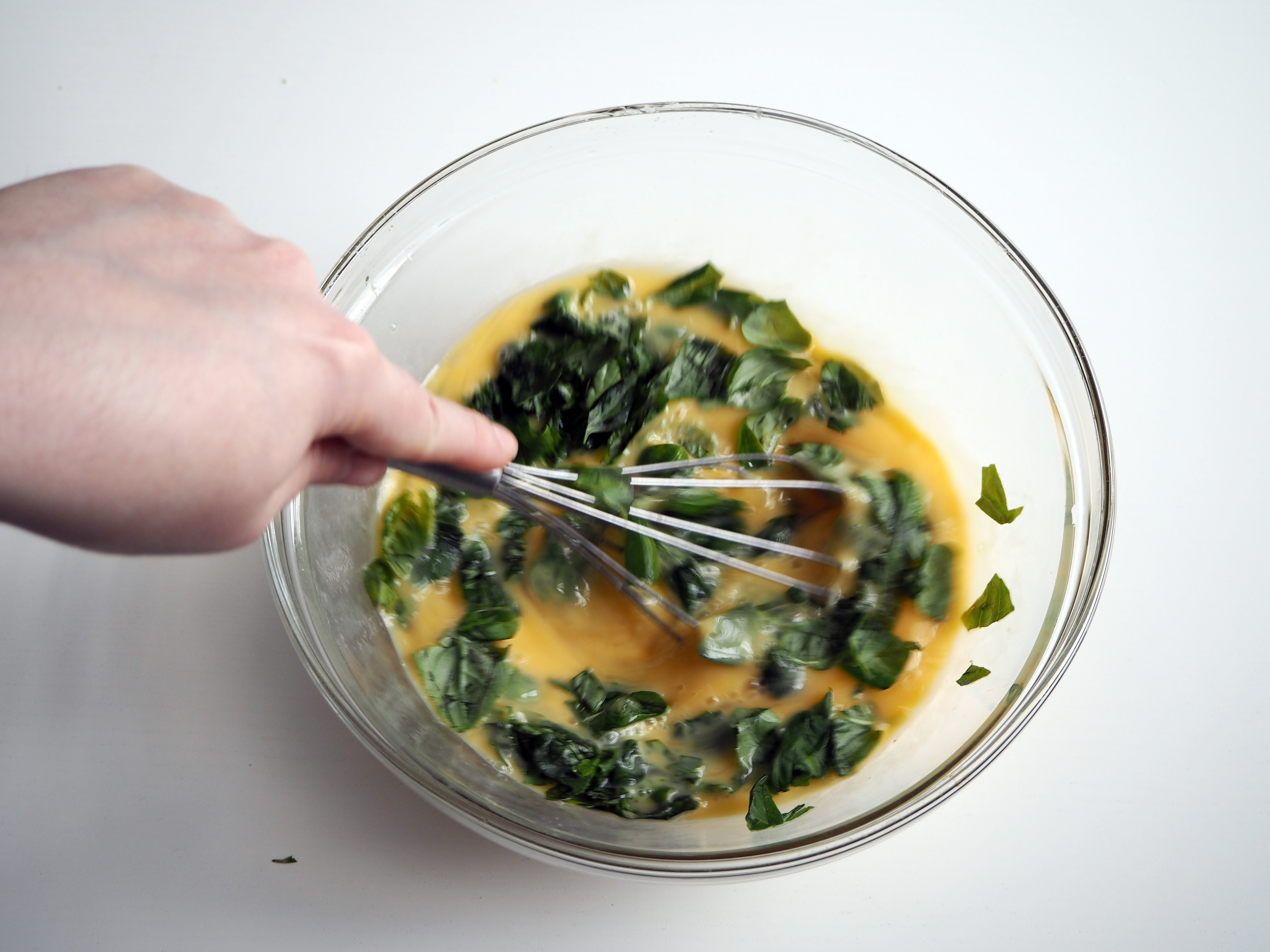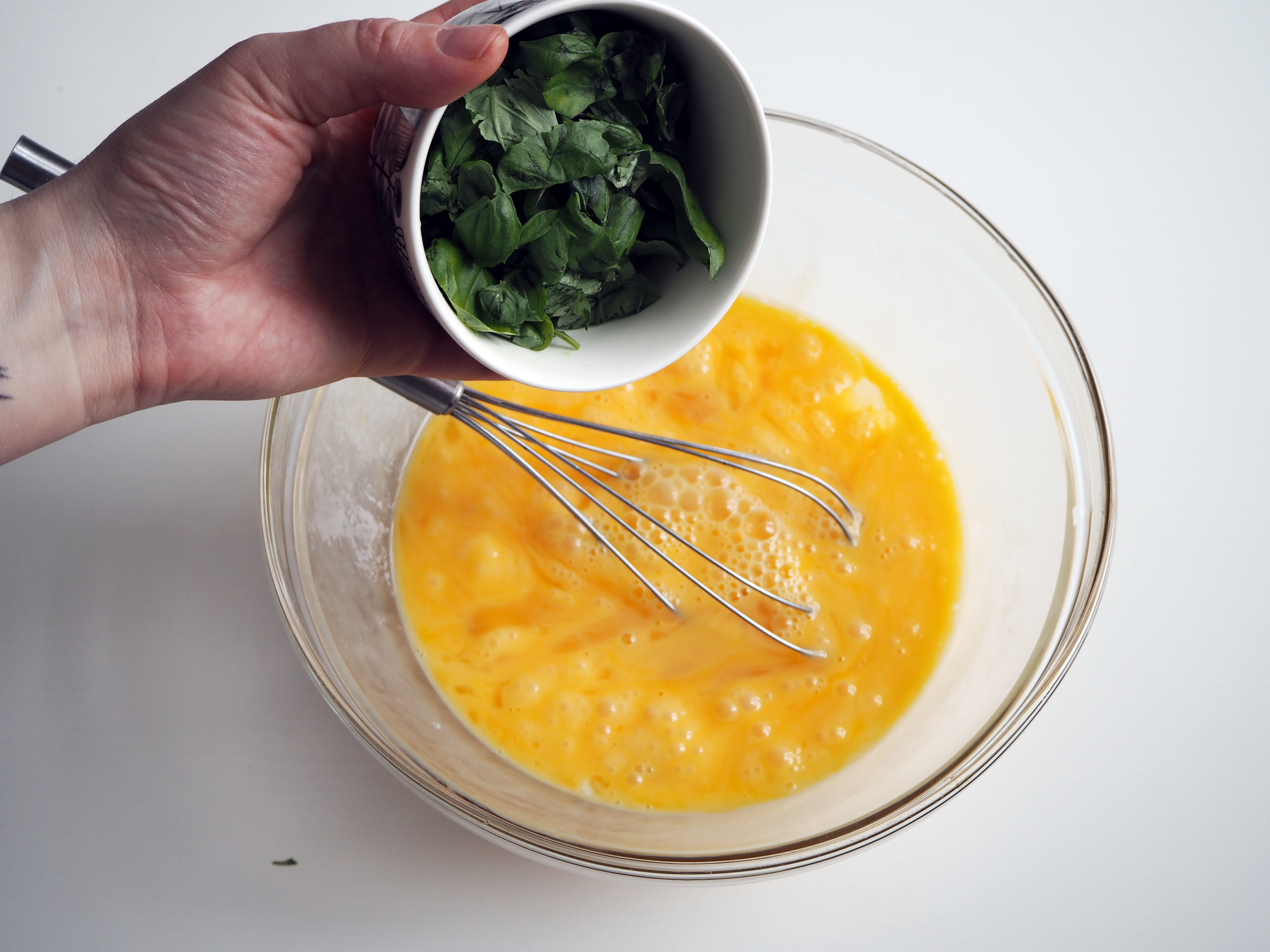 6. In another bowl, crack the egg and whisk a little. Add chopped basil and continue whisking.
