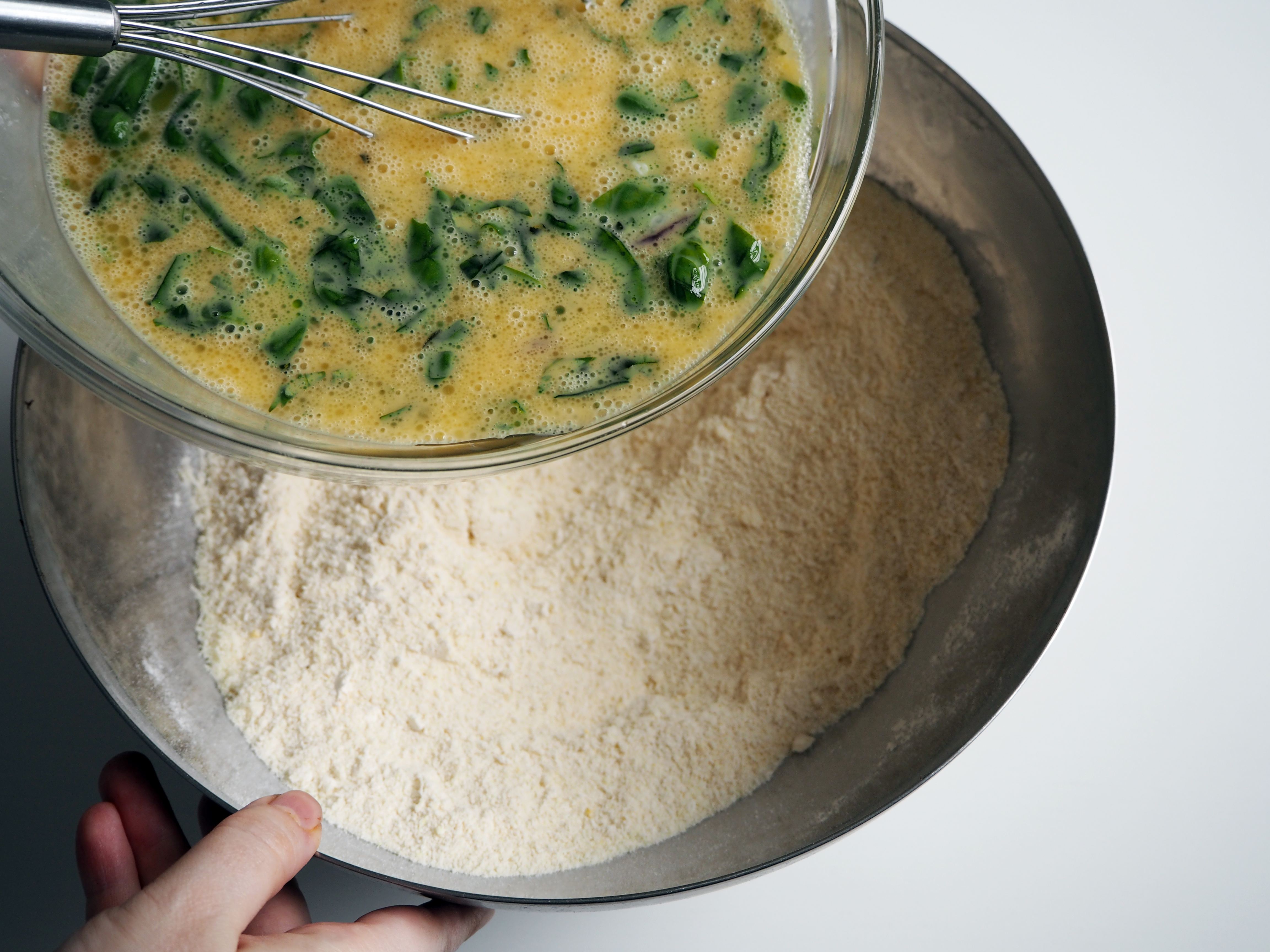 8. Add eggy mixture to dry ingredients and whisk or fold until all dry ingredients are mixed well with wet ingredients and there is no lump.