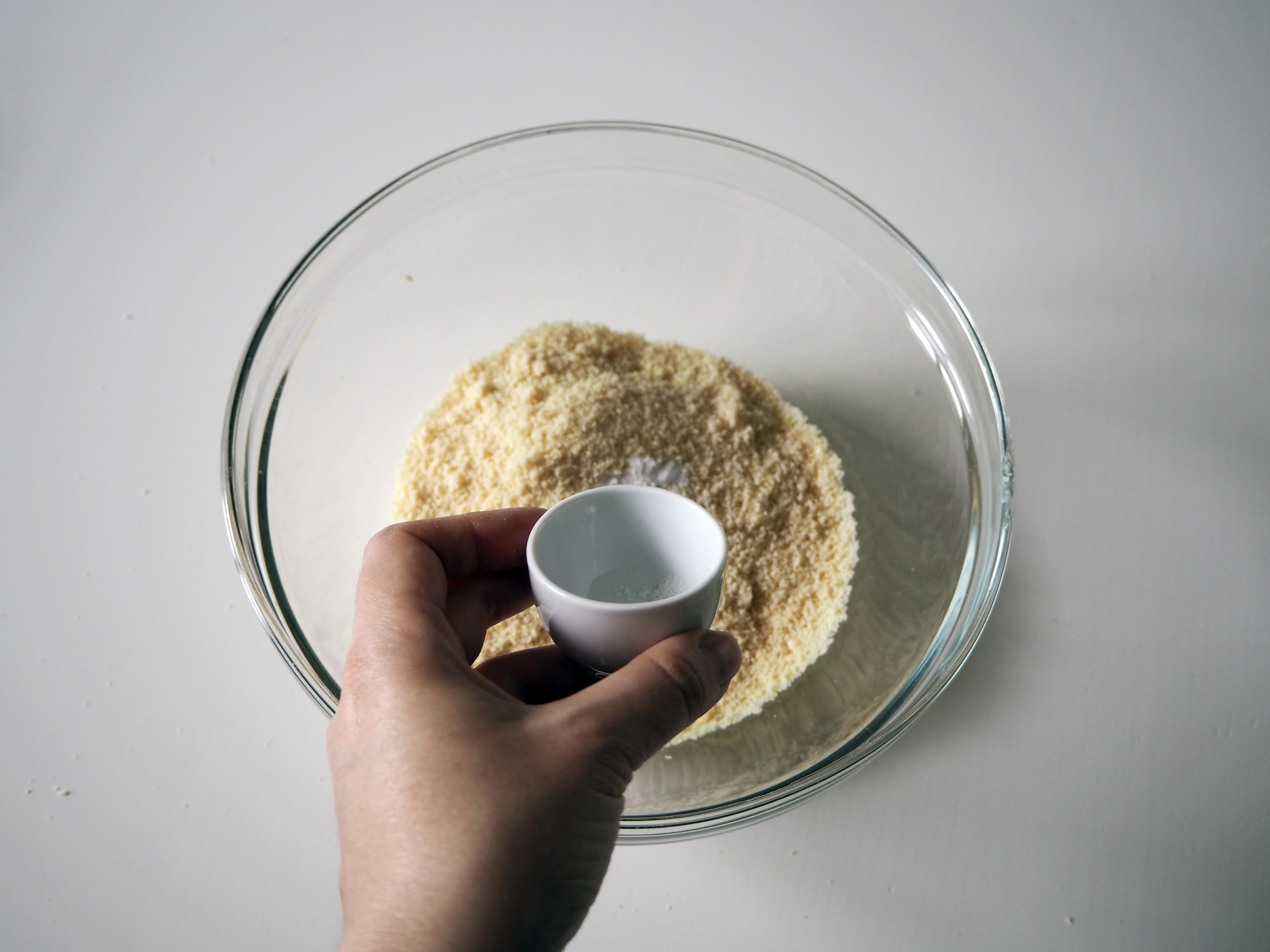 1. In a medium mixing bowl, put almond flour, baking soda, salt and vanilla sugar (forgot to take the picture of adding vanilla, sorry! If you are using vanilla extract, check step 2.). Whisk.