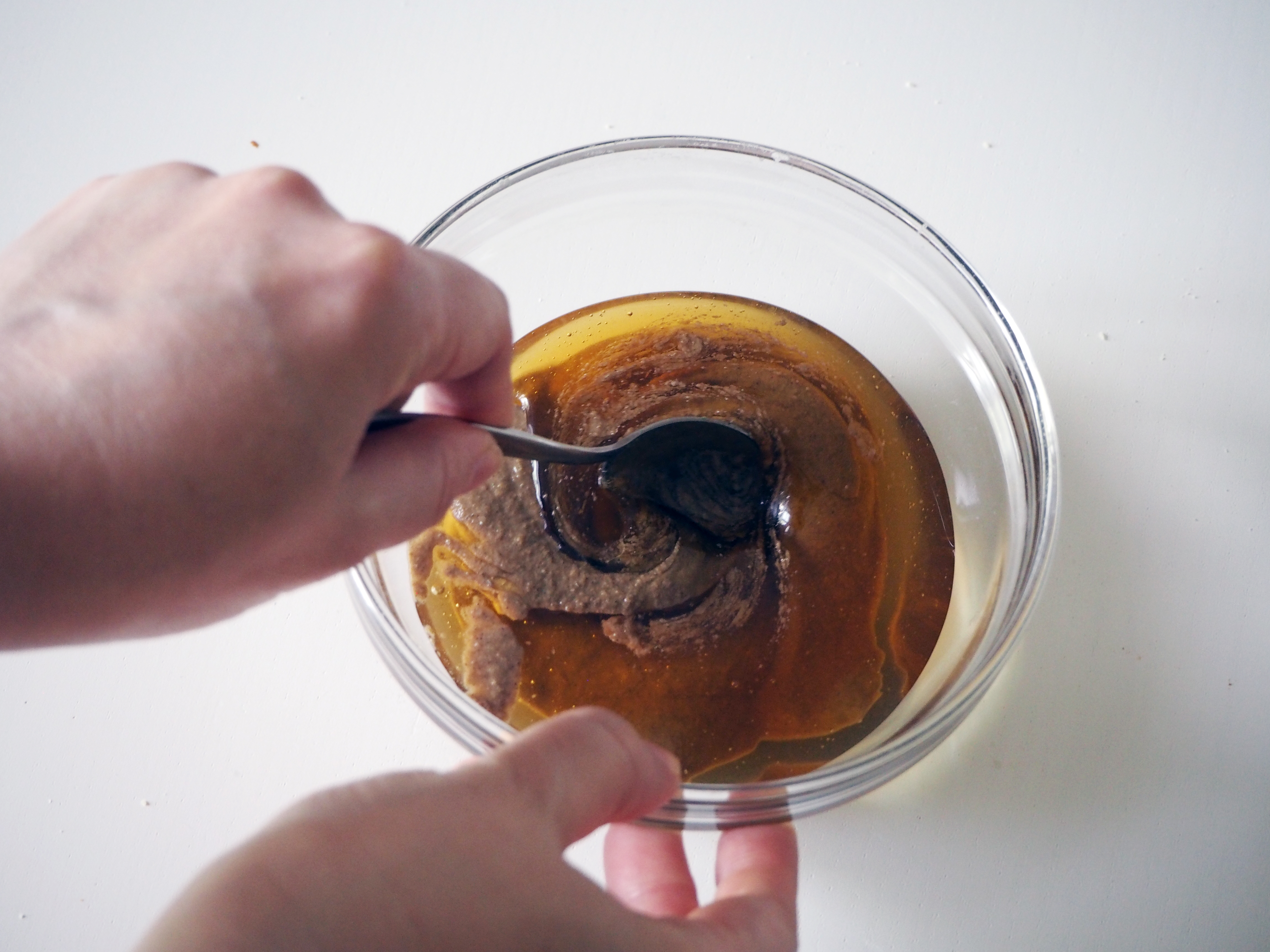 2. In a separate, smaller mixing bowl, put tahini and honey (and vanilla extract, if you are using this instead of vanilla sugar) and mix until they are smoothly incorporated.
