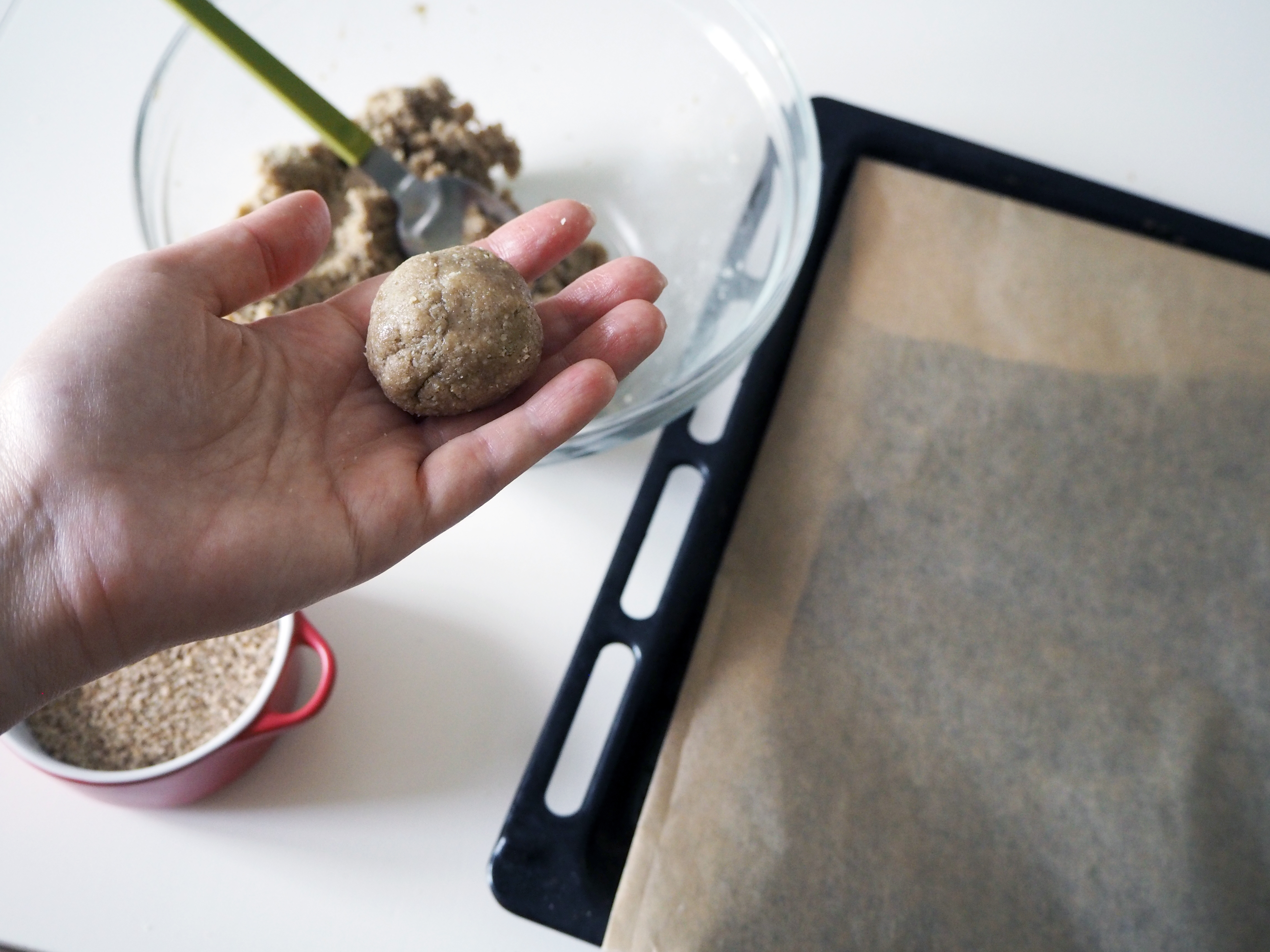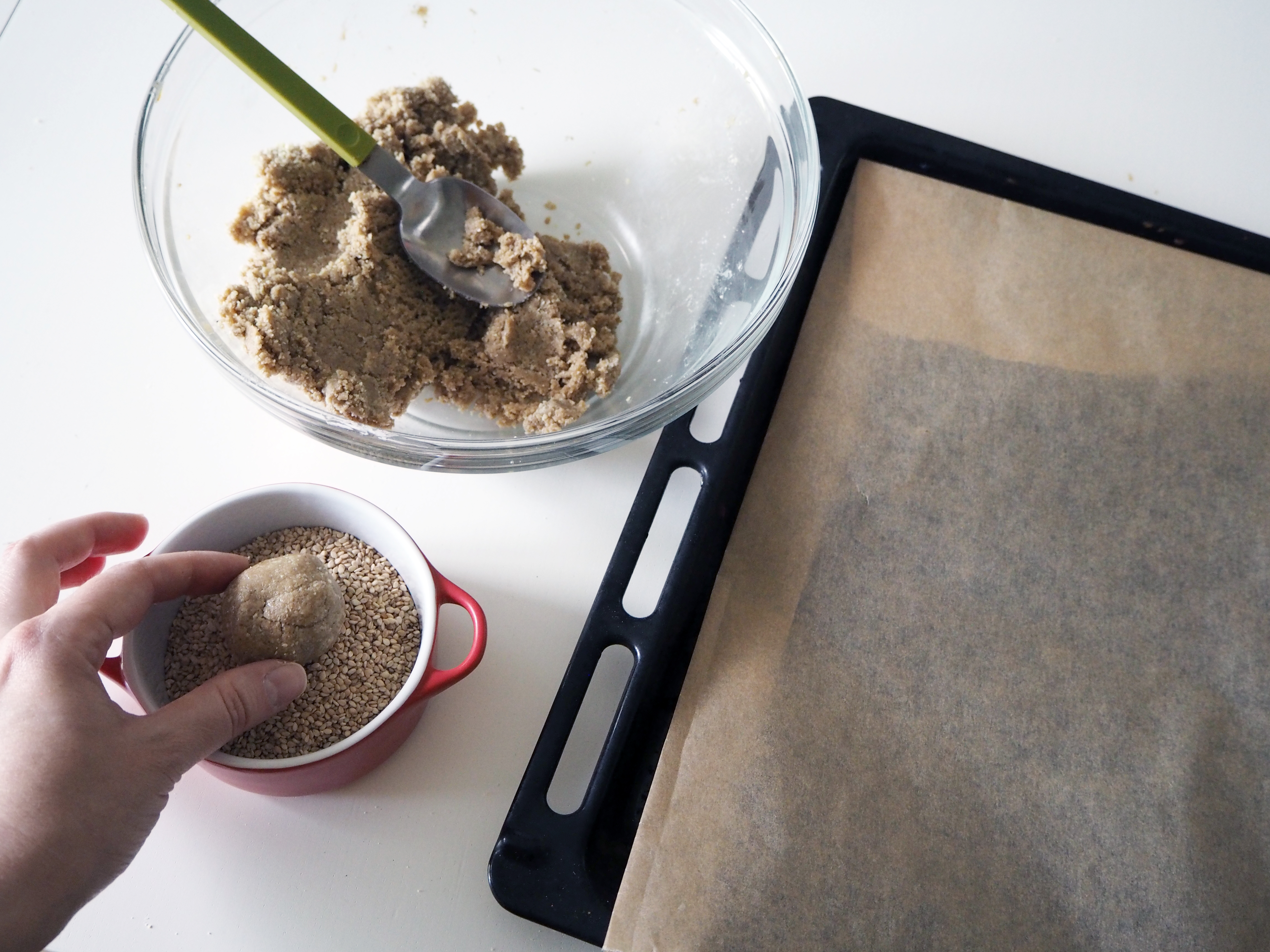 4. Make balls of 20 gr. / about 1 tbsp each. Roll these balls in sesame seeds to cover them with seeds as much as possible. Put sesame covered balls on a baking sheet with baking paper on and press gently to make them rather flat. Put these in the fridge to chill for at least 30 minutes, up to 2 hours.