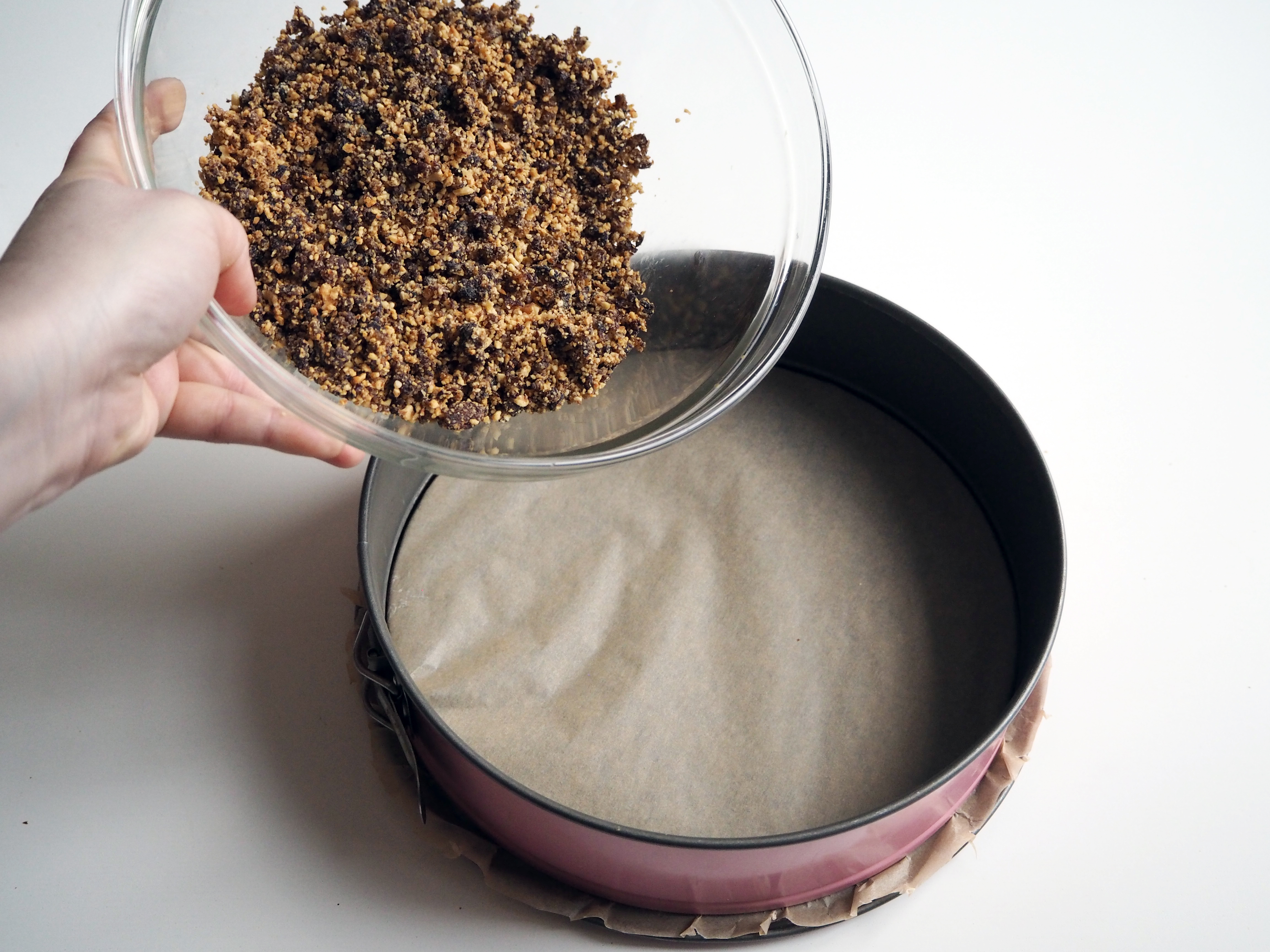 2. Put a baking paper at the base of a cake mould / pan (so that it is easier to take the cake out later). For raw cake I always use springform cake pan because i find it easier to remove the cake from this pan later. Press the paste-like base ingredients at the base of the pan. Put in the fridge while preparing the rest.