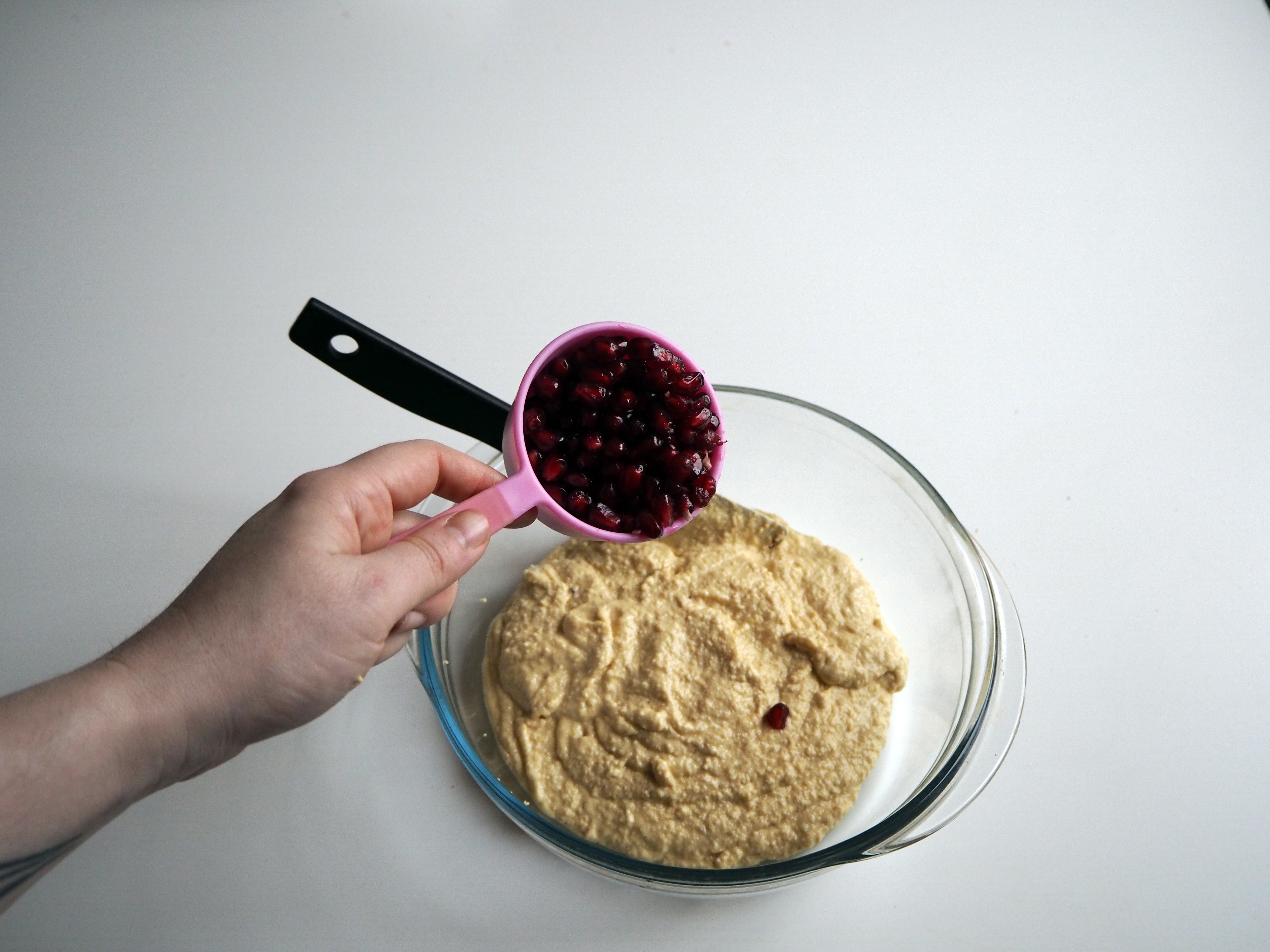 4. Transfer the creamy mixture to another bowl (or you can also do it in the processor if you like), and fold in half of the pomegranate seeds in the cream (if you want to put more seeds, just do it! But leave a little bit of seeds to garnish in any case..).