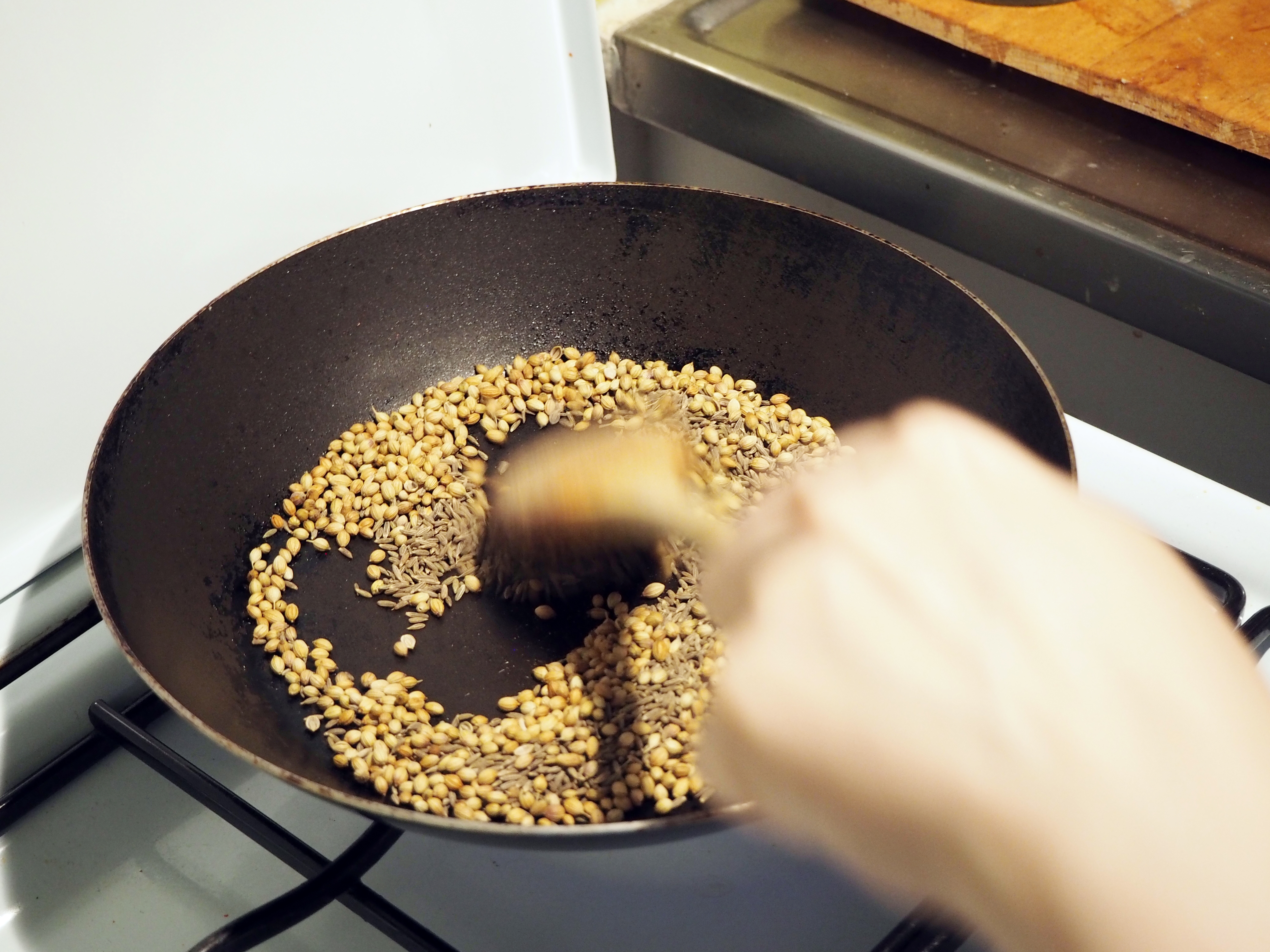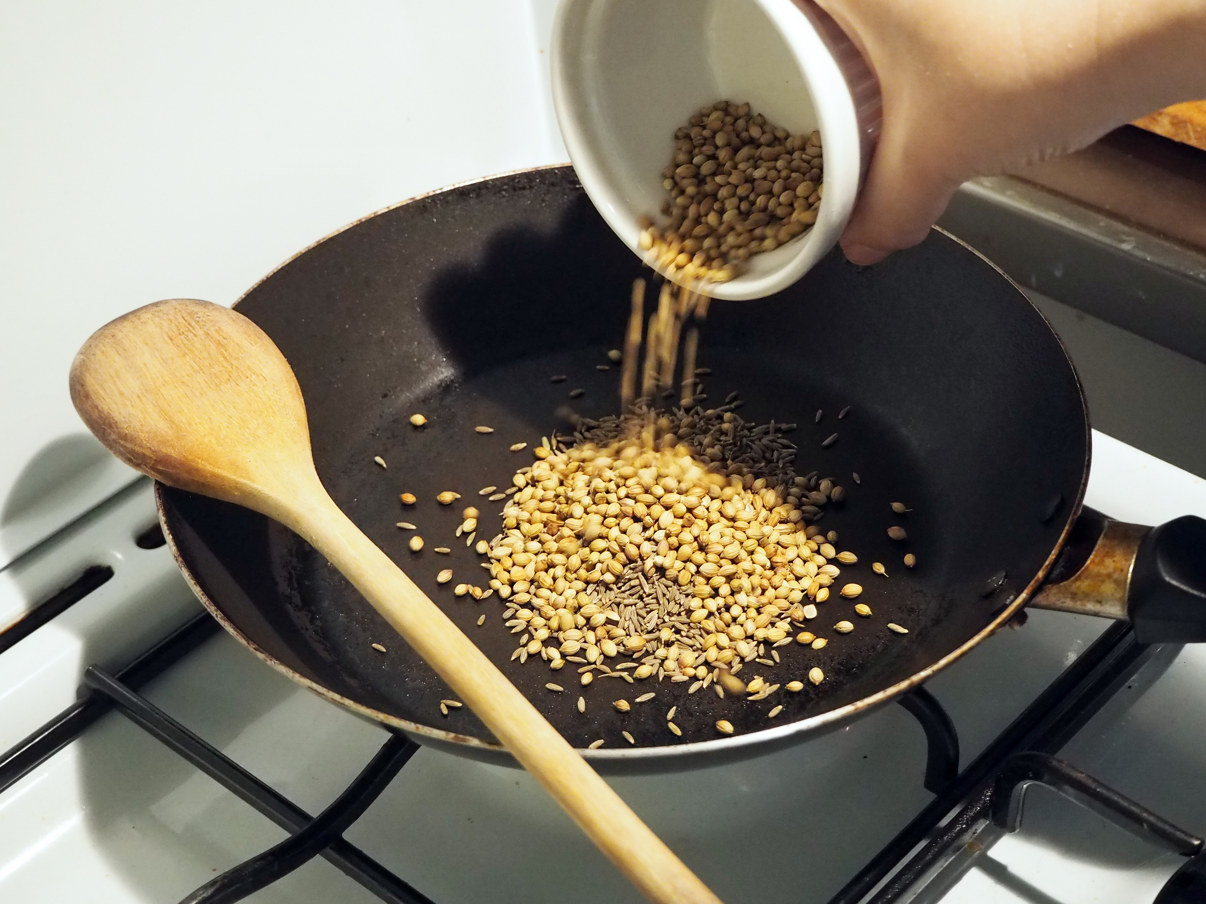 1. In a medium pan, on medium heat, put coriander and cumin seeds and roast them for a couple of minutes, constantly stirring. Put aside to cool down a bit.