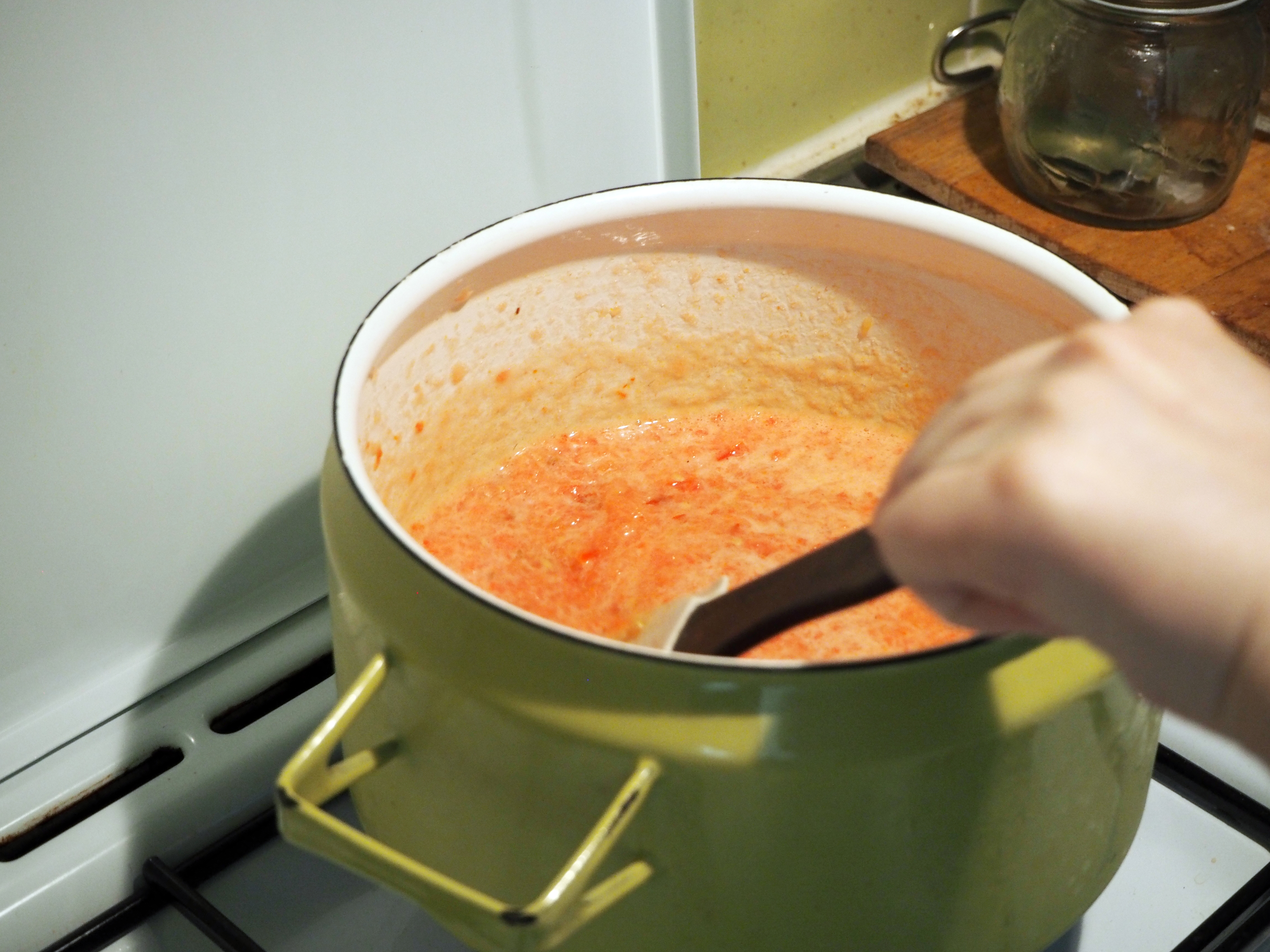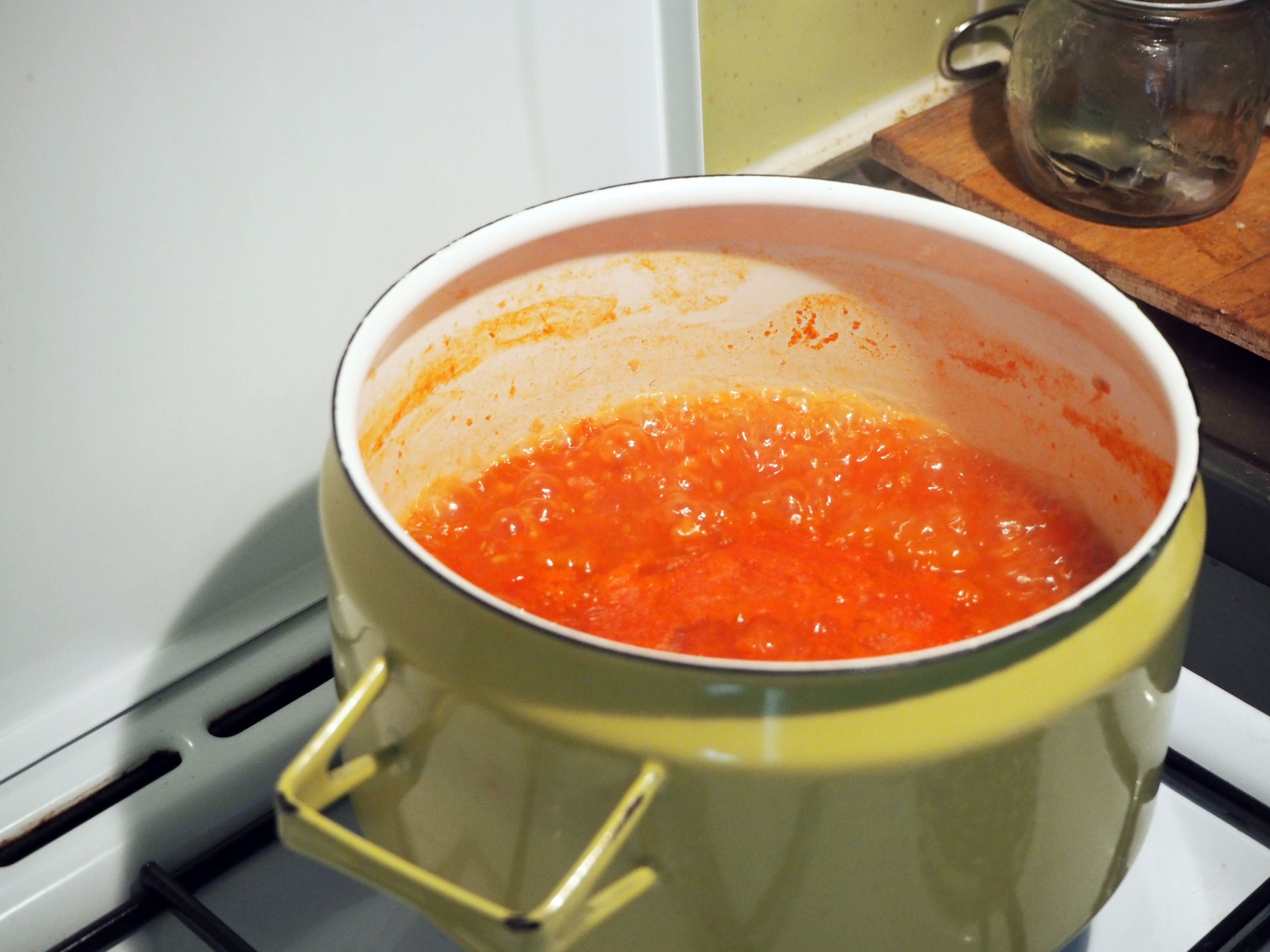 I had heard about “tomato jam” before, but I had never eaten it until I made it myself. I love tomato in any form and I eat it every day. So the idea of jam was pretty intriguing and I had to try it. I had only made jam once before, a slightly hot blueberry jam (https://mydearkitcheninhelsinki.com/2014/01/20/blueberry-lemon-and-chili-jam-my-first-jam/) so you can see that I like adding a bit of twist in the jam!