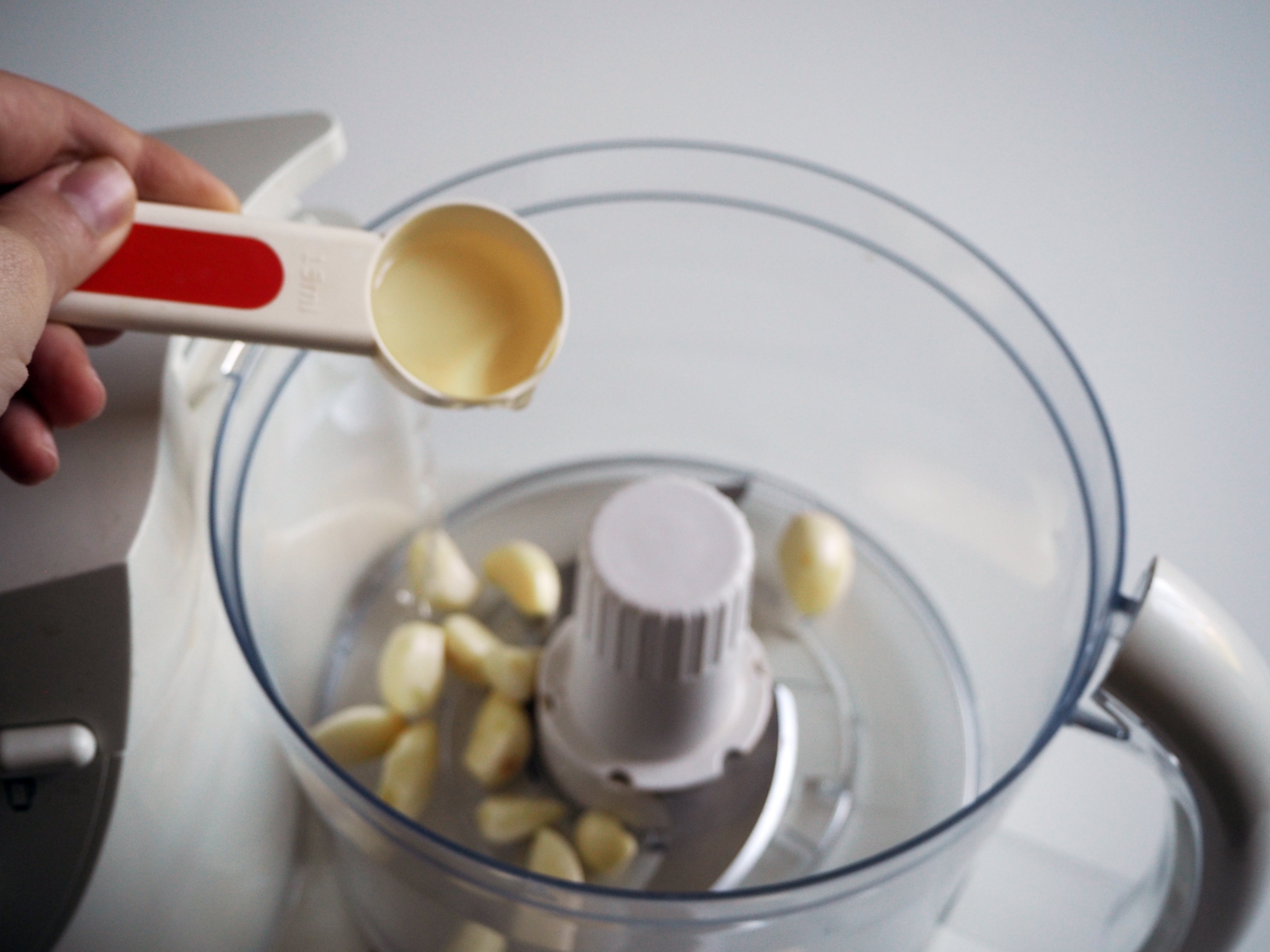 4. In a food processor, put garlic cloves and 2 tbsp of the water from soaked red chilies, and beat them a little.