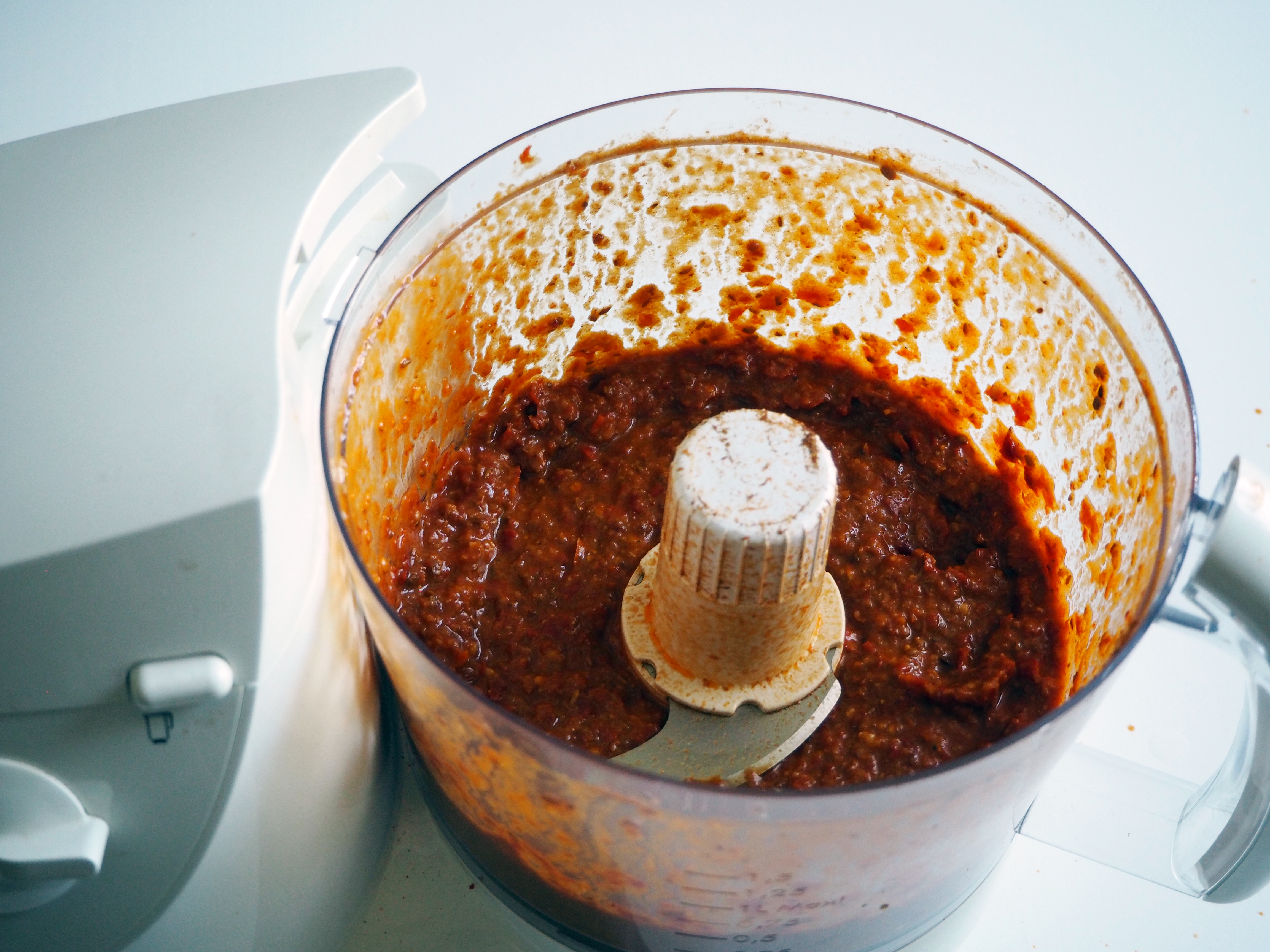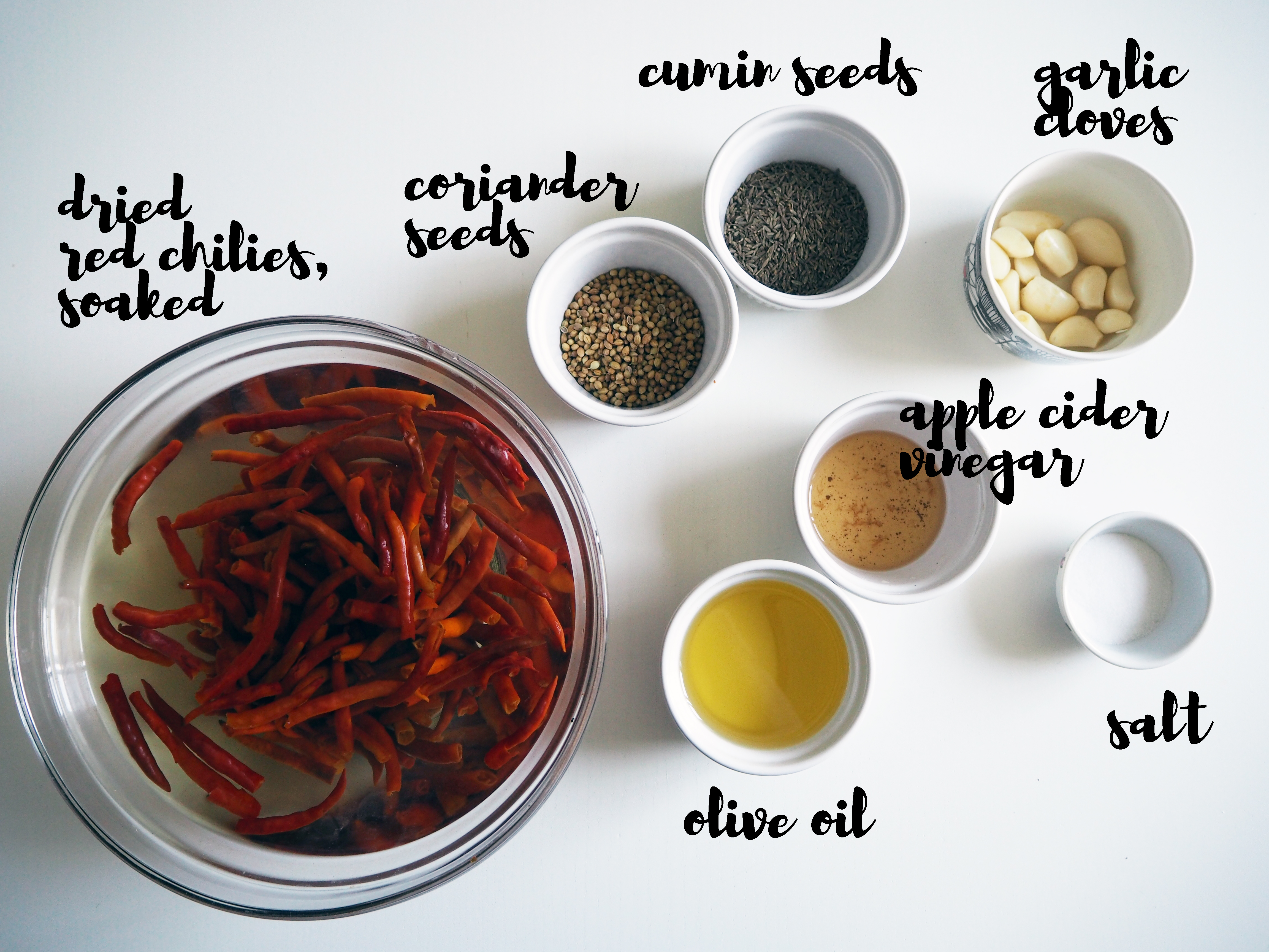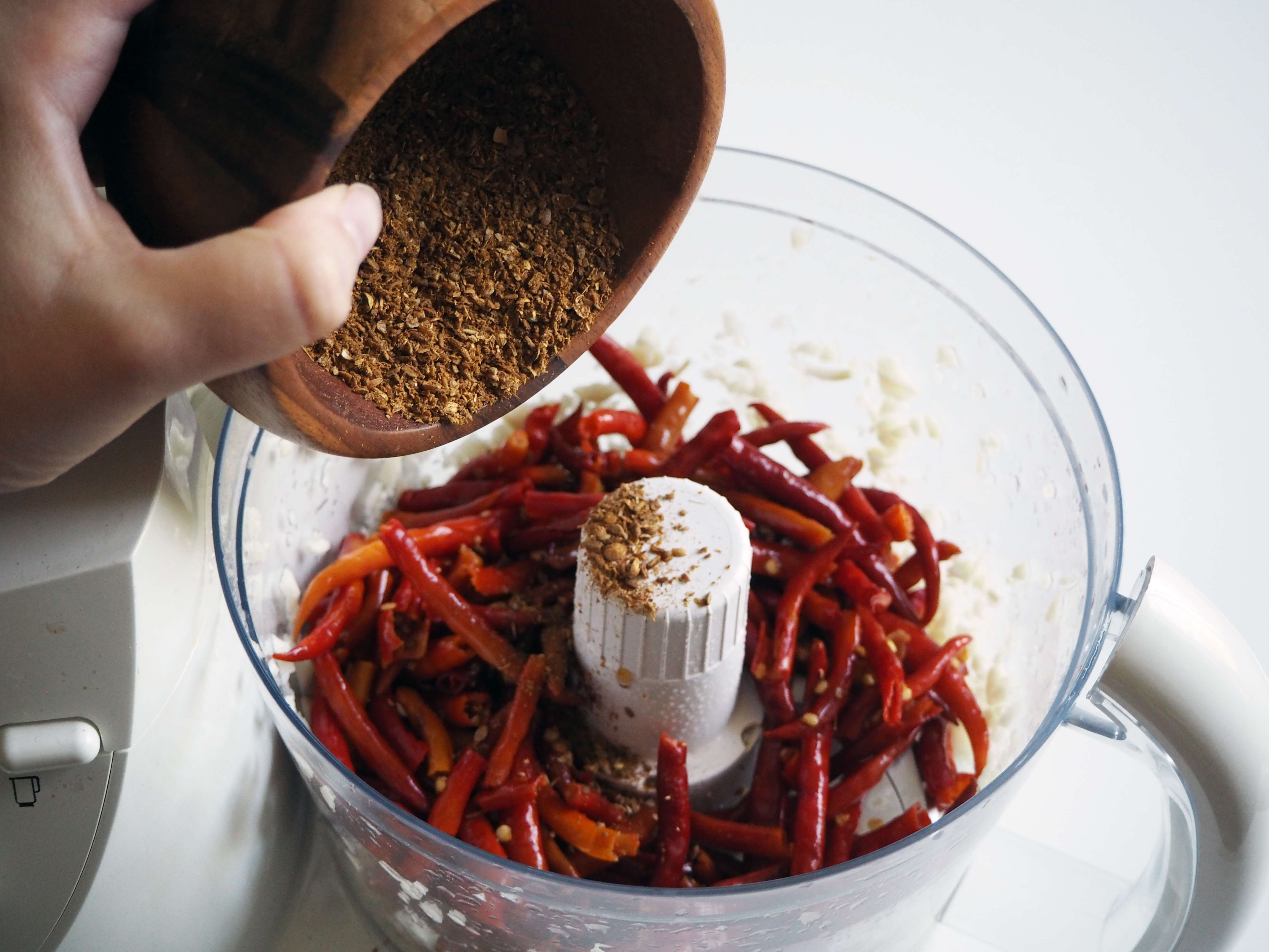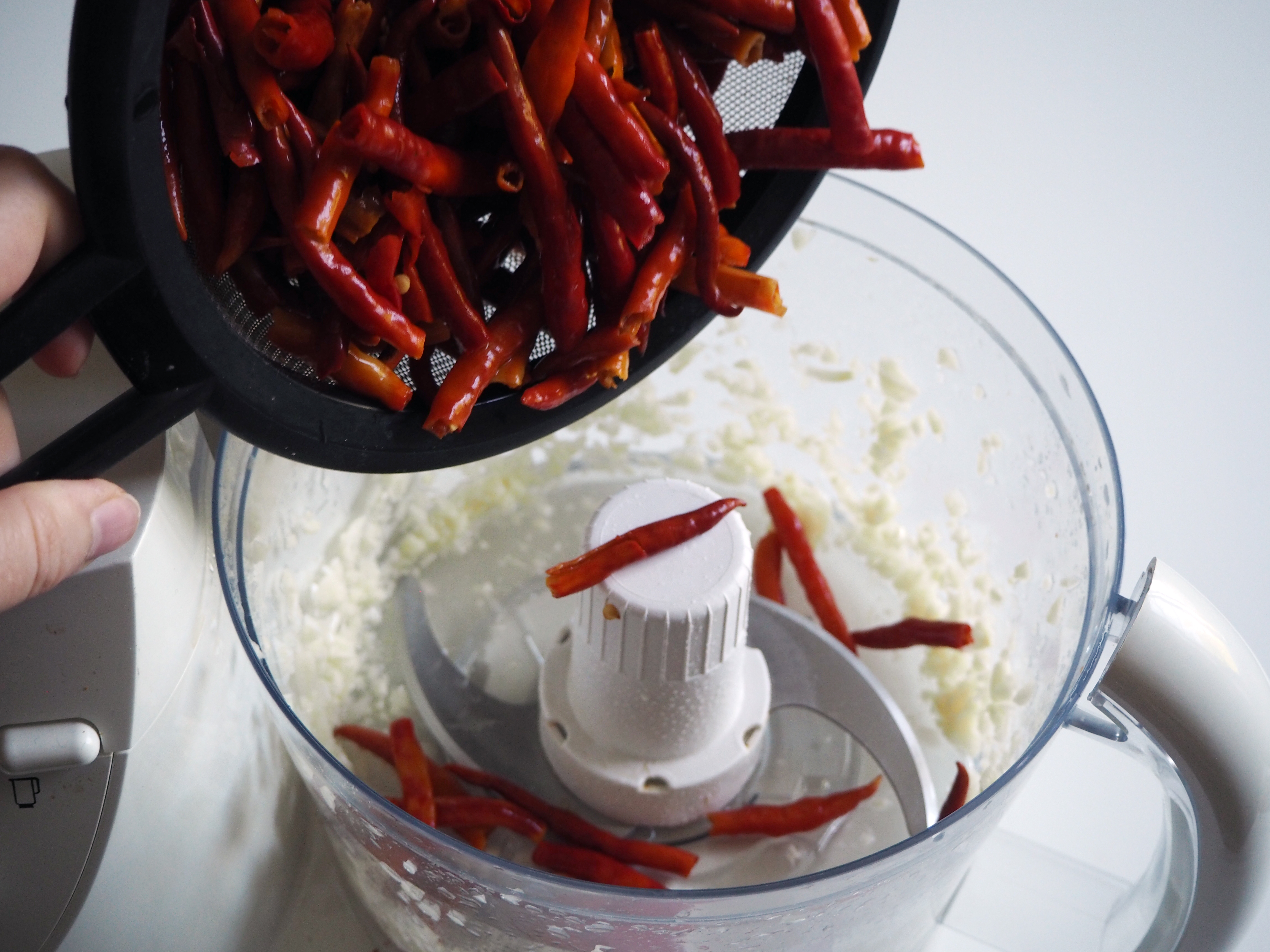 60 gr. dried red chilies, seeds taken out, soaked in boiling water for 24 hours (change the water a few times and fill in each time with new boiling water. I did this 4 times. Cover all the chilies with water and it will be enough.)