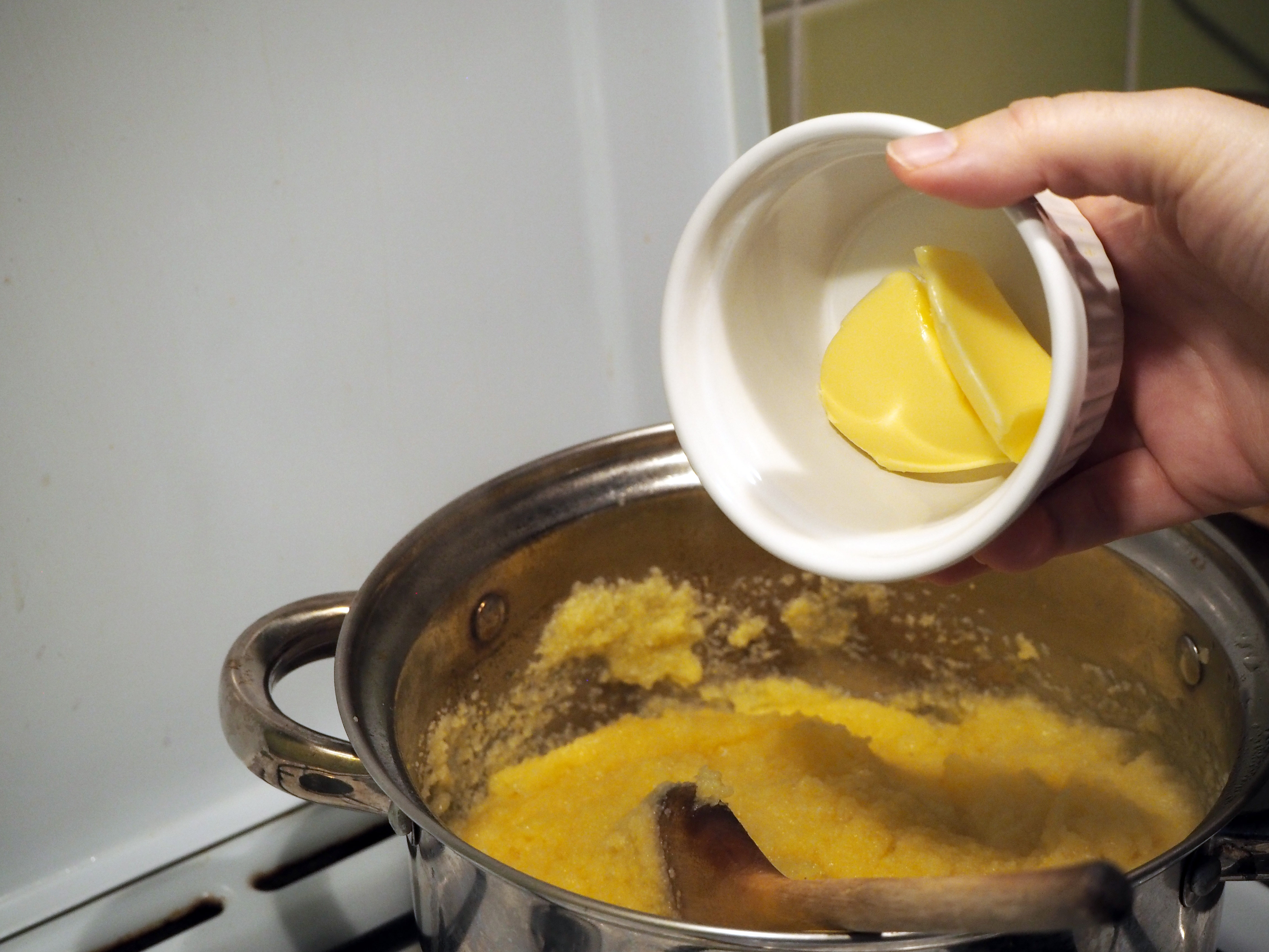 11. When polenta is cooked, add butter and stir a bit, letting the butter melt into it. When all butter melts, take the pan from the heat and let it sit for about 5 minutes, then serve. You can put polenta and chicken side by side or chicken on top of polenta as I did.