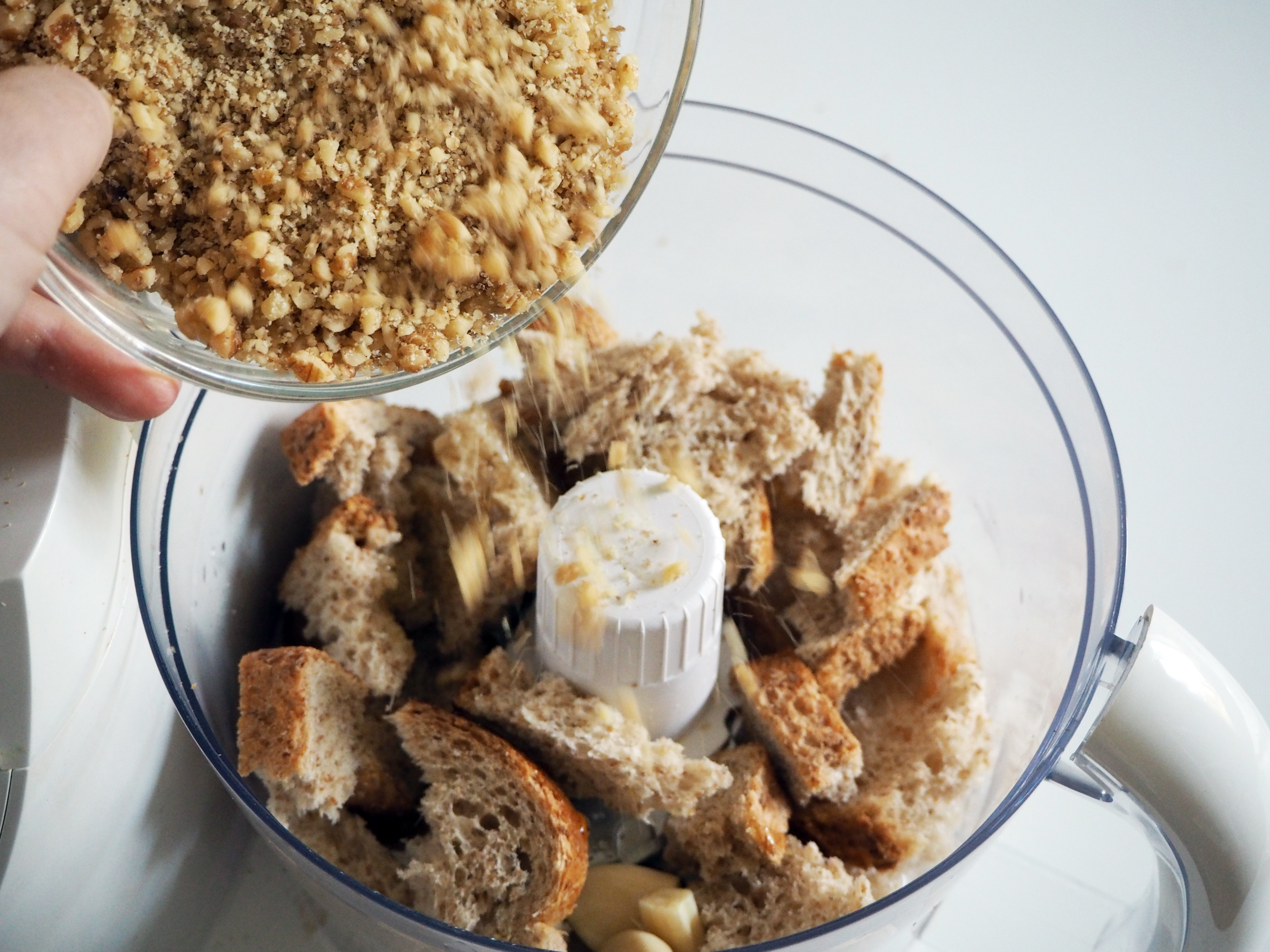 3. Prepare the sauce, while chicken is cooling. Put 2 cups of the water from boiling chicken in a food processor. Add bread (break it down into smaller pieces), garlic cloves, olive oil and walnuts and process until the ingredients are well combined. It is not going to be a smooth sauce, it will be thick and it will have a texture.